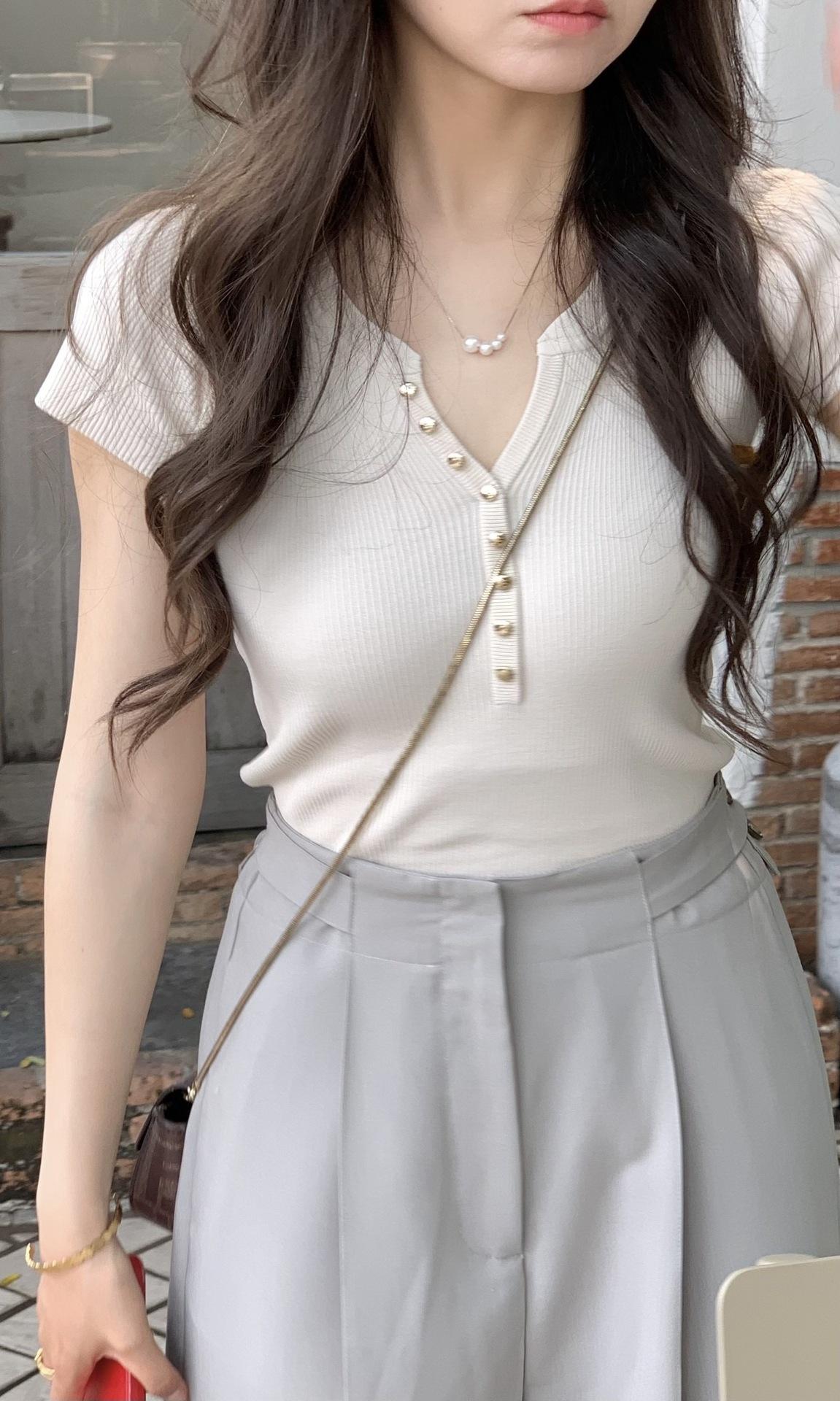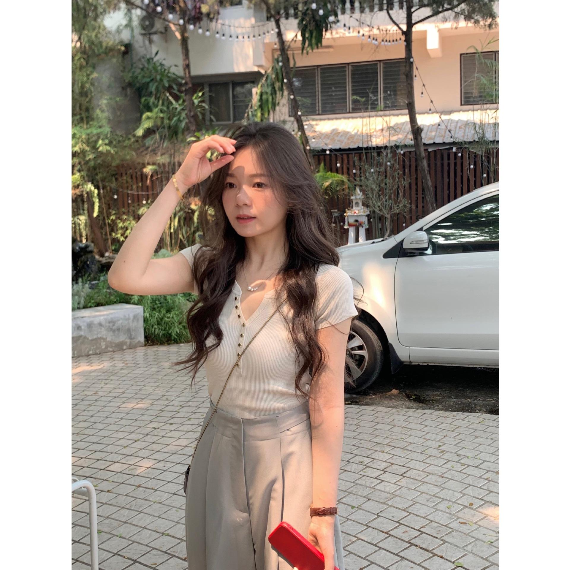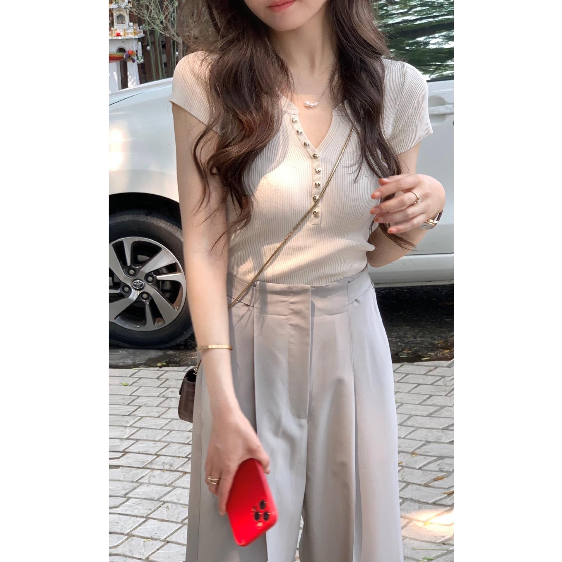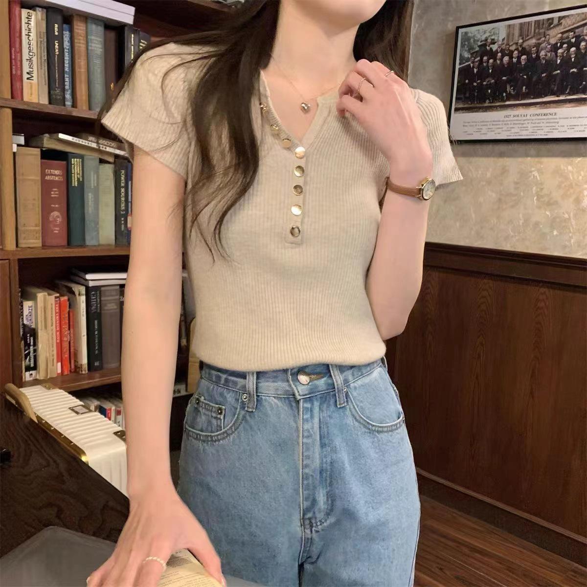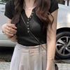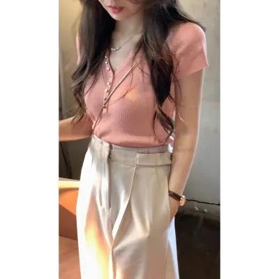 Playera de Punto de Seda Helada con Cuello en V y Manga Corta para Mujer en Verano Diseño Delgado Ajuste Entallado Hombro Derecho Corta Top Dulce y Picante para Personas Pequeñas