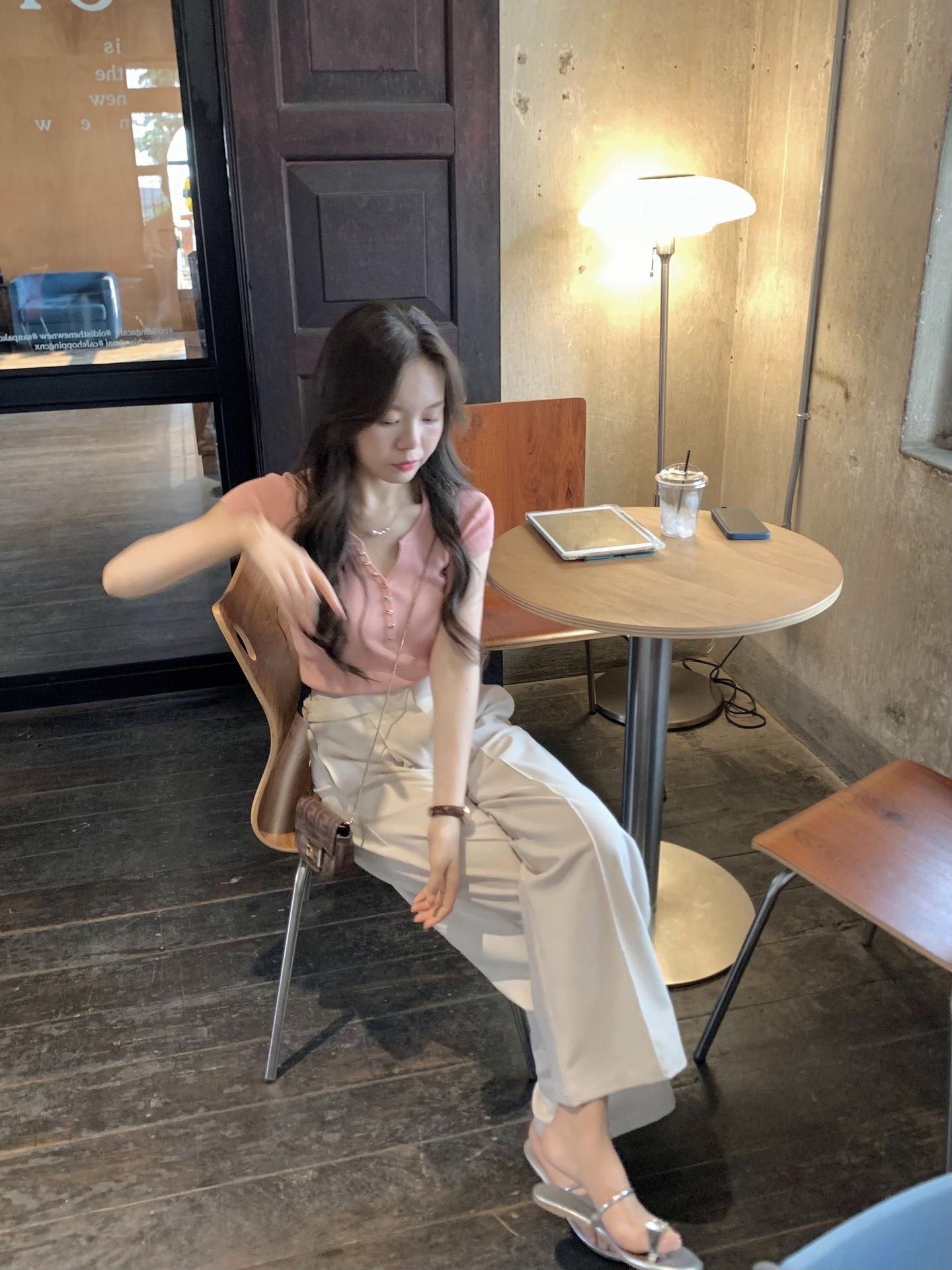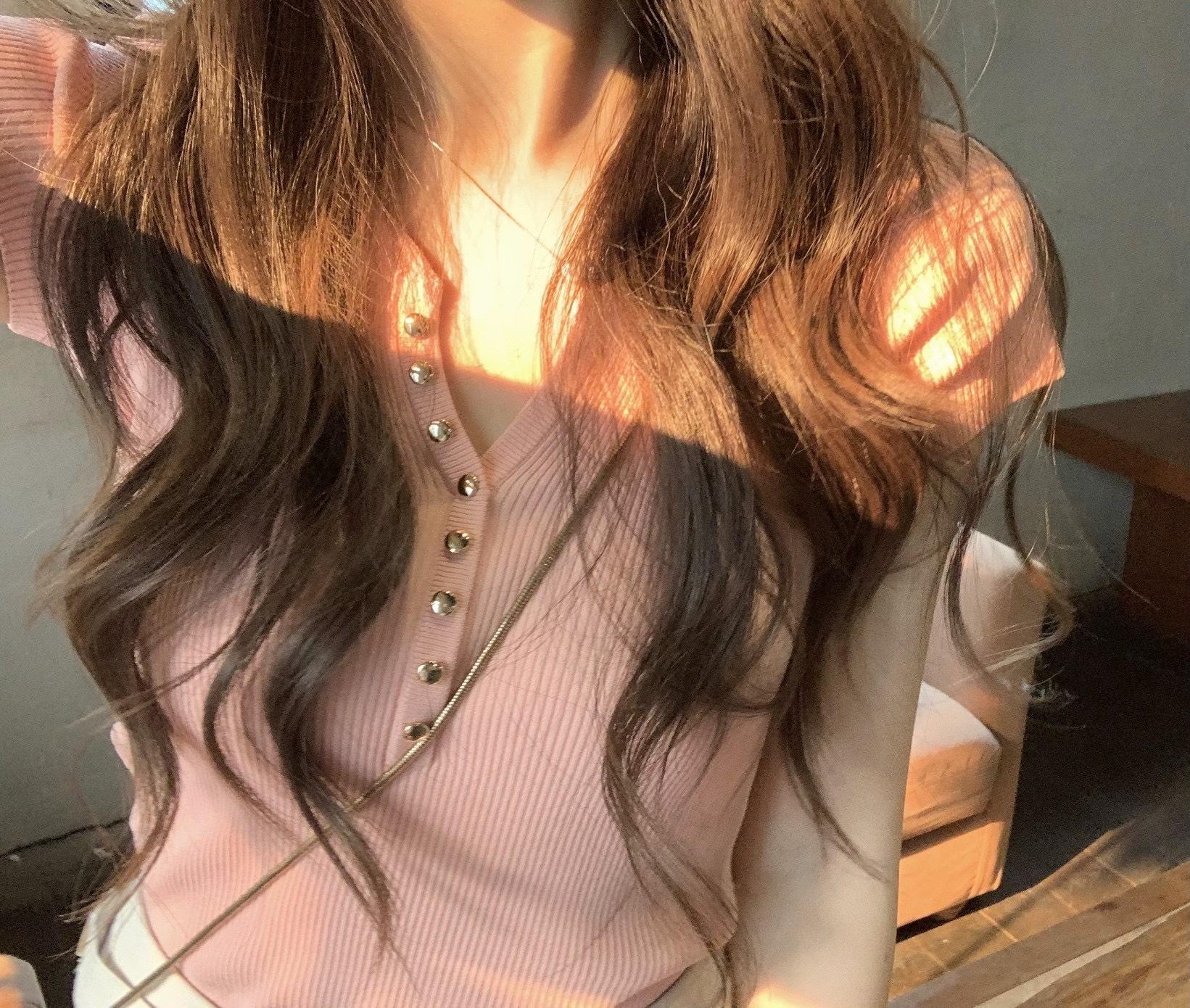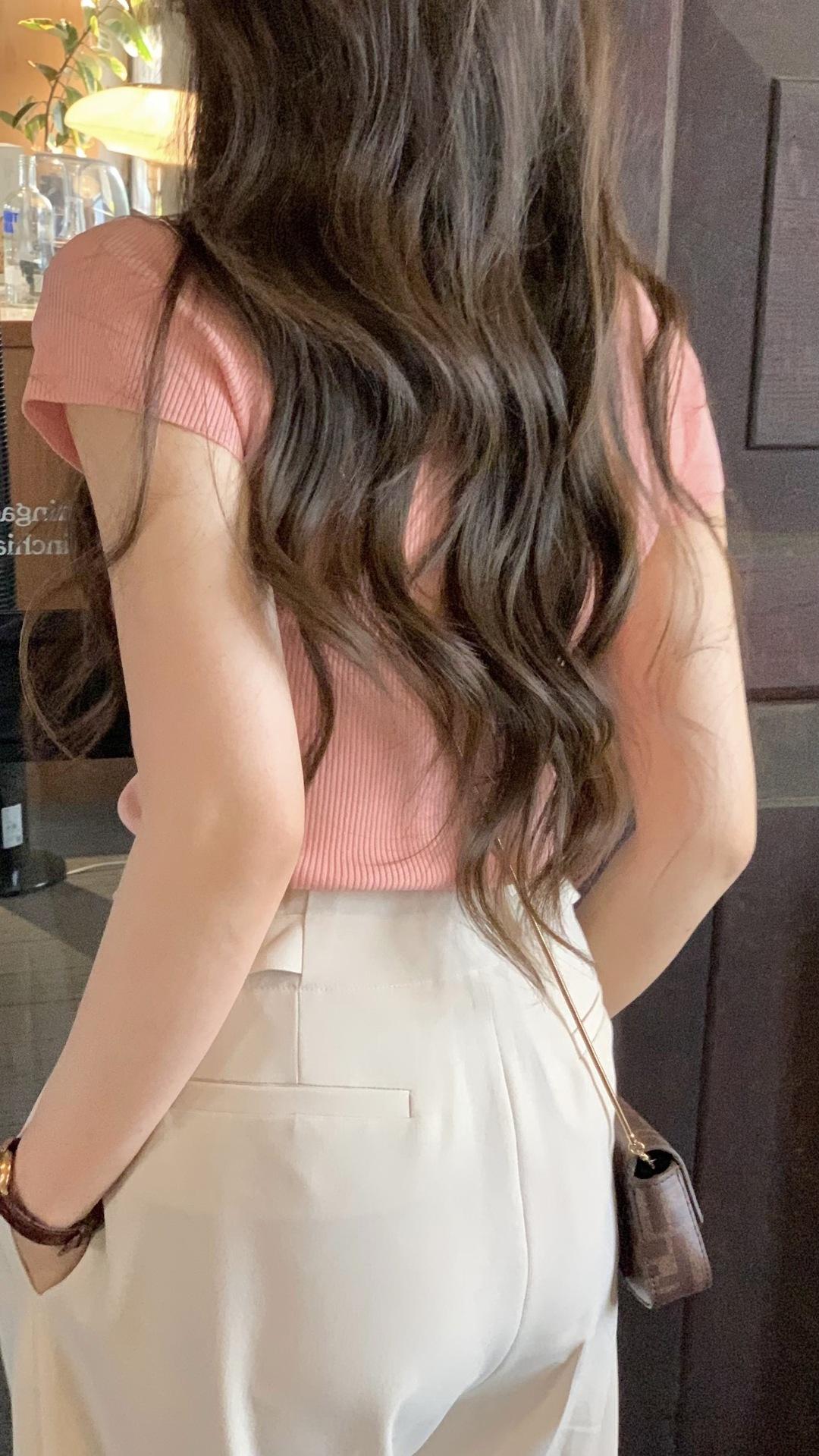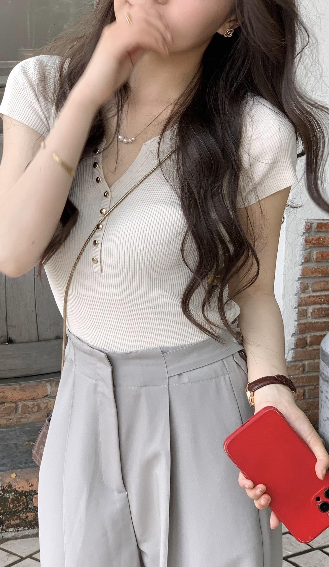 Playera de Punto de Seda Helada con Cuello en V y Manga Corta para Mujer en Verano Diseño Delgado Ajuste Entallado Hombro Derecho Corta Top Dulce y Picante para Personas Pequeñas