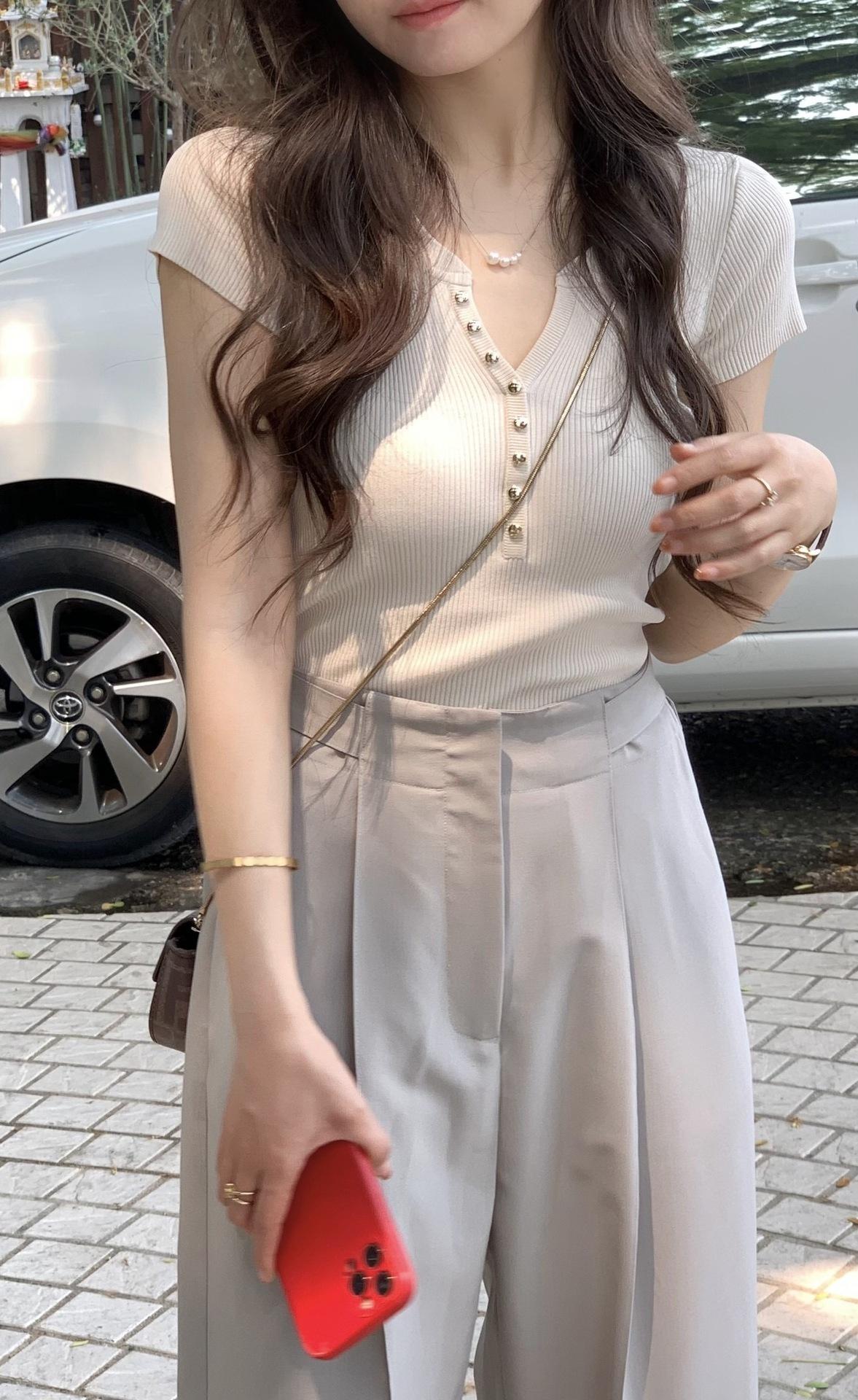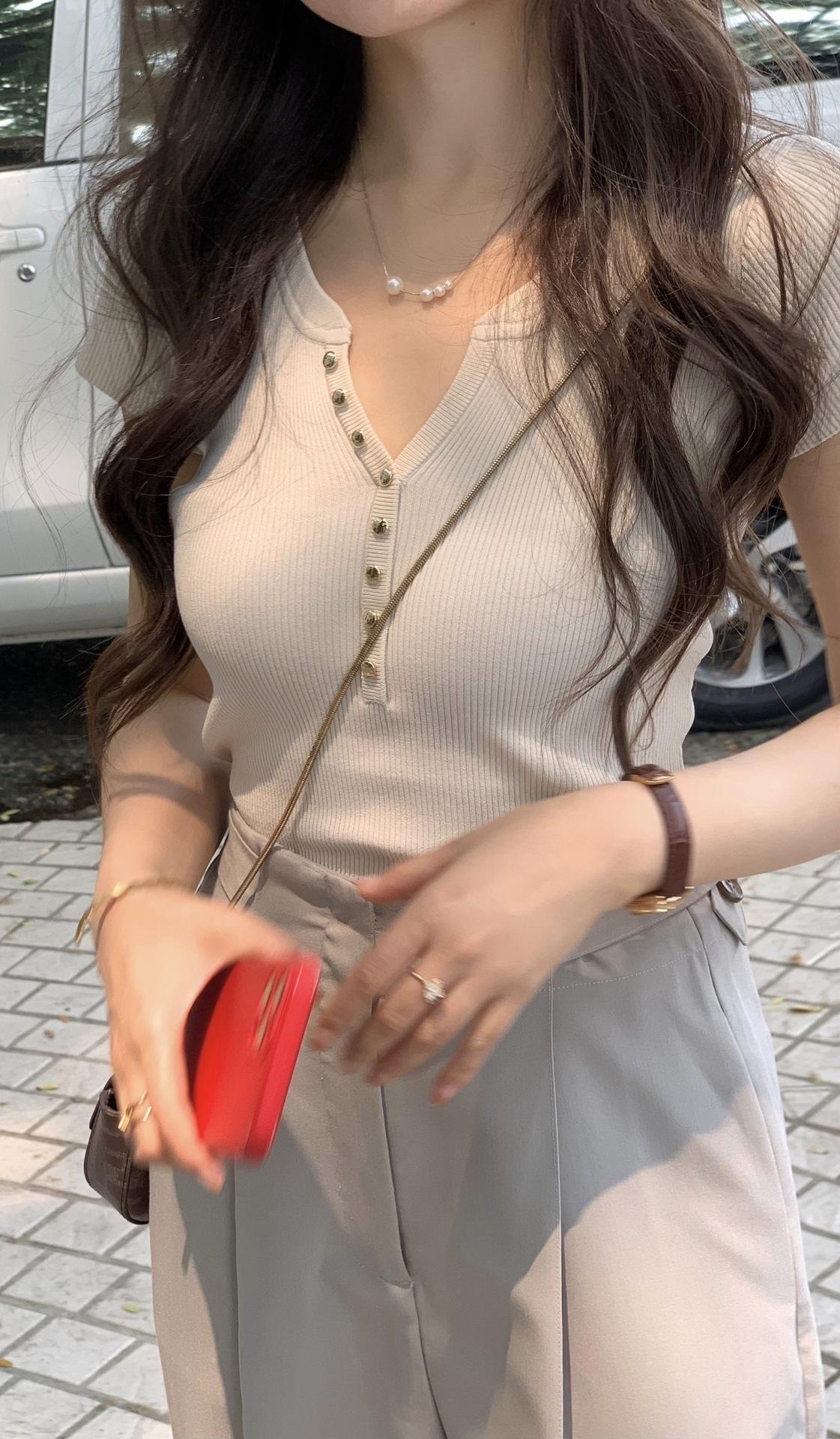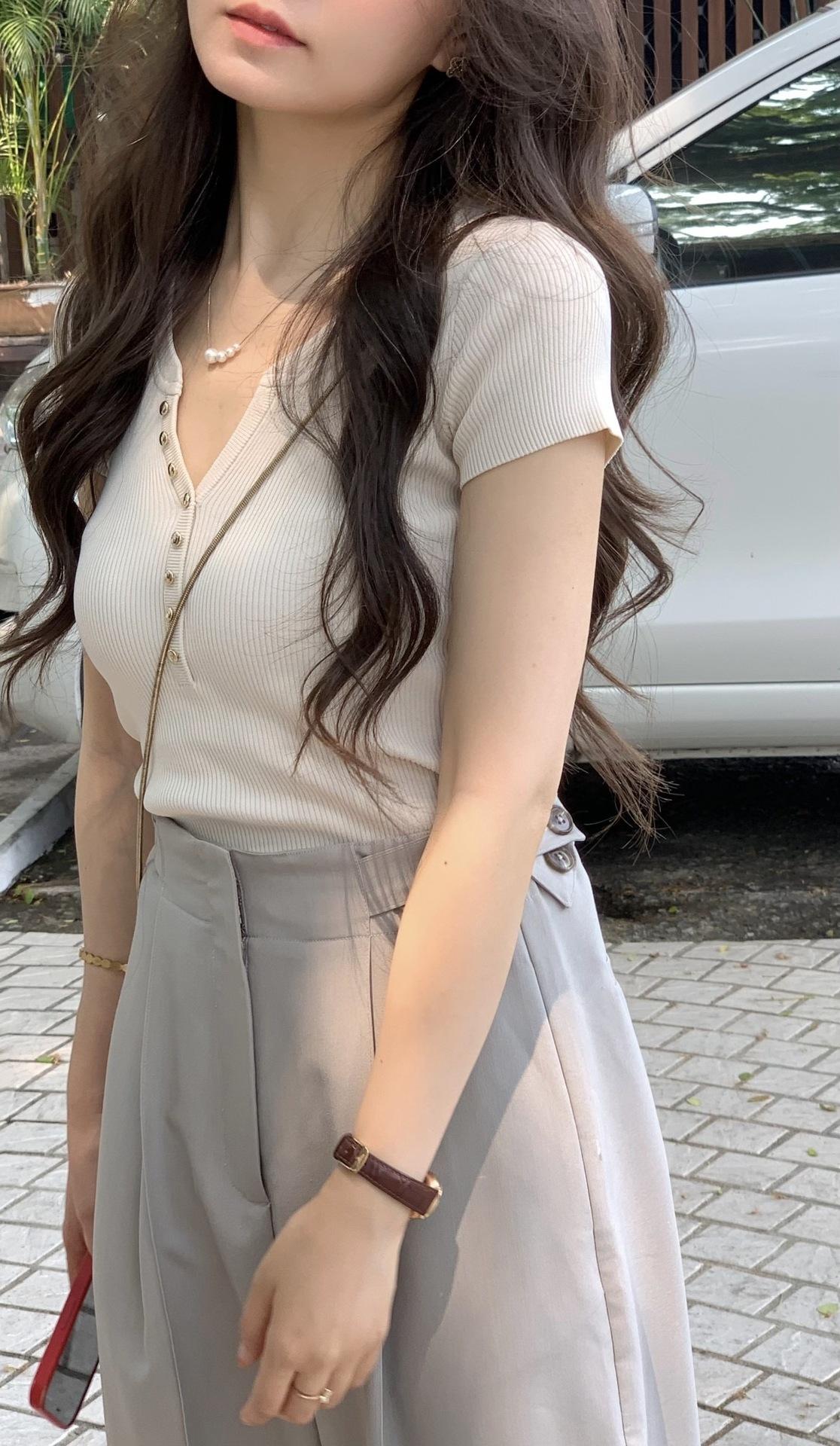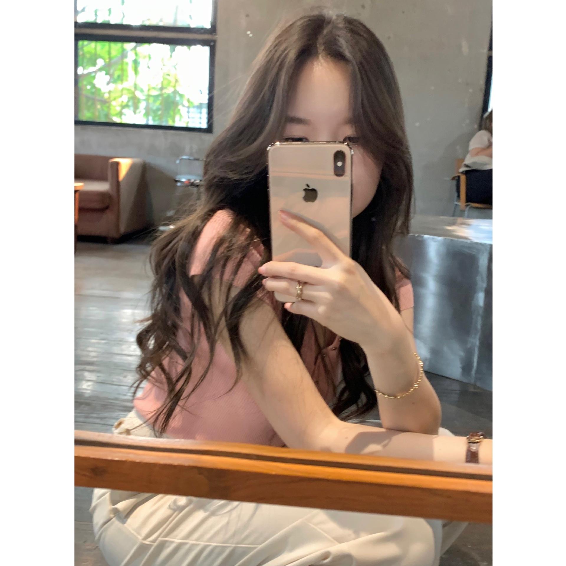 Playera de Punto de Seda Helada con Cuello en V y Manga Corta para Mujer en Verano Diseño Delgado Ajuste Entallado Hombro Derecho Corta Top Dulce y Picante para Personas Pequeñas