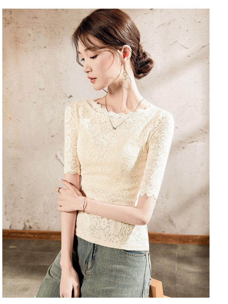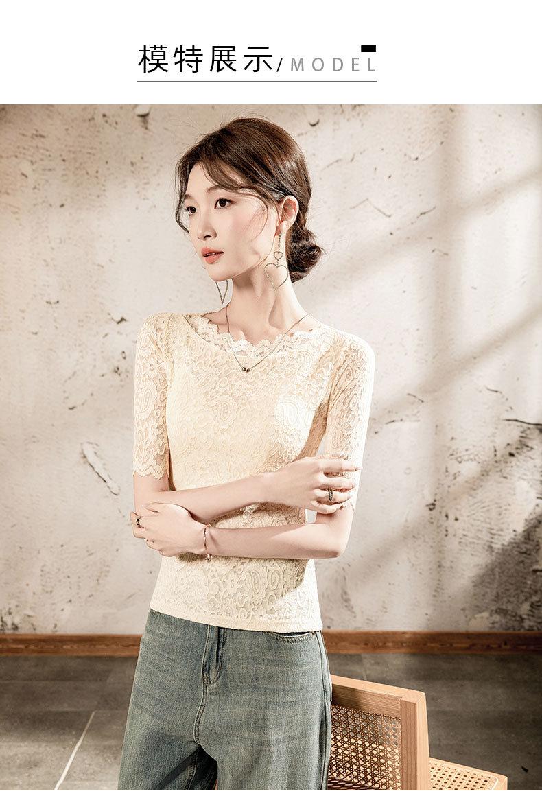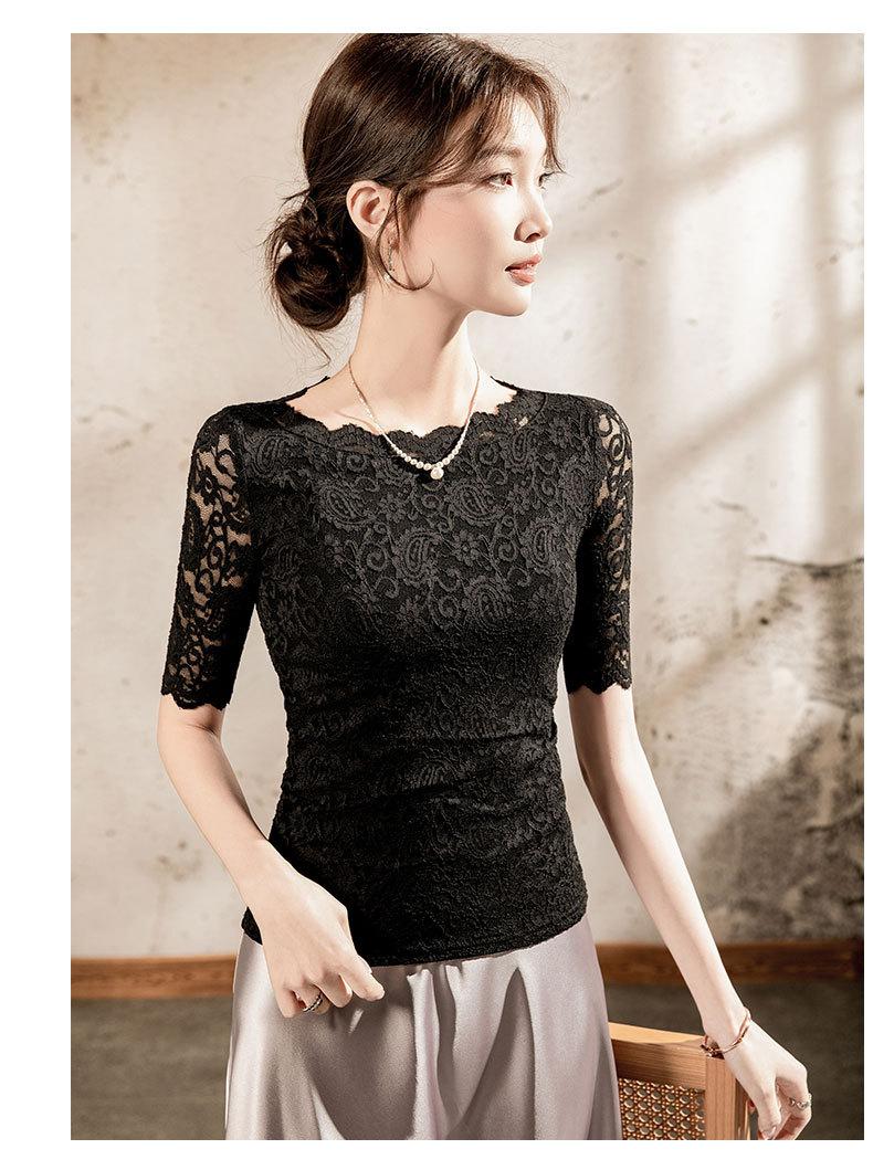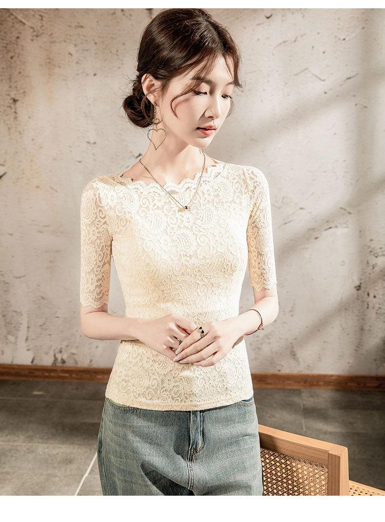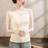 Top de Manga Corta para Mujer Primavera y Verano 2025 Top de Manga Corta Ajustado de Color Sólido para Mujer con Cuello de Encaje