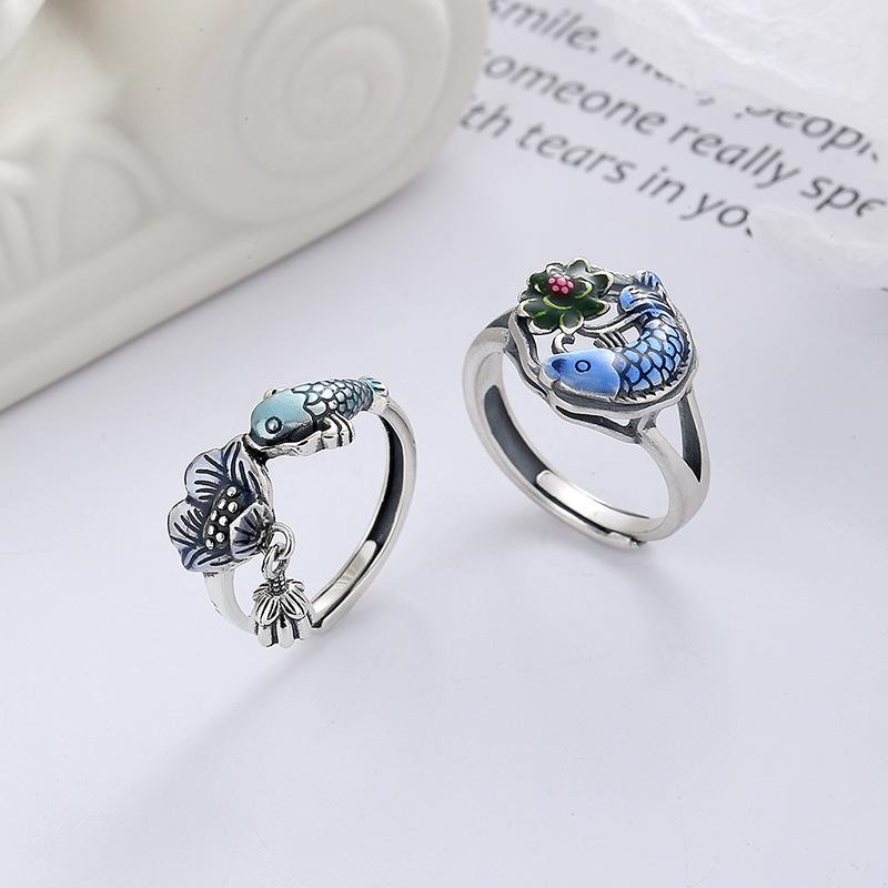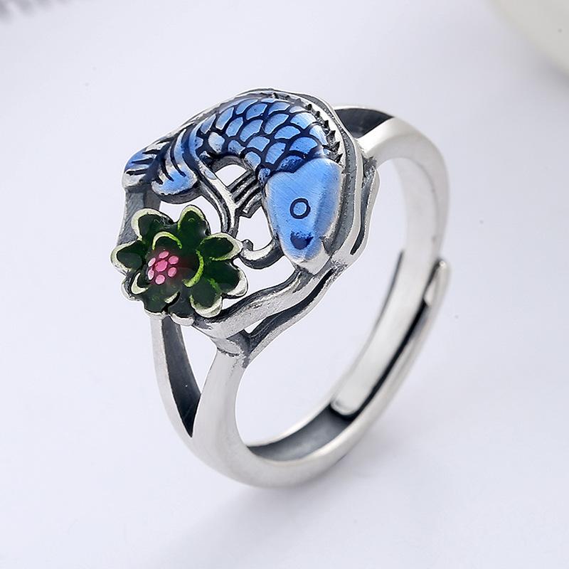 Anillo Abierto de Resina Azul Quemado Vintage Étnico Colorido Carpa de la Suerte Borla de Loto Venta Directa de Fábrica