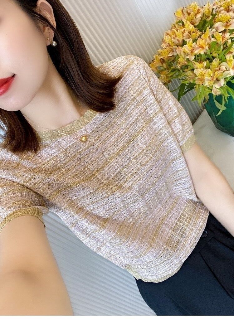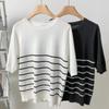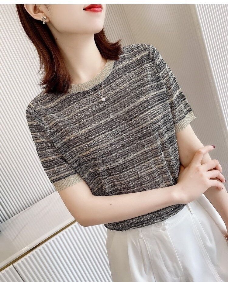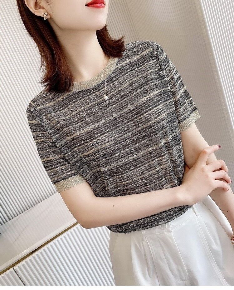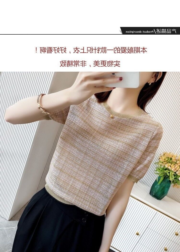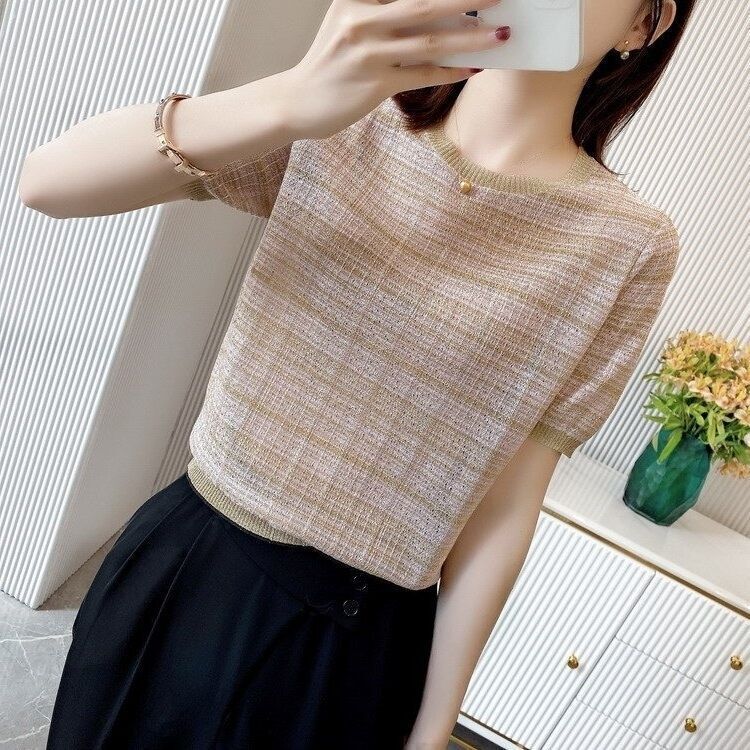 Playera de Manga Corta Cuello Redondo Suéter Tejido de Seda de Hielo para Mujer 2023 Nuevo Verano Estilo Coreano Holgado Delgado Camiseta Básica Top para Mujer