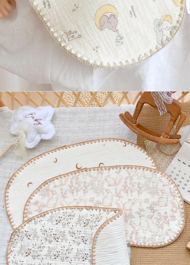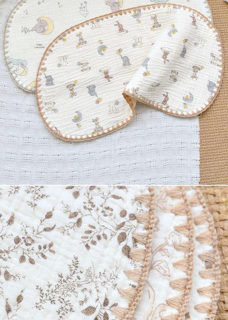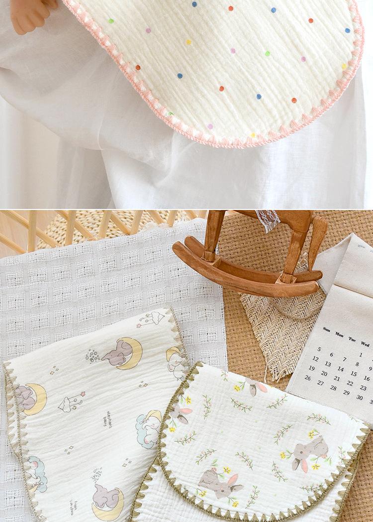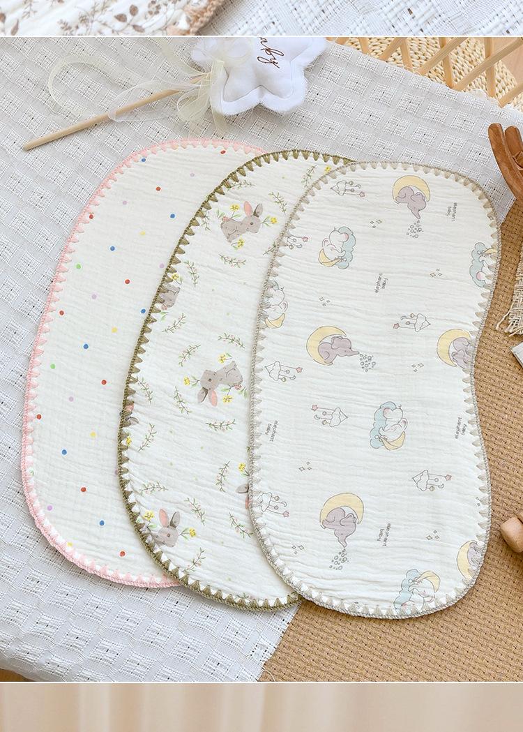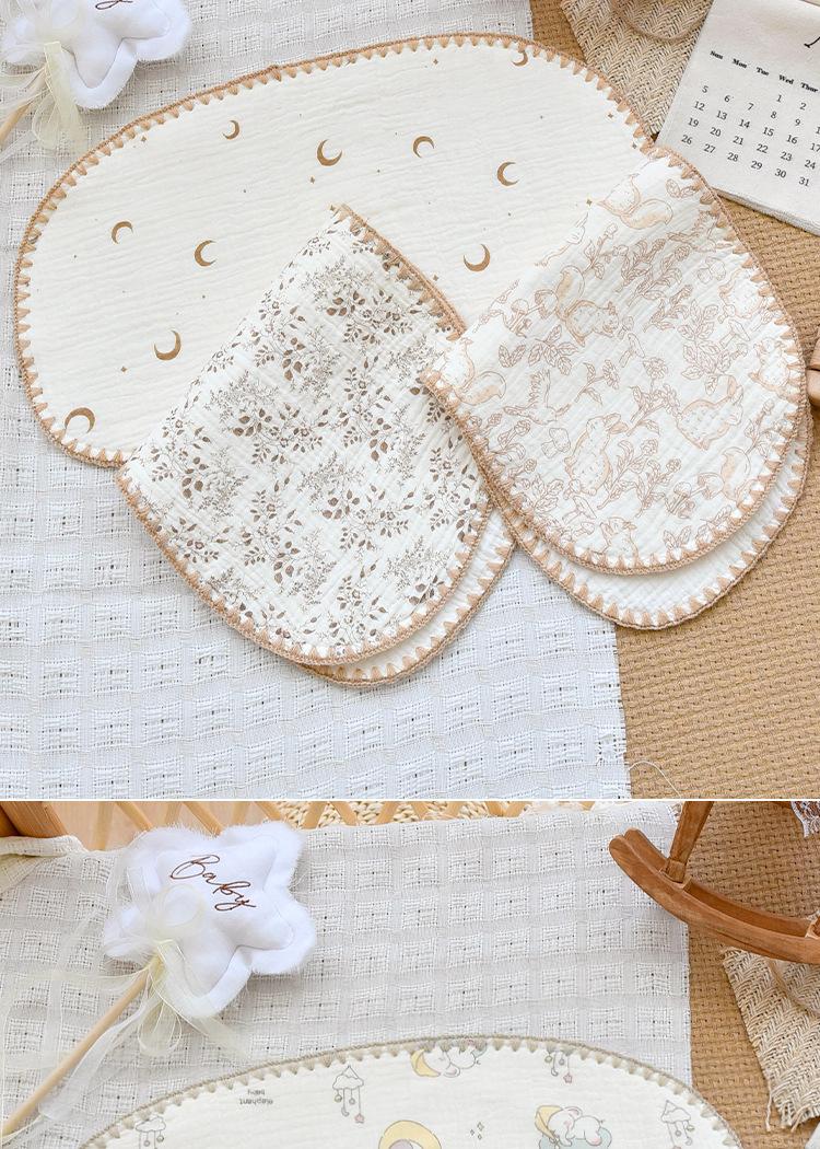 Toalla eructadora de gasa de algodón para bebé Este paño para eructos está hecho de tela de gasa de algodón, que es algodón peinado de alta densidad y alto conteo. Se siente muy suave y agradable al tacto, cuidando la delicada piel del bebé Diseño de arco interior, se ajusta muy bien al cuello, tanto la hombrera como la correa para el cuello son muy cómodas. Sobrecostura exquisita festoneada, no se deshace fácilmente, lavable a máquina Hecho con estampados reactivos por toda la prenda, infantil y lindo El patrón es muy reproducible y no se desvanecerá incluso después de lavados repetidos. Calidad clase A, sin fluorescencia.