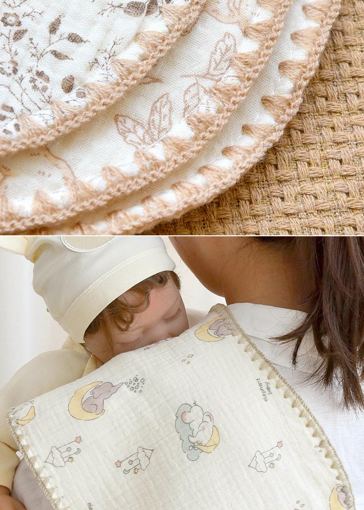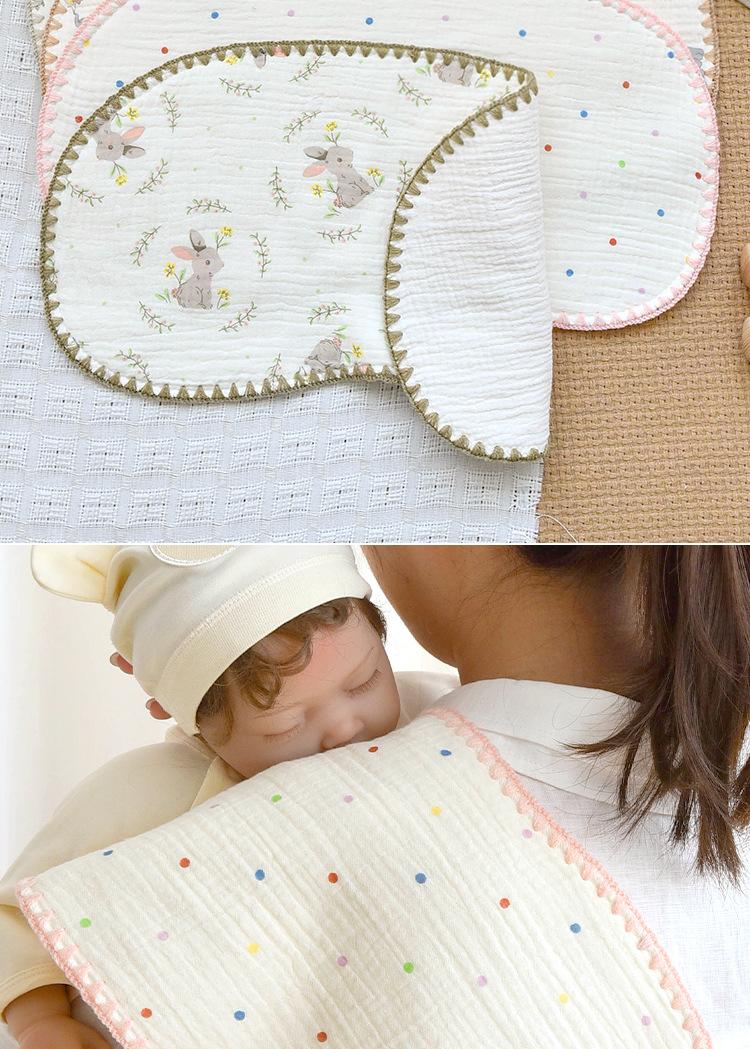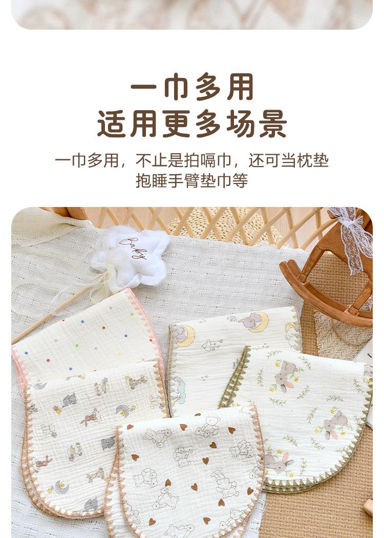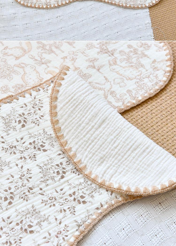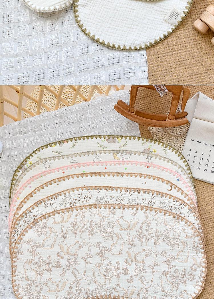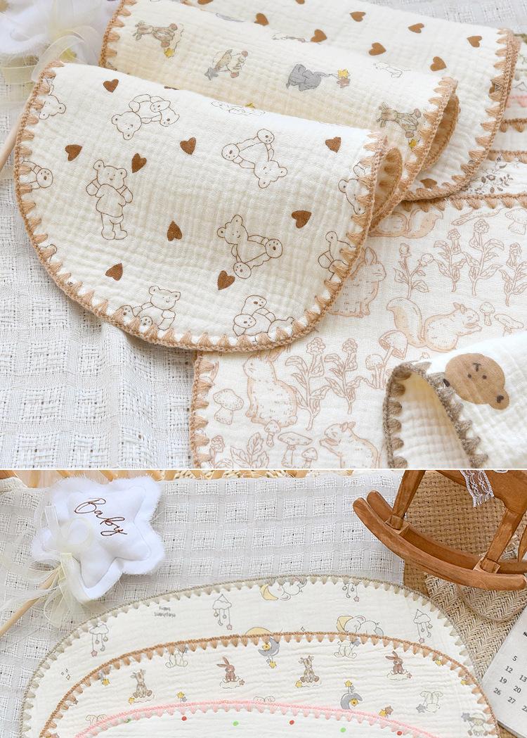 Toalla eructadora de gasa de algodón para bebé Este paño para eructos está hecho de tela de gasa de algodón, que es algodón peinado de alta densidad y alto conteo. Se siente muy suave y agradable al tacto, cuidando la delicada piel del bebé Diseño de arco interior, se ajusta muy bien al cuello, tanto la hombrera como la correa para el cuello son muy cómodas. Sobrecostura exquisita festoneada, no se deshace fácilmente, lavable a máquina Hecho con estampados reactivos por toda la prenda, infantil y lindo El patrón es muy reproducible y no se desvanecerá incluso después de lavados repetidos. Calidad clase A, sin fluorescencia.