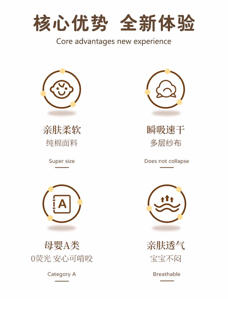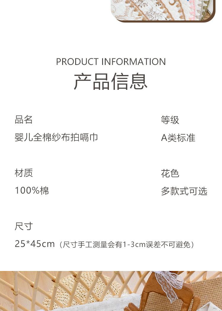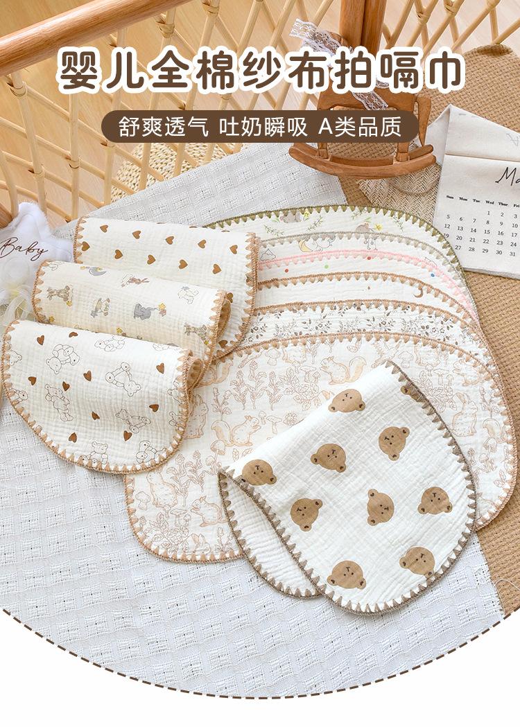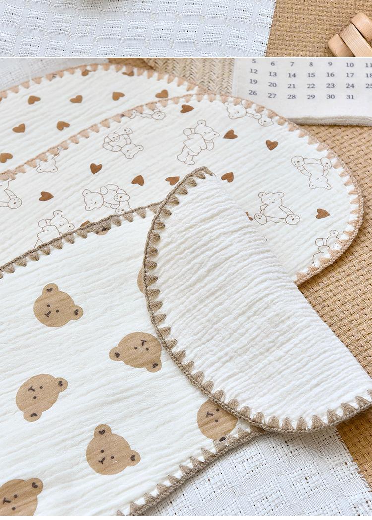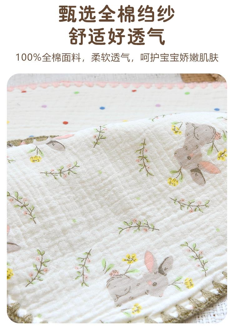 Toalla eructadora de gasa de algodón para bebé Este paño para eructos está hecho de tela de gasa de algodón, que es algodón peinado de alta densidad y alto conteo. Se siente muy suave y agradable al tacto, cuidando la delicada piel del bebé Diseño de arco interior, se ajusta muy bien al cuello, tanto la hombrera como la correa para el cuello son muy cómodas. Sobrecostura exquisita festoneada, no se deshace fácilmente, lavable a máquina Hecho con estampados reactivos por toda la prenda, infantil y lindo El patrón es muy reproducible y no se desvanecerá incluso después de lavados repetidos. Calidad clase A, sin fluorescencia.