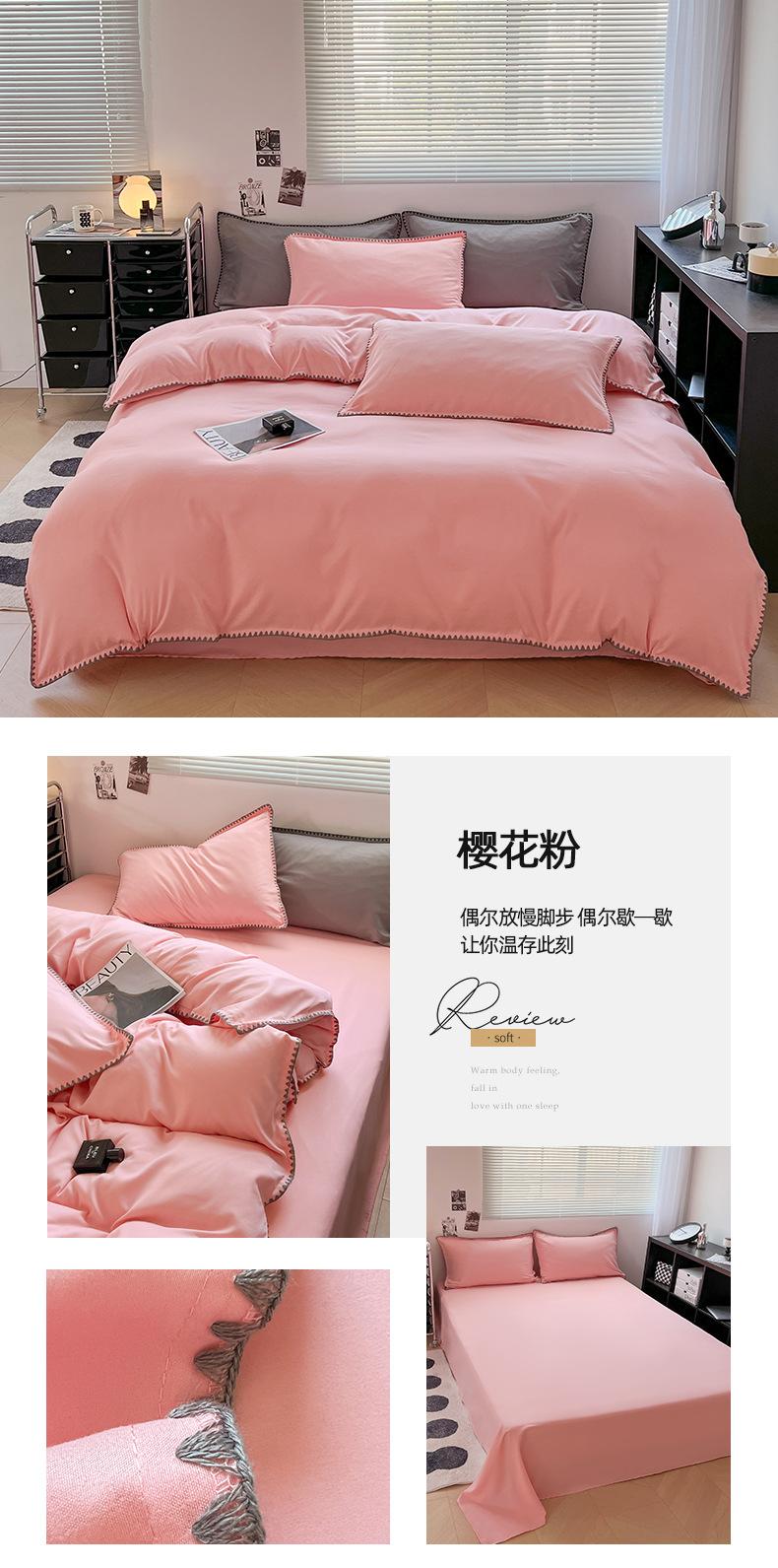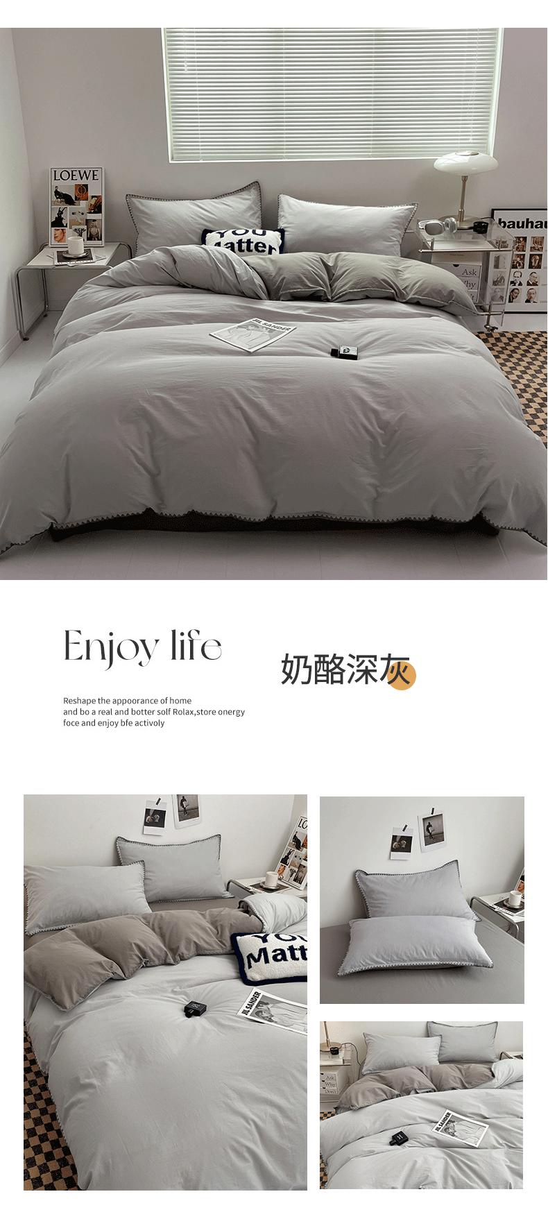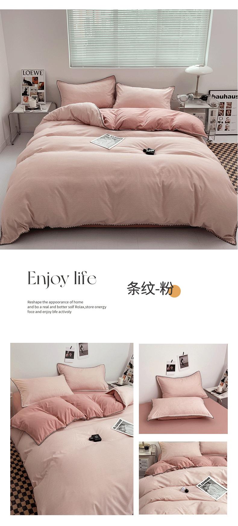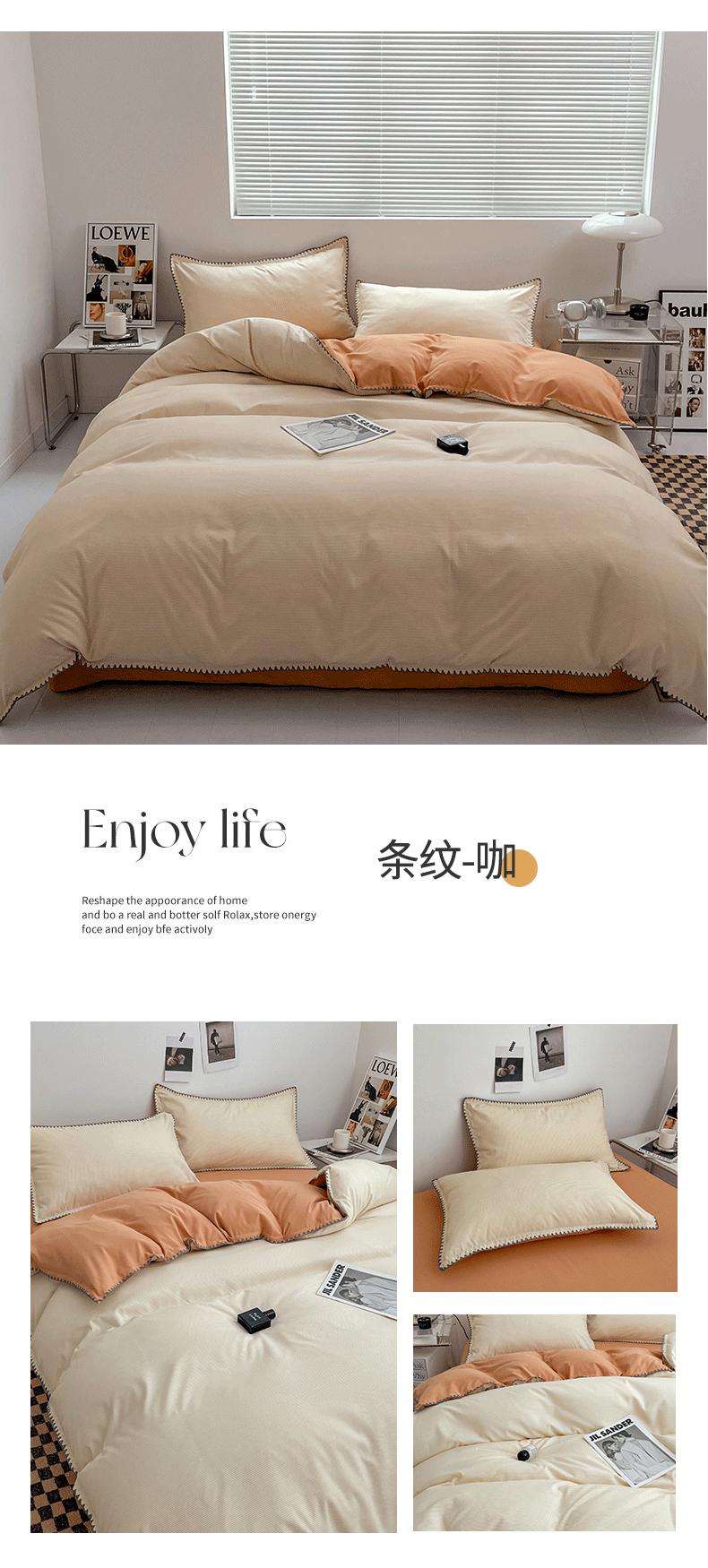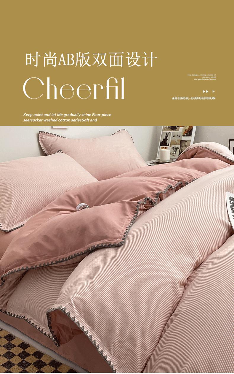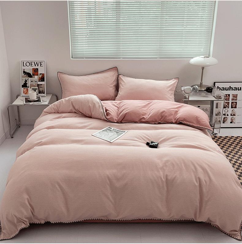 Juego de Cama de Algodón Lavado de Cuatro Piezas con Doble Raya Estilo Ins, Sábana Encimera Cepillada de Color Sólido, Funda de Edredón, Sábana Ajustable, Juego de Tres Piezas para Estudiante