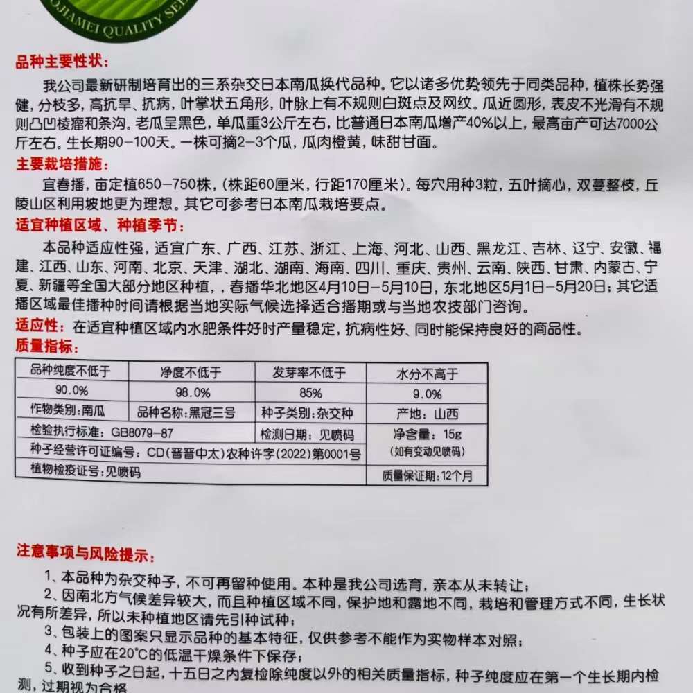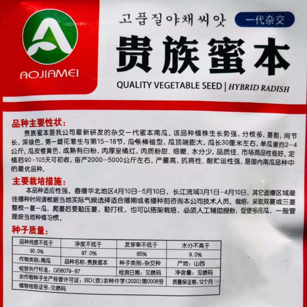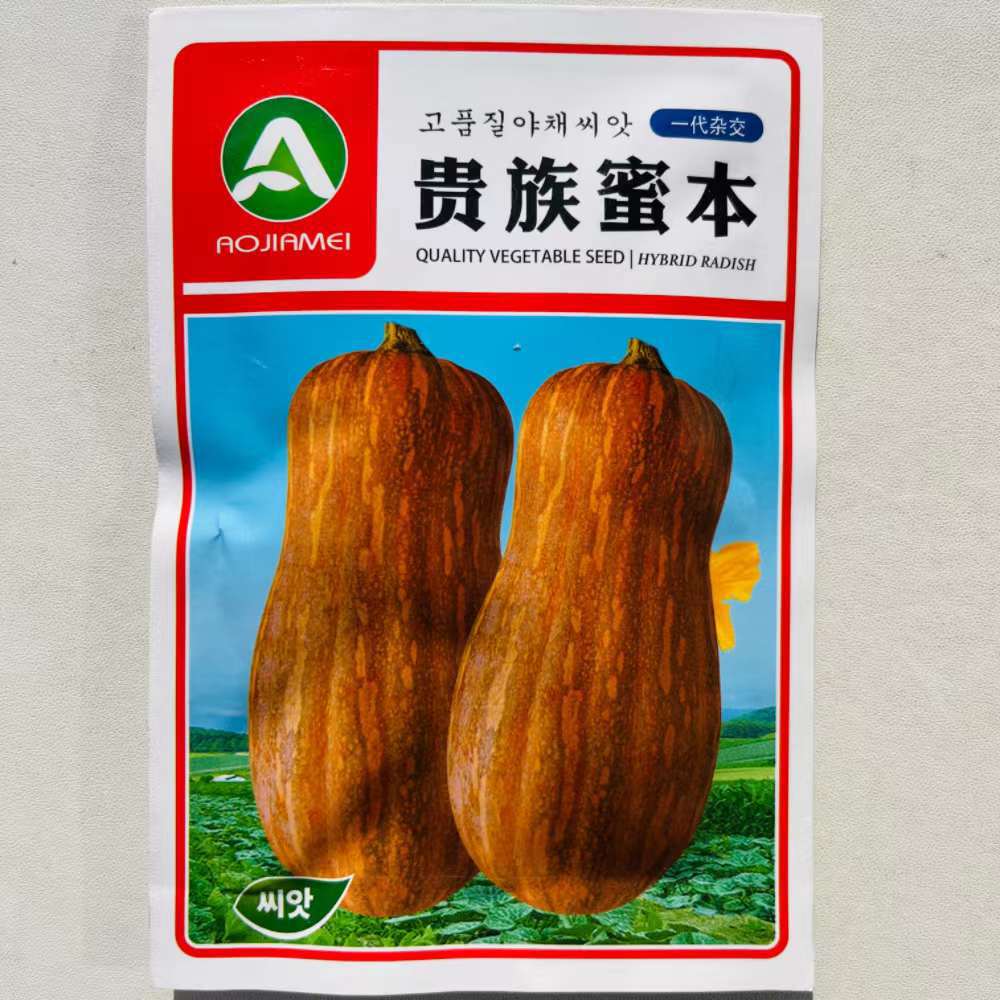 Maduración temprana, se puede cosechar 70-90 días después del trasplante. Fuerte resistencia, alta adaptabilidad, alto rendimiento, buena calidad, resistente al almacenamiento, buena comercialización. La planta crece postrada, fuerte capacidad de ramificación, las flores femeninas aparecen en los nudos 15-16. El fruto es en forma de maza, de unos 36 cm de largo, unos 14 cm de diámetro. El ápice del fruto está ensanchado, las semillas son pocas y están concentradas en el ápice. Cuando madura, la piel del fruto es amarillo-anaranjada, cubierta de polvo de cera blanca. La pulpa es rojo-anaranjada, gruesa y baja en humedad, firme y delicada, dulce y deliciosa. Peso del fruto individual 2.5-3.5 kg, tiene alto potencial de rendimiento. Rendimiento por acre alrededor de 3000 kg.