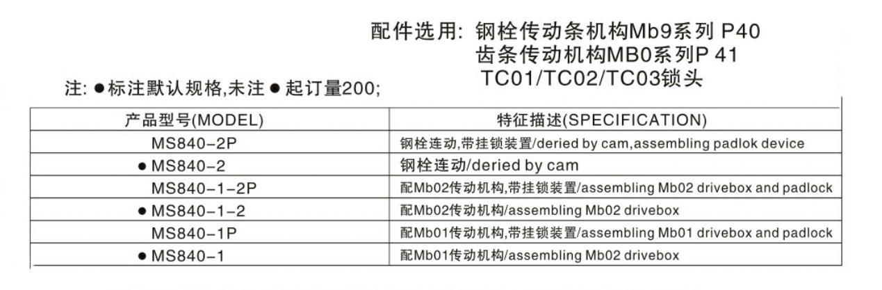 | Introducción del producto: MS840-1: 1. Material cuerpo de cerradura de aleación de zinc, eje de transmisión; cerrojo de acero galvanizado, barra de transmisión; cubierta base de plástico; 2. Tratamiento superficial: negro mate (CS03); 3. Función estructural, utiliza cilindro semicilíndrico irregular equipado, con guardapolvo para el cilindro de aleación de zinc; el cuerpo de transmisión y el cuerpo de la cerradura se pueden separar independientemente; puede lograr apertura izquierda y derecha, método de conversión igual que MS834; cuerpo de transmisión, cubierta base de plástico utilizada como placa de presión; con función de sellado e impermeable; 4 Observaciones espesor de panel de puerta aplicable 1.5-3mm; MS840-I apertura de cerrojo de acero □7X7, biela se puede seleccionar: ;MS840-II apertura de cerrojo de acero □8X8, se puede configurar en cerrojos de acero de un punto, dos puntos, tres puntos según los requisitos; biela se puede seleccionar. Altura de rebajo H 23.5 |