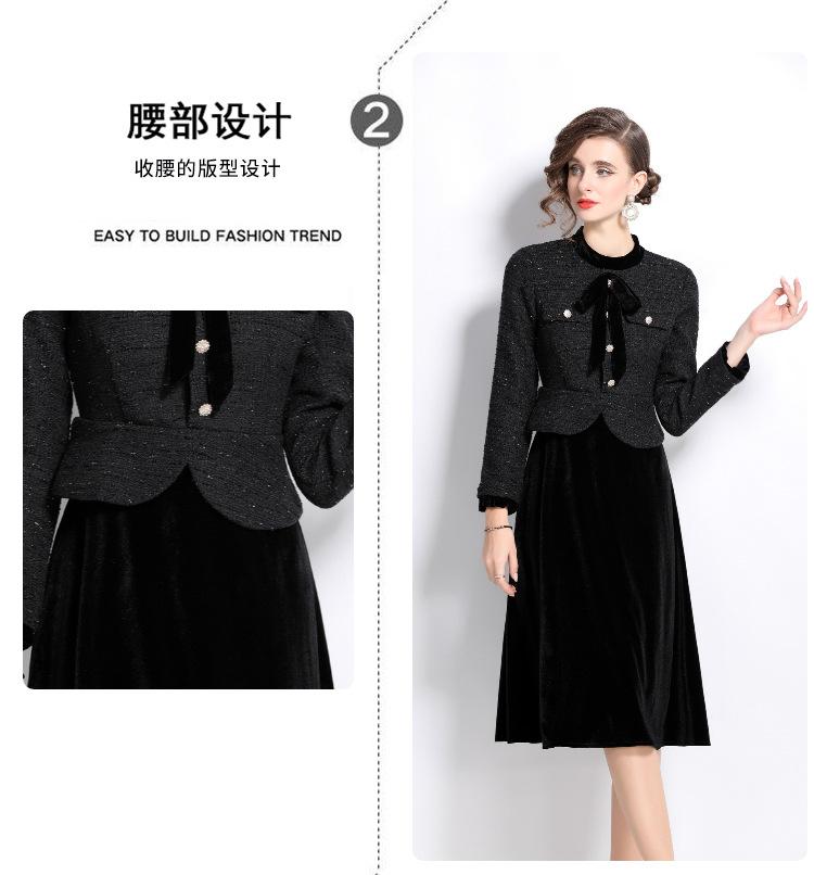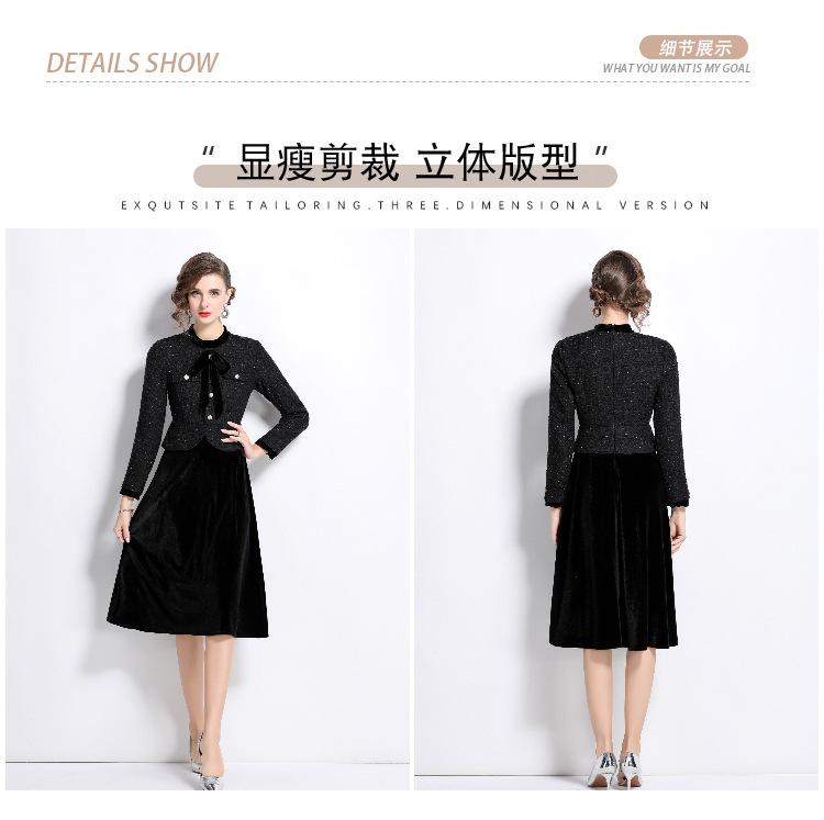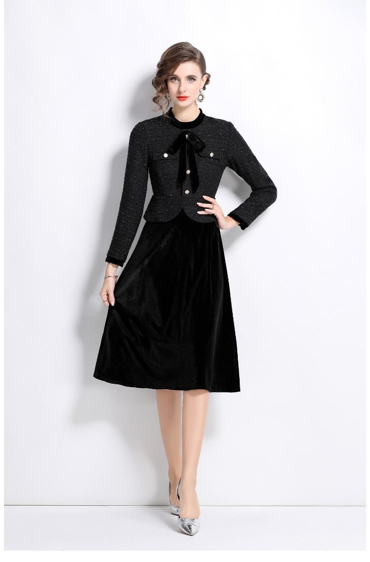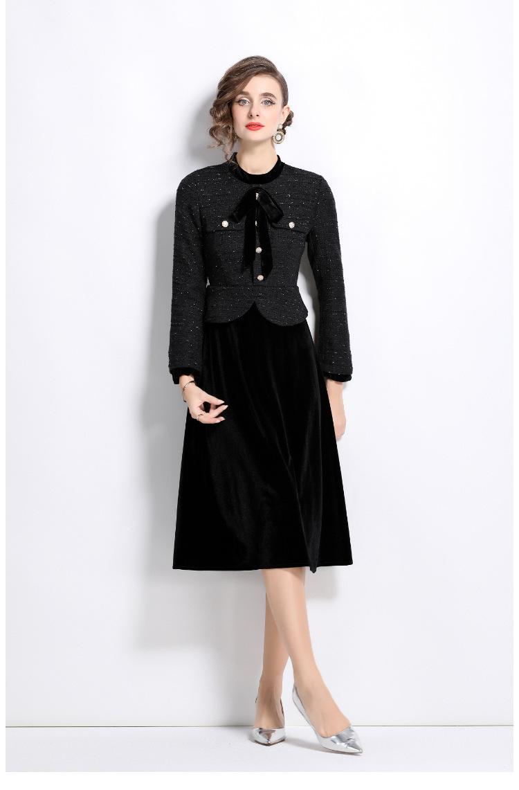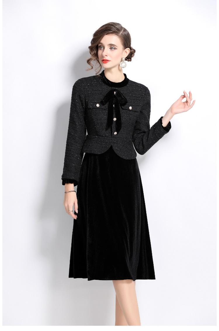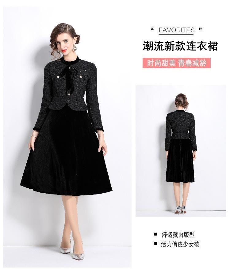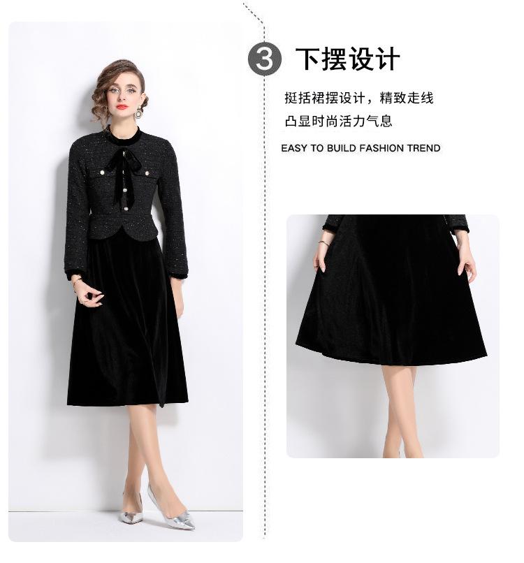 Amazon Estación Independiente Comercio Exterior 2024 Vestido de Manga Larga de Terciopelo Patchwork Tweed de Celebridad Falso de Dos Piezas