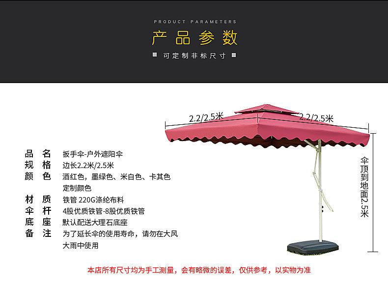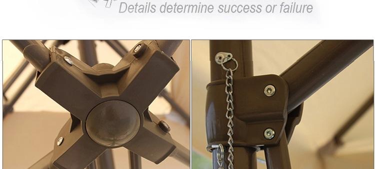 1、Material: Estructura de acero/Marco de aleación de aluminio con pintura horneada blanca, no se pela, hermoso, diseño de empuje, fácil de operar 2、Palo de sombrilla: 40*60MM espesor de pared 1.5MM,Hebilla de ventilación de doble fila superior, mármol fijo,Puede soportar fuerza de viento 6 3、Tela: La superficie del paraguas utiliza alta calidad320Tejido de poliéster, impermeable y protector solar, resistente a los rayos UV, duradero y otras ventajas |