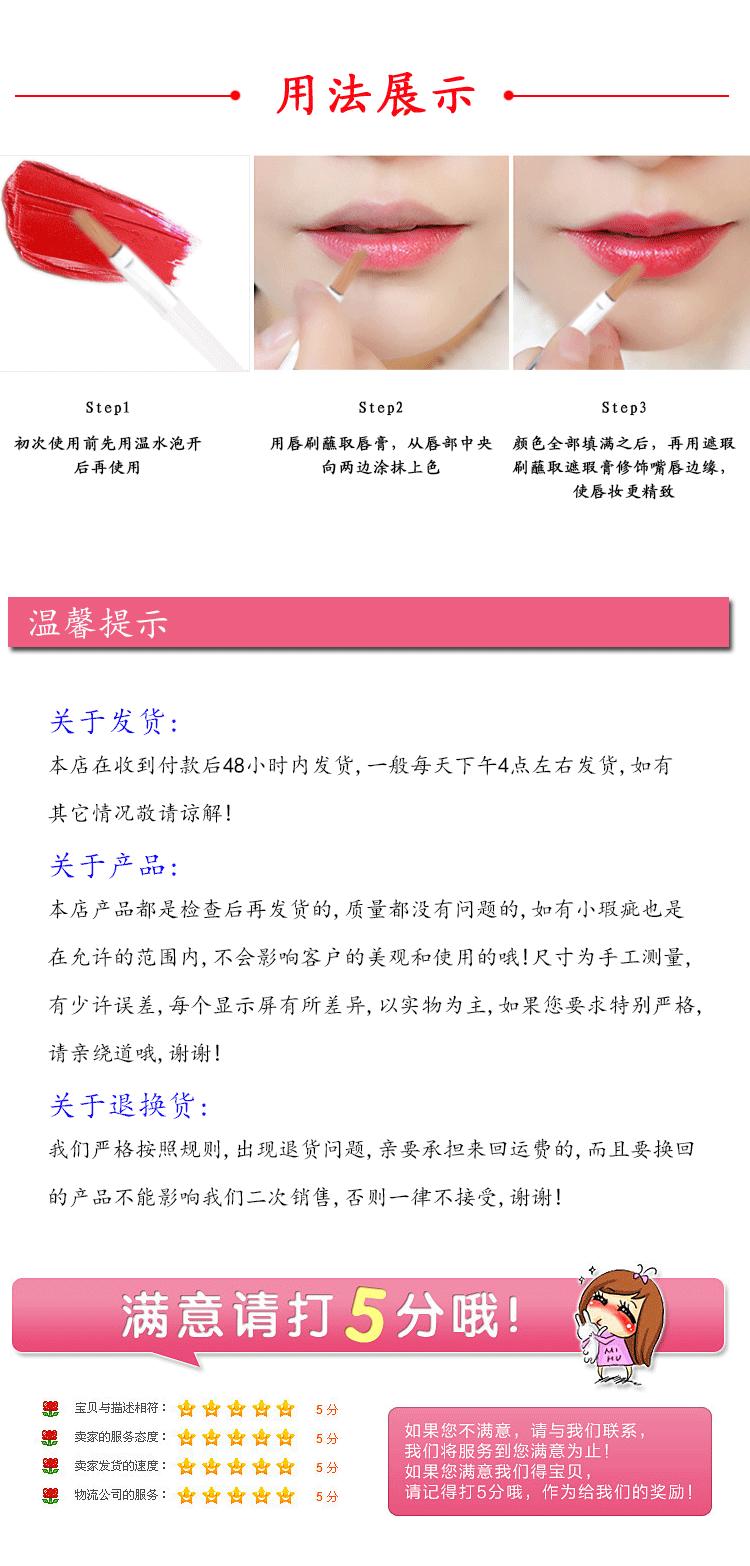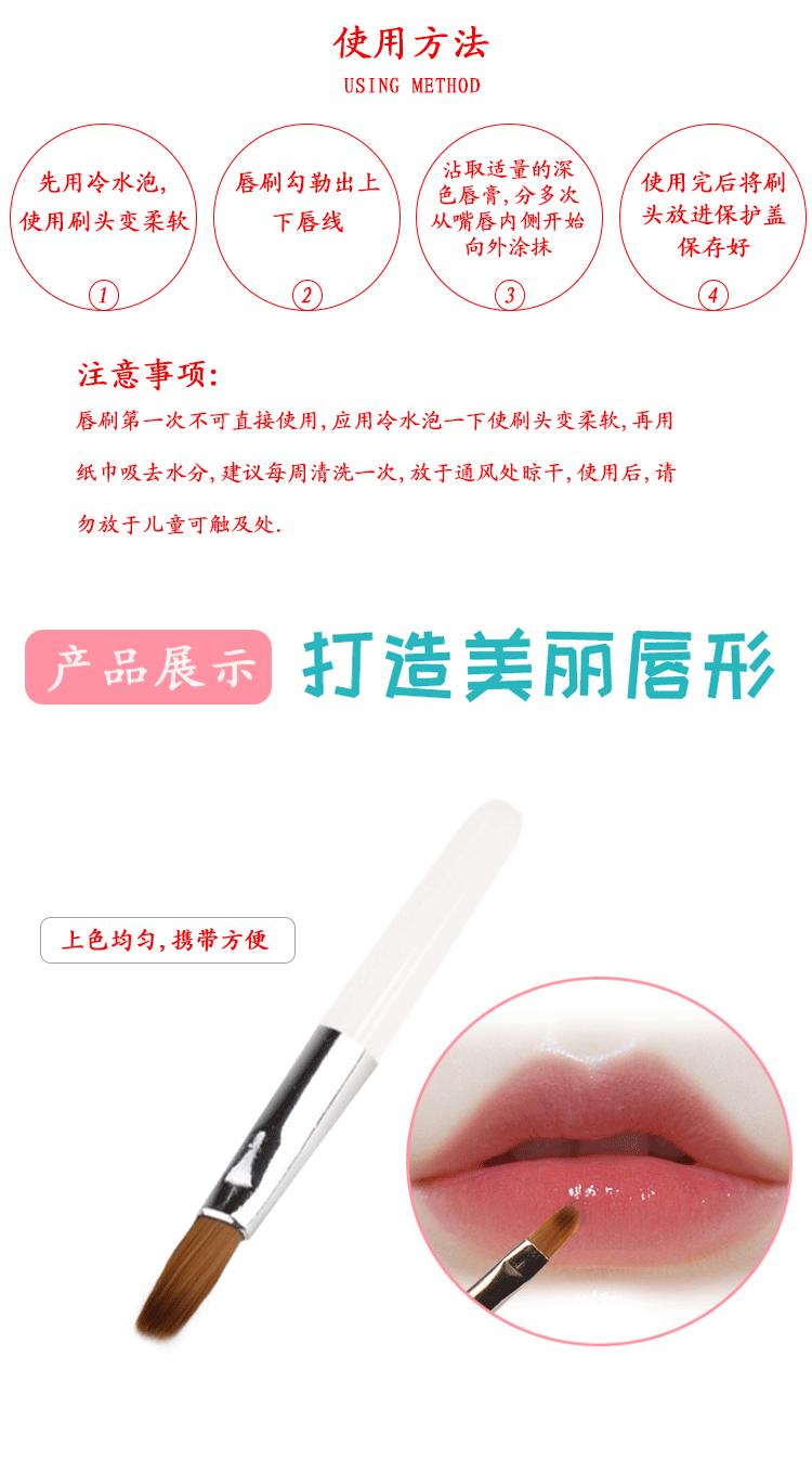 Cómo usar: ¡Sumerja el pincel en el labial o lápiz labial deseado y aplique uniformemente sobre los labios!