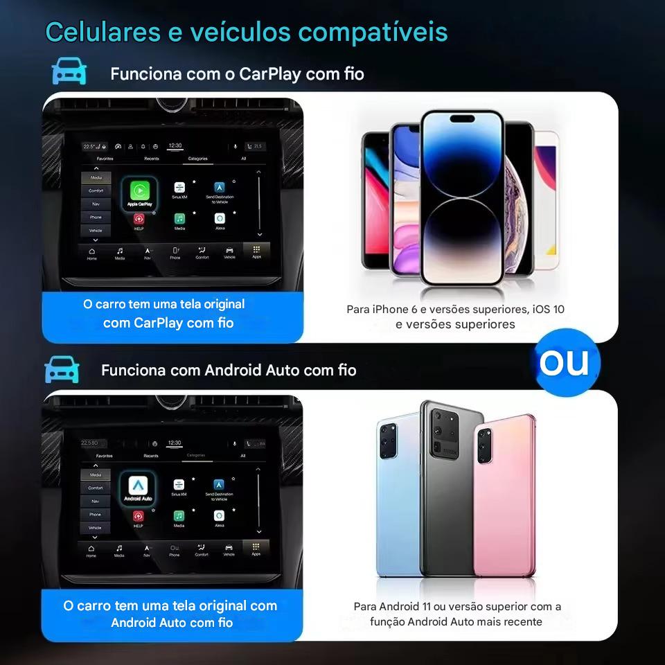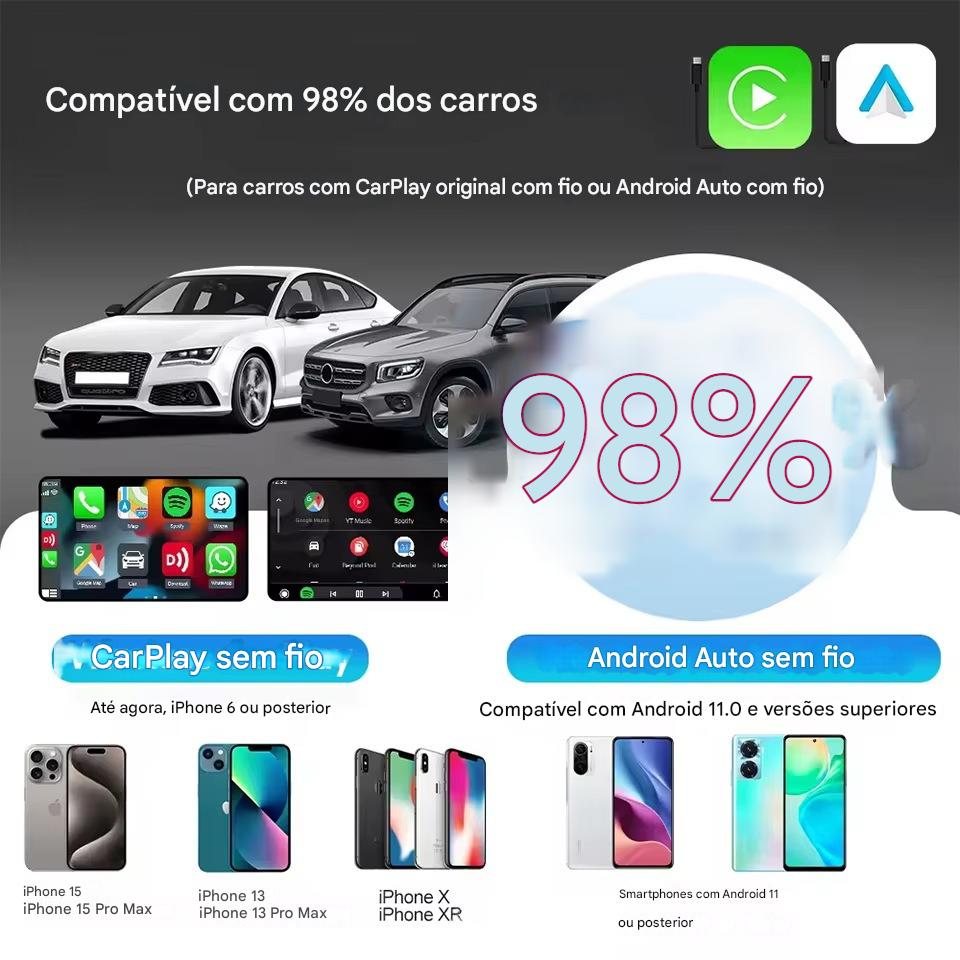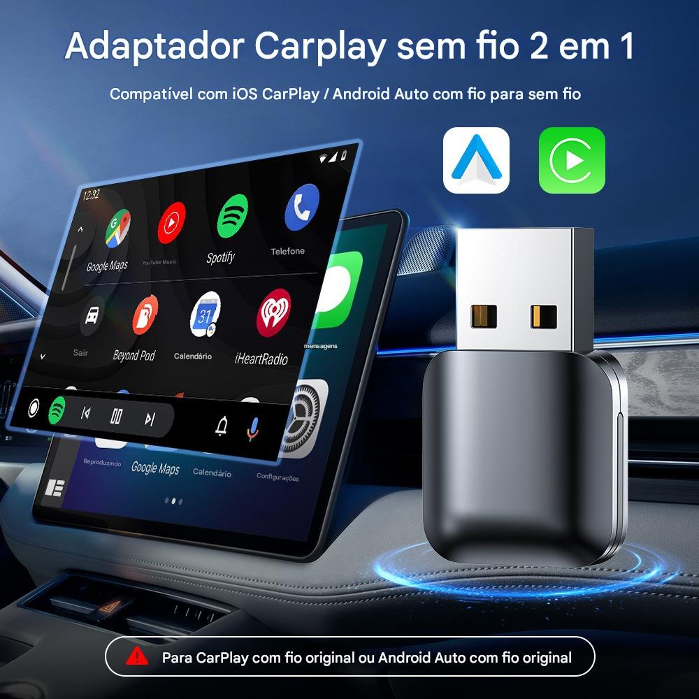 Mejora tu coche con este Adaptador Inteligente Inalámbrico CarPlay y Android Auto, compatible con sistemas iOS y Android. Solo conéctalo al puerto USB de tu coche, no se requieren aplicaciones ni configuraciones complejas. Disfruta de navegación fluida, control por asistente de voz, música y llamadas directamente en la pantalla original de tu coche.. Perfecto para conductores que buscan una experiencia de conducción más segura, inteligente y manos libres.