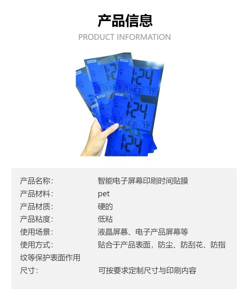 Pantalla electrónica inteligente tiempo de serigrafía película pet material de baja viscosidad impresión película azul sin luz se puede personalizar