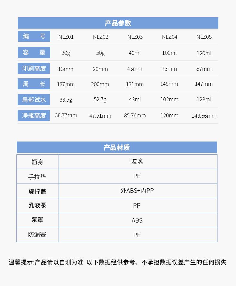 30g cream tank, 50g cream jar, 40ml water lotion bottle, 100ml water lotion bottle, 120ml bottle with internal closure