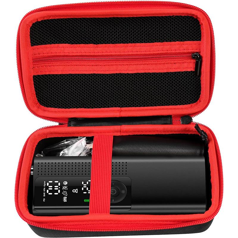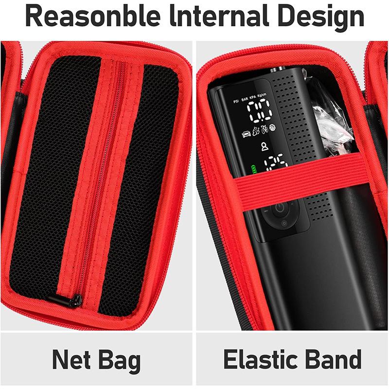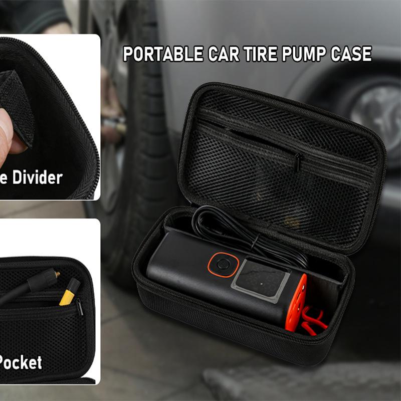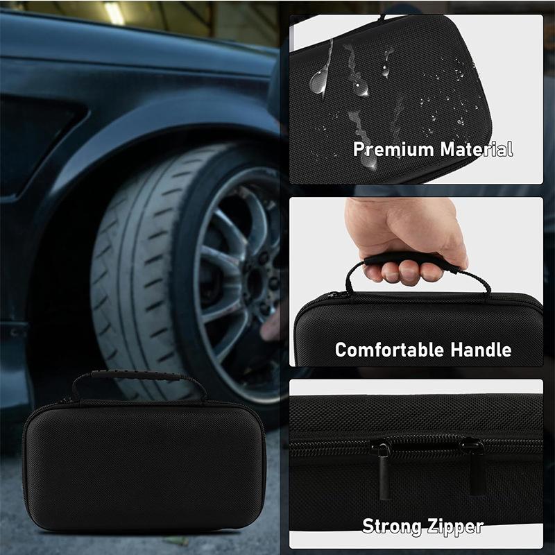 Bolsa de Almacenamiento para Bomba de Neumáticos de Coche Material Premium: Esta carcasa de compresor de aire inalámbrico está hecha de material EVA duro, impermeable, resistente a los arañazos y a los golpes. La superficie es lisa y libre de protuberancias, lo que no dañará tus manos. Si se cae accidentalmente, la carcasa de la bomba de aire puede absorber eficazmente las vibraciones para evitar daños. El interior es suave, y el soporte inflador de neumáticos digital proporciona doble protección, protegiendo el compresor de aire portátil inflador de neumáticos del polvo, la suciedad, los impactos y los arañazos.