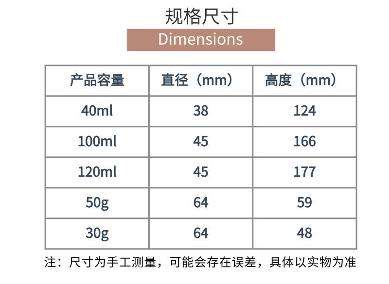 30g bottle + lid + hand pad, 50g bottle + lid + hand pad, 120ml bottle + pump head, 100ml bottle + pump head, ...