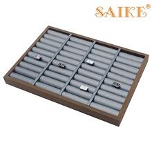 | Placa de exhibición para joyas y gafas de cuero PU cepillado gris pistola de madera de nogal negro con cien placas para anillos |