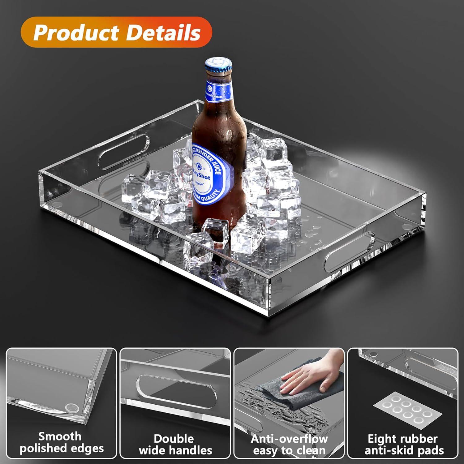 * Detalles de Diseño Cuidadosos: Diseñada pensando en su conveniencia, nuestra bandeja de acrílico viene con dos asas huecas perfectamente ovaladas. Estas asas proporcionan un agarre cómodo para un manejo fácil y un transporte sin esfuerzo. Además, las almohadillas de goma antideslizantes de cuatro ruedas en la parte inferior garantizan la estabilidad y protegen sus muebles de arañazos, sin dejar lugar para accidentes.