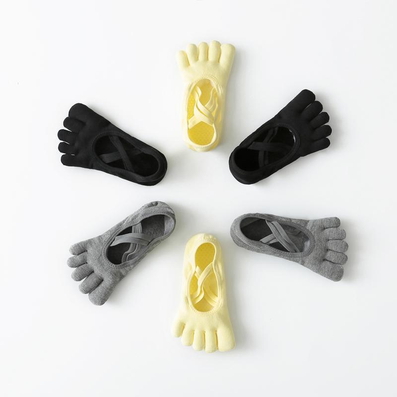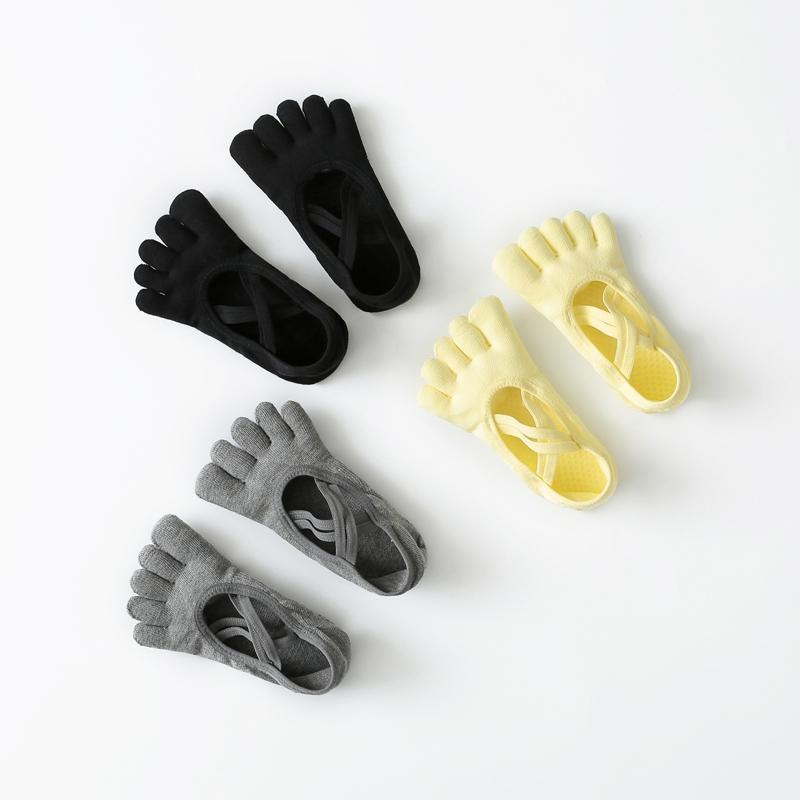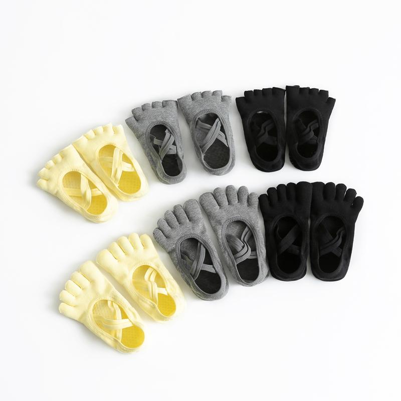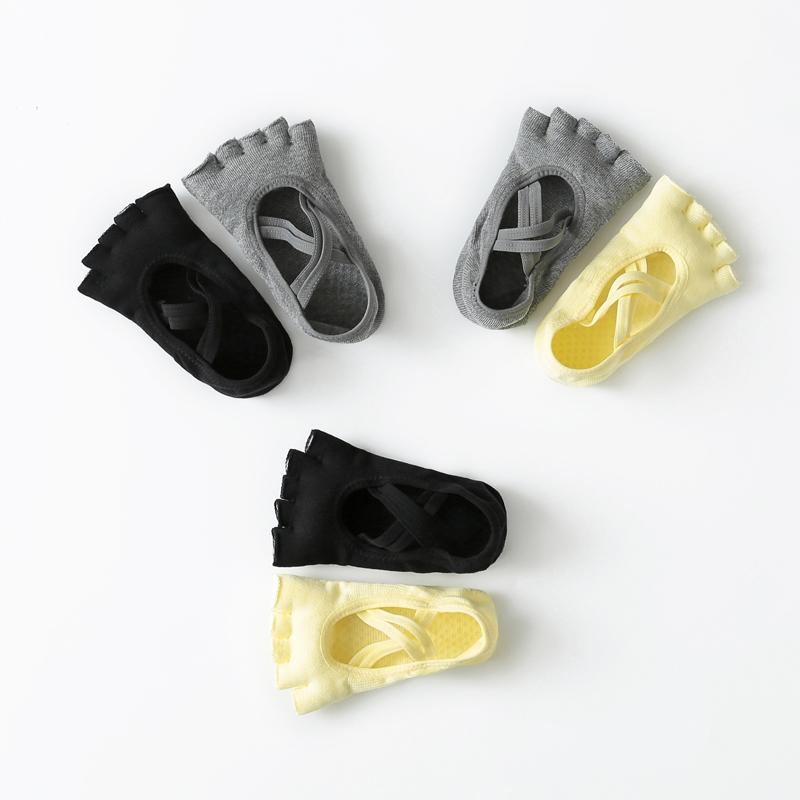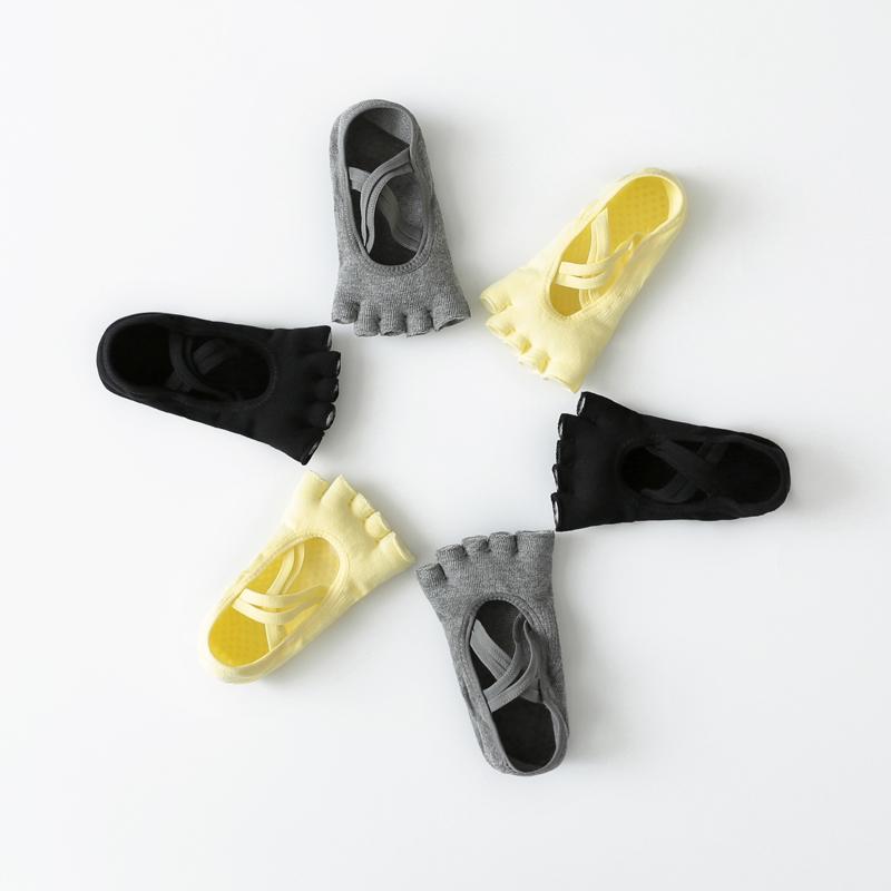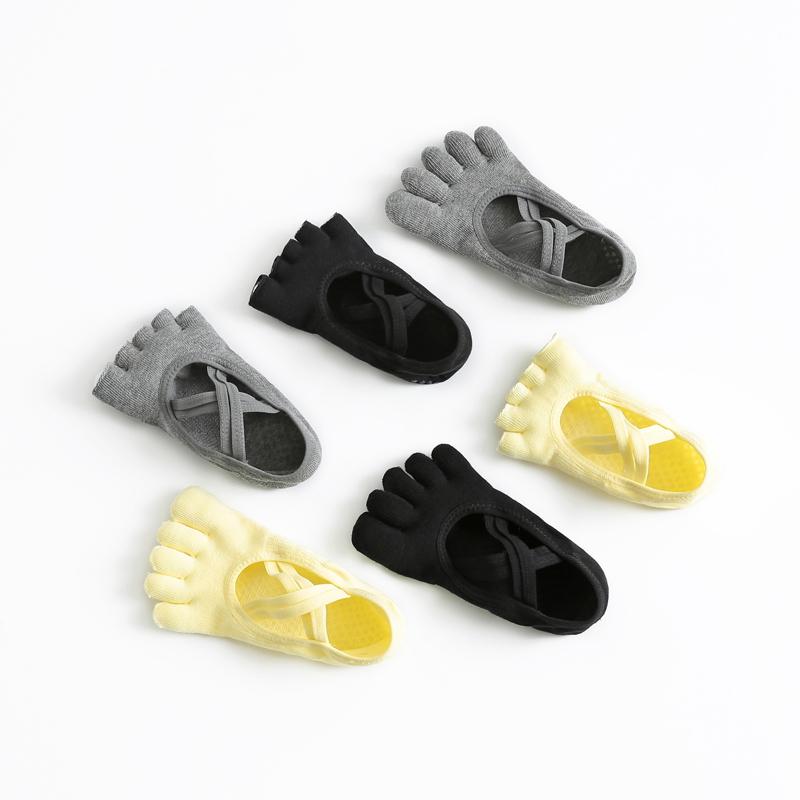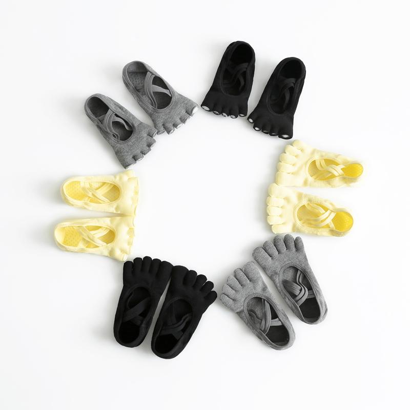 Black full toe cross strap yoga socks, Hemp gray full toe cross strap yoga socks, Bright yellow full toe cross...