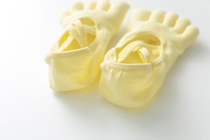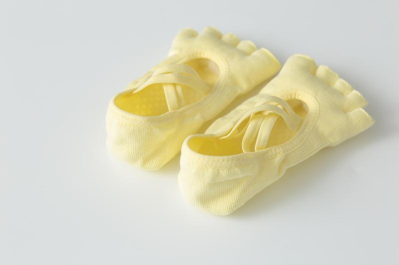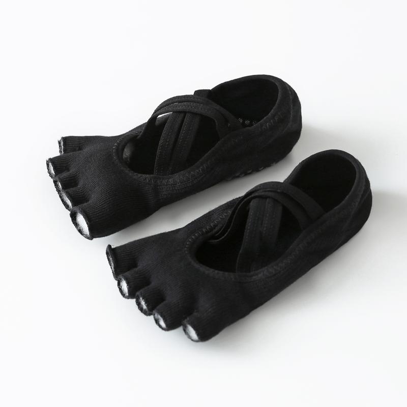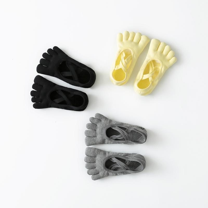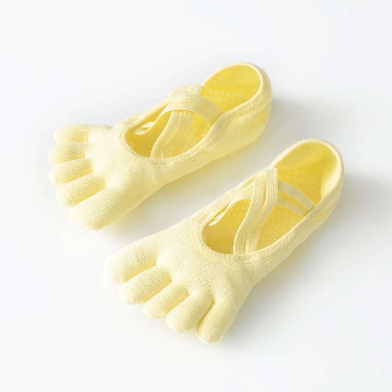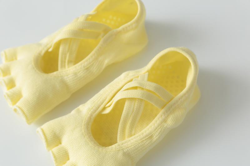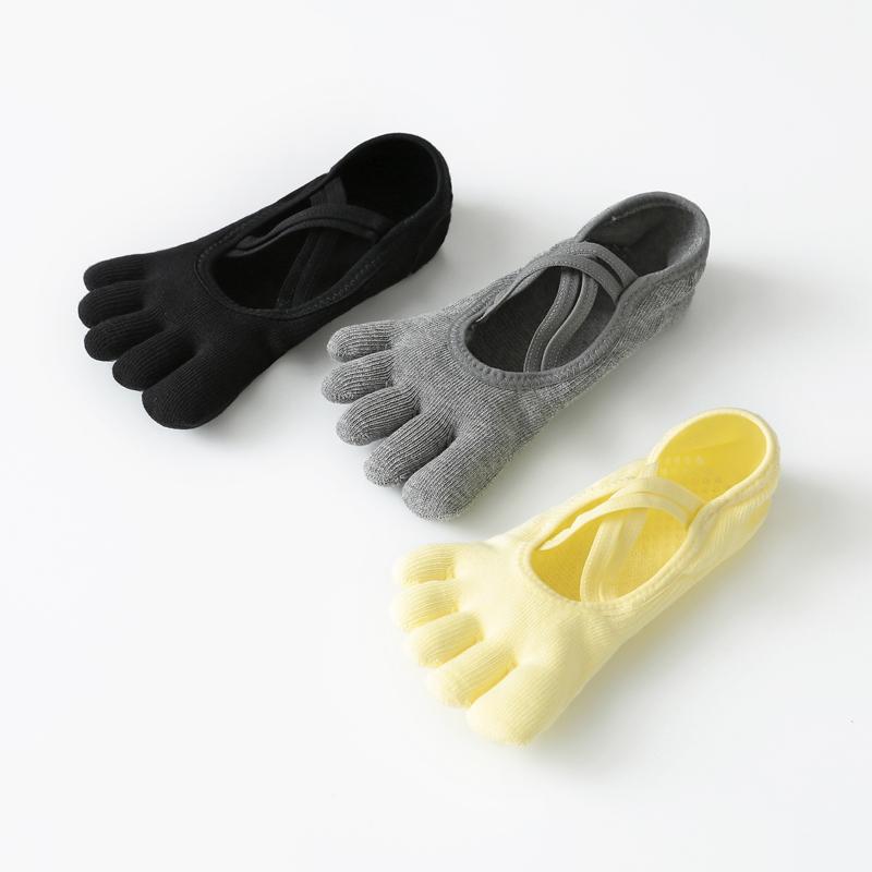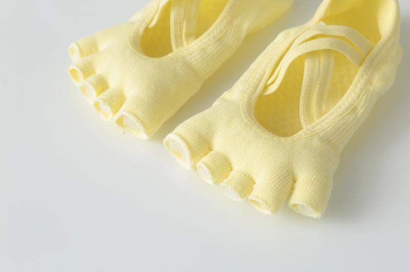 Black full toe cross strap yoga socks, Hemp gray full toe cross strap yoga socks, Bright yellow full toe cross...