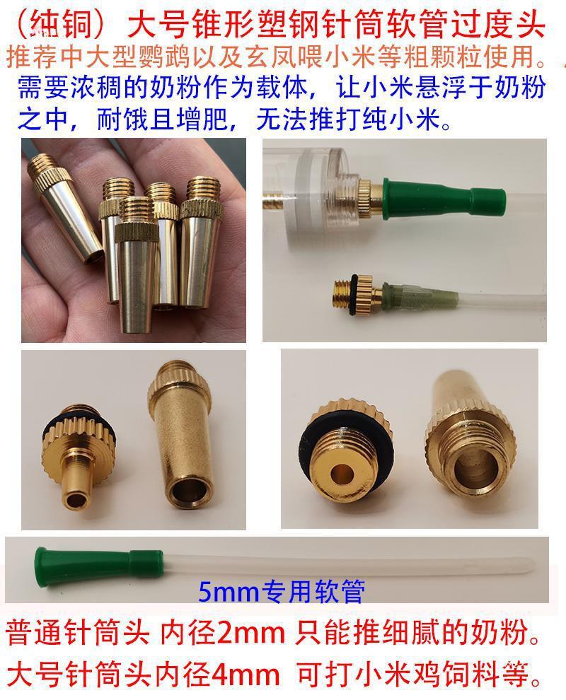 【Material del Producto】:Acero plástico, plástico 10ML.【Especificaciones】:10ML、20ML、30ML、50ML、100mL.【Características del Producto】:Todas las especificaciones para exportación son de 2mm, alimentación cónica ampliada de 4mm.1. Más fácil de limpiar, reutilizable r2. Diseño de escala, puede controlar libremente la dosis de alimentación r3. Hecho de material especial, no es fácil de romper, prolonga la vida útil r4. Este producto es adecuado para desinfección con luz ultravioleta o agua hirviendo, resistente a los golpes, a la presión y a altas temperaturas (evitar la esterilización con vapor a alta presión) r5. No se oxida ni libera sustancias, asegurando que los polluelos no se envenenen r6. La punta de la aguja está hecha de material metálico, duradera【Objetos Aplicables y Usos】:Adecuado para todos los polluelos de loro y criadores de aves con un gran número de aves, utilizado principalmente para alimentar granjas de cría de loros y polluelos de loro en destete, alimentación forzada de aves enfermas.【Instrucciones de Uso】:Después de preparar la leche en polvo a una temperatura adecuada, succionarla con una jeringa, sujetar la cabeza del loro con una mano e inclinarla ligeramente hacia arriba, inyectar lentamente en la boca del loro, permitiendo que el loro la trague por sí solo. Hacer pausas durante cada alimentación para dar tiempo al polluelo a tragar, facilitando que el ave trague la leche en polvo.【Precauciones】:No se recomienda insertar el tubo blando directamente en el buche del polluelo de loro para alimentarlo. Inyectar la leche en polvo en la boca del polluelo de loro y dejar que el polluelo la trague por sí solo. Los clientes que insistan en insertar el tubo en el buche del polluelo de loro para alimentarlo lo hacen bajo su propio riesgo. Los criadores de aves que realizan alimentación profunda en la garganta deben prestar especial atención a no insertar el tubo en la tráquea, lo que puede causar asfixia. Recordatorio: La sustancia entre el émbolo y la jeringa es lubricante. Límpiela a fondo antes del primer uso y desinféctela con agua hirviendo antes de usarla. Este producto es solo una herramienta de alimentación. La tienda no se hace responsable de las muertes de polluelos causadas por los criadores de aves durante la alimentación (gracias por su comprensión) código de protección de plantilla código de protección de plantilla