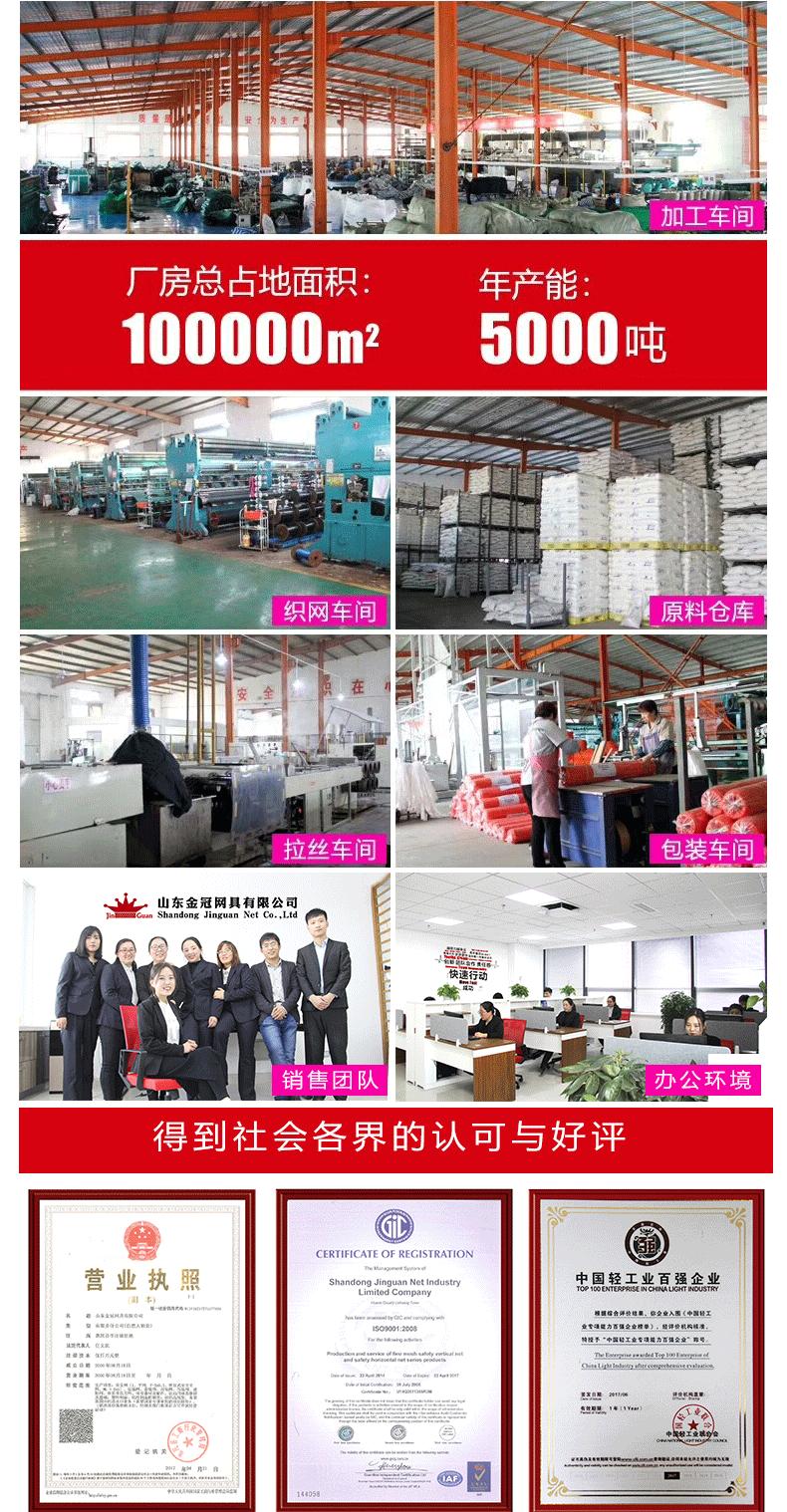 Shandong Jinguang Netting Co., Ltd. fue fundada en18 de agosto de 2000, capital registrado 28 millones de yuanes, ubicado en el Parque Industrial de Cuerdas y Redes, Pueblo de Lizhuang, Condado de Huimin, Ciudad de Binzhou, Provincia de Shandong. Los edificios de fábrica de la empresa cubren un área de 50,000 metros cuadrados. La empresa cuenta actualmente con 260 empleados, incluyendo 60 profesionales y técnicos y 20 graduados universitarios. La empresa tiene 20 líneas de producción de equipos avanzados nacionales con una capacidad de producción anual de 6,000 toneladas.