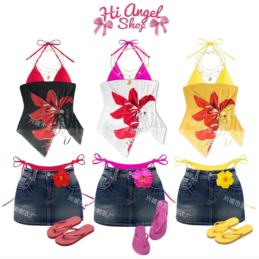 Barbie pink bikini, Yellow bikini, Red bikini, Black tube top, White tube top, Yellow tube top