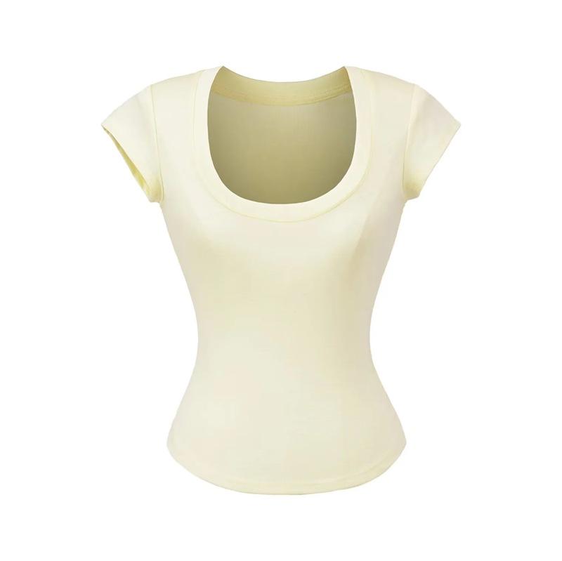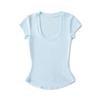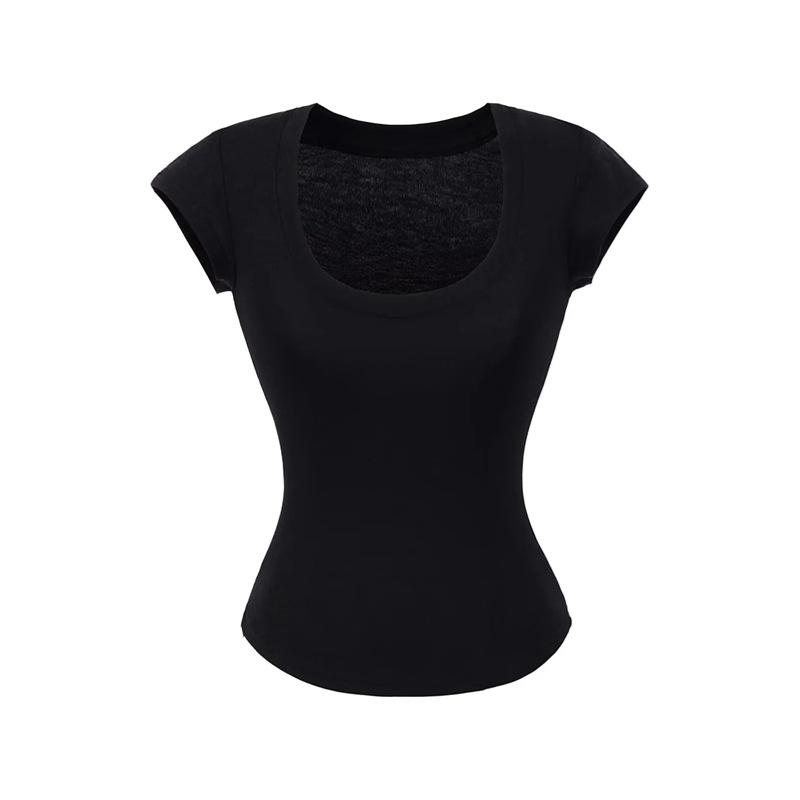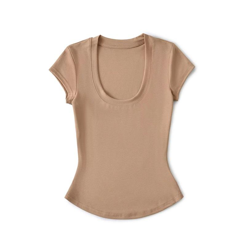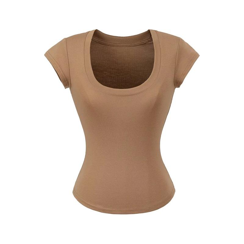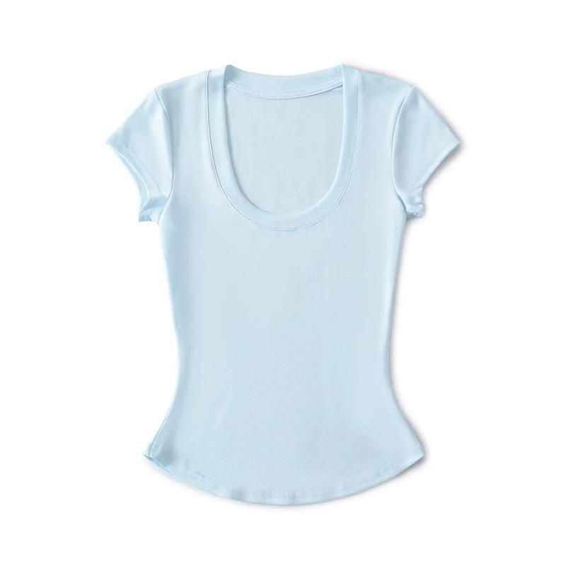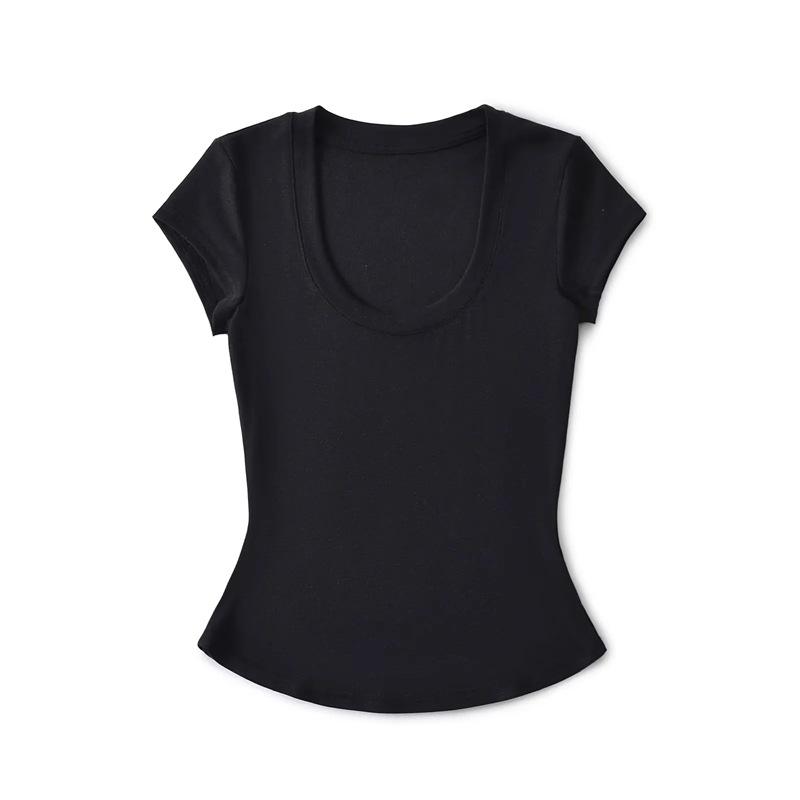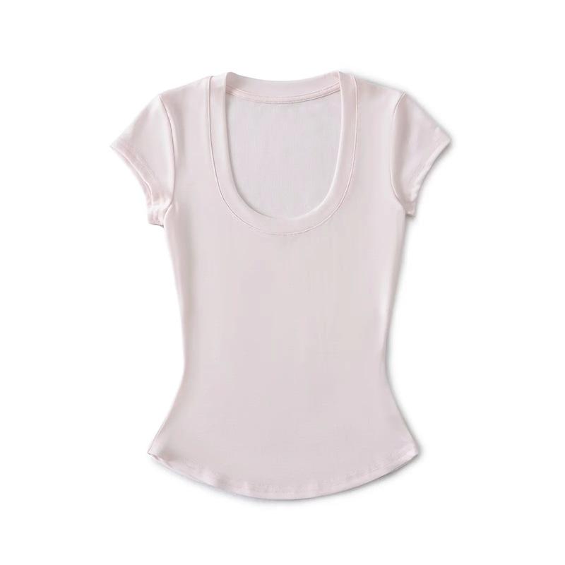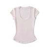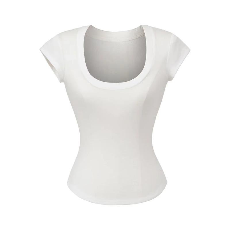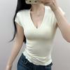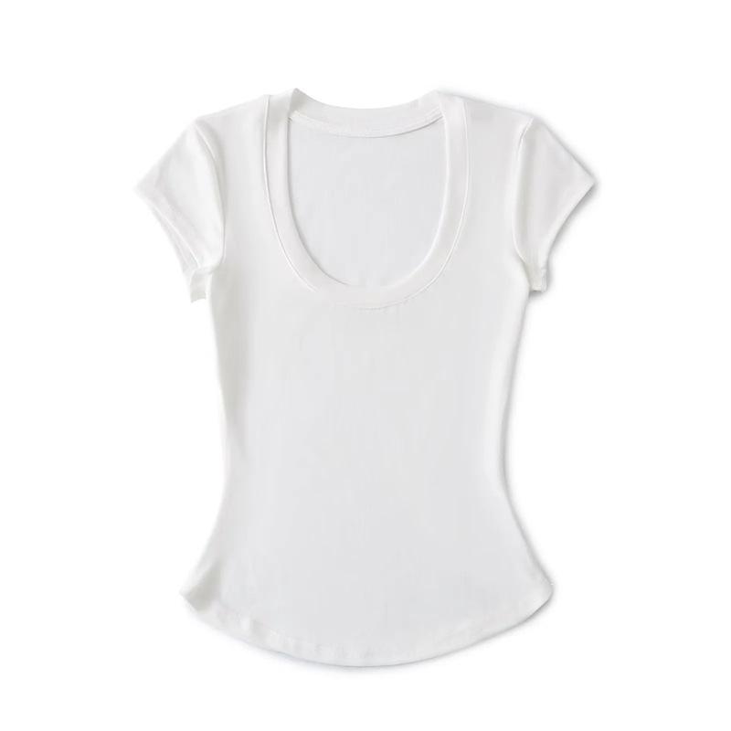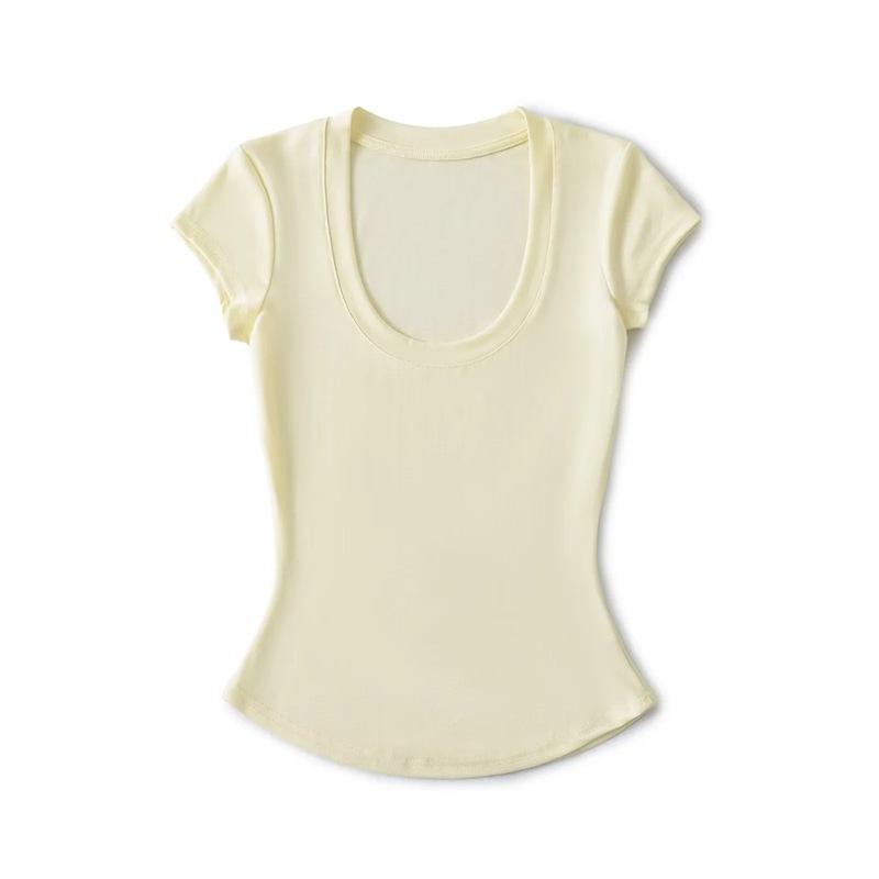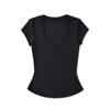 Estilo Europeo y Americano Primavera y Verano Nuevo Sexy Estilo Deseo Puro Camiseta de Manga Corta con Cuello en U de Tencel Cintura Ajustada Escote Grande Top Sexy
