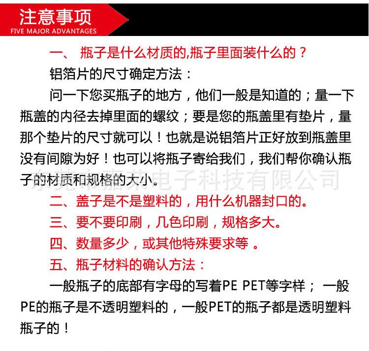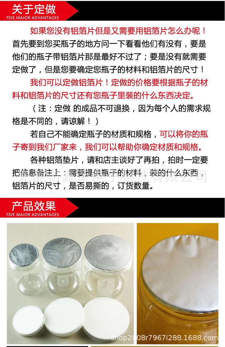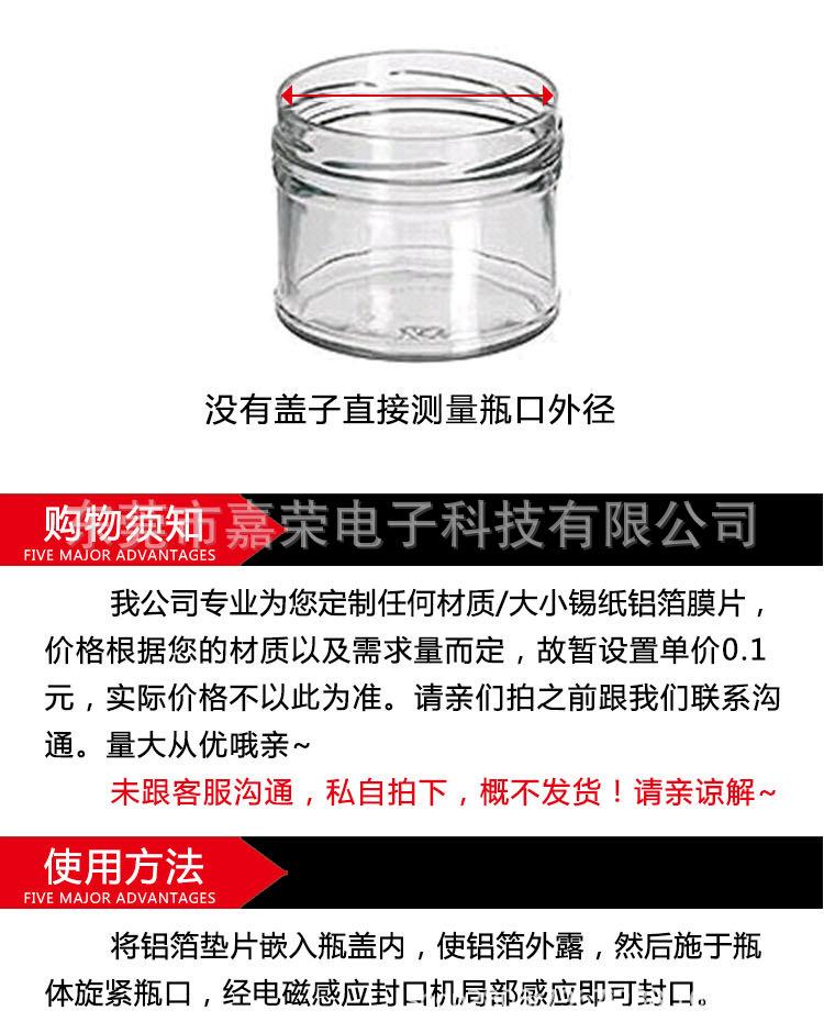 Si no está disponible, necesita personalizarlo, pero necesita determinar el material de su botella y el tamaño de la lámina de aluminio. ¡Podemos personalizar la lámina de aluminio! El precio de la personalización depende del material de la botella, el tamaño de la lámina de aluminio y lo que hay en su botella. El precio marcado en el producto está escrito casualmente y no tiene nada que ver con el precio real. ¡Por favor, contáctenos antes de confirmarlo! Nota: Los productos terminados personalizados no se pueden devolver ni cambiar, porque las especificaciones de demanda de cada persona son diferentes, por favor comprenda. Si no está seguro del material y las especificaciones de la botella, también puede enviar su botella a nuestra fábrica, y podemos ayudarle a determinar el material y las especificaciones.