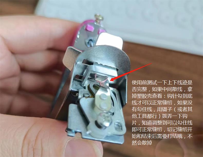 2. Luego pase el hilo por el anillo de hierro redondo en el extremo inferior de la parte superior de la máquina, y sostenga el hilo que ha pasado por el anillo de hierro, y ahora puede enhebrar la aguja. La técnica de enhebrar la aguja se ha mencionado, y lo principal es prestar atención al hilo de derecha a izquierda.