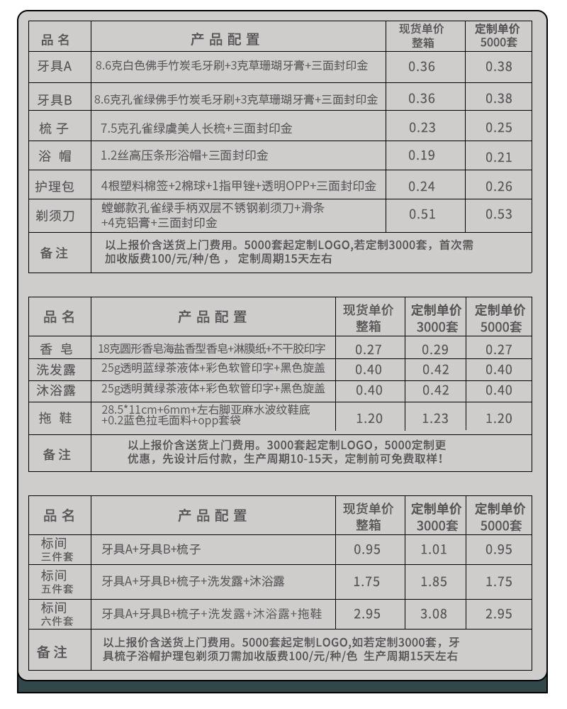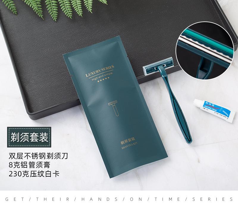 Disposable slippers, Disposable shower cap, Disposable soap, Disposable razor, Disposable toothbrush, Disposab...