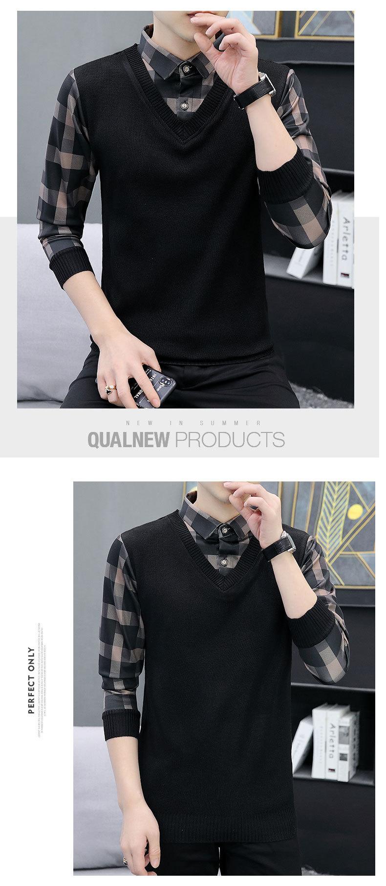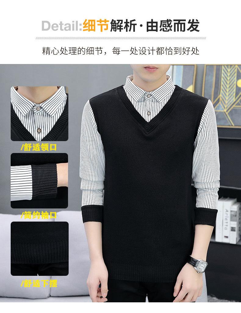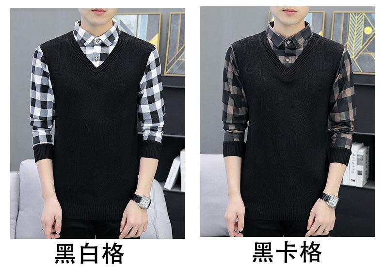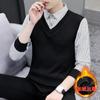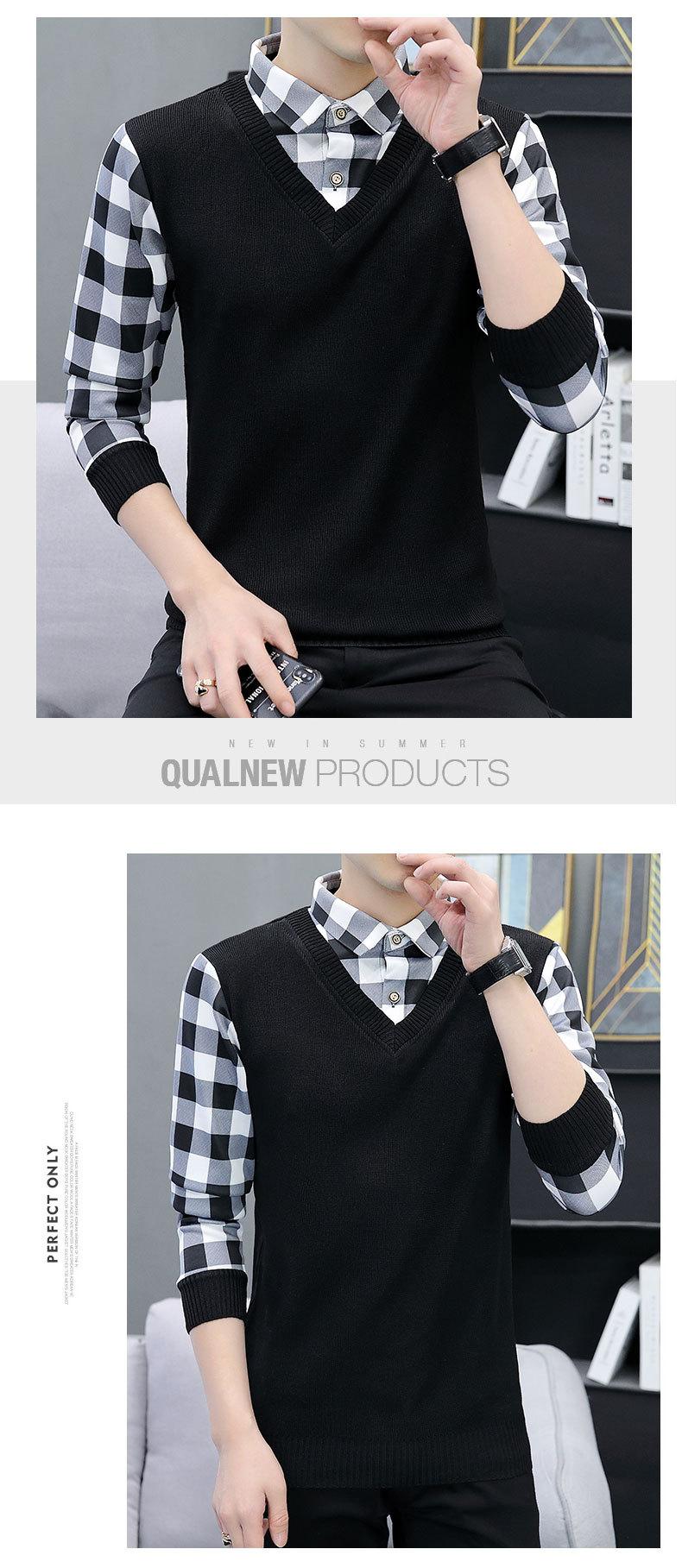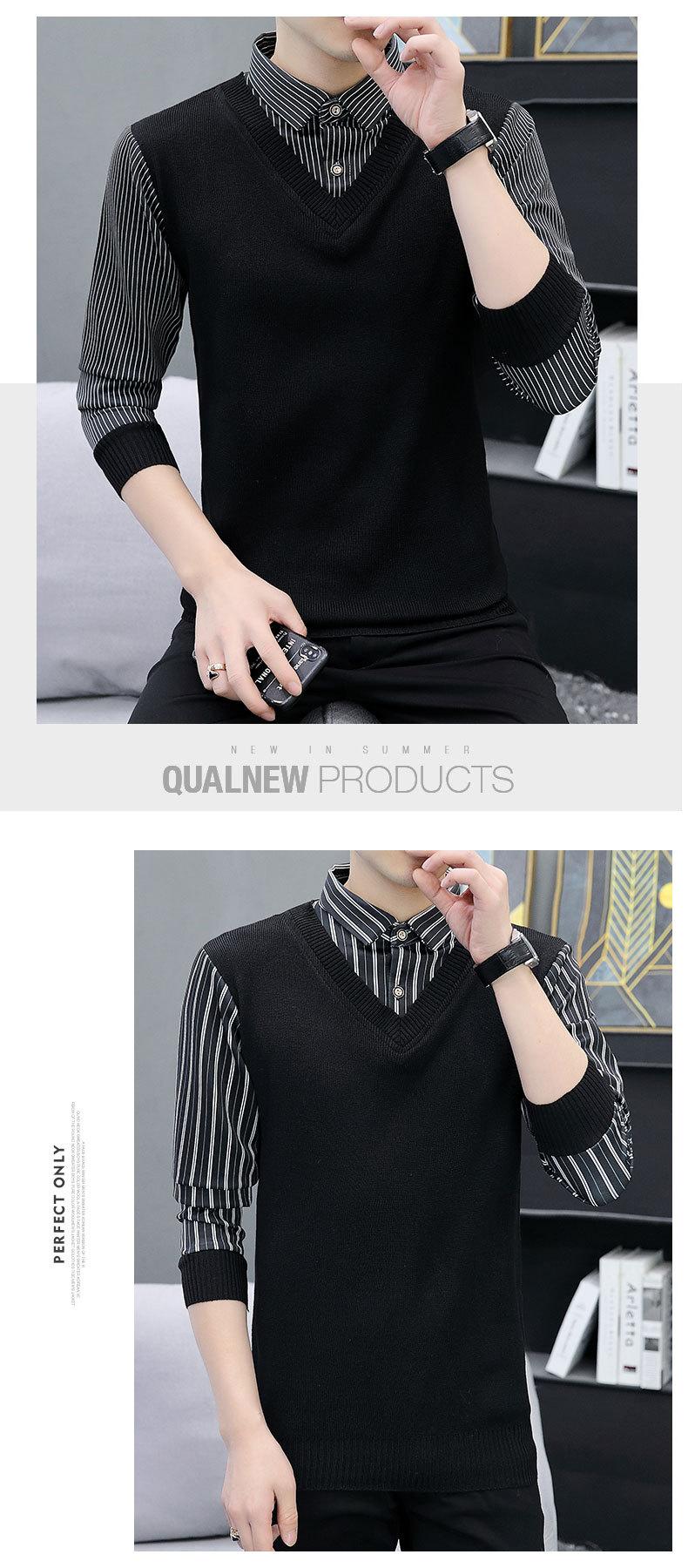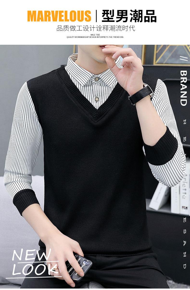 Suéter de Otoño e Invierno de Dos Piezas Falsas para Hombre con Cuello de Camisa, Tejido de Punto de Otoño Moderno, Top Grueso con Forro Polar, Suéter con Cuello en V