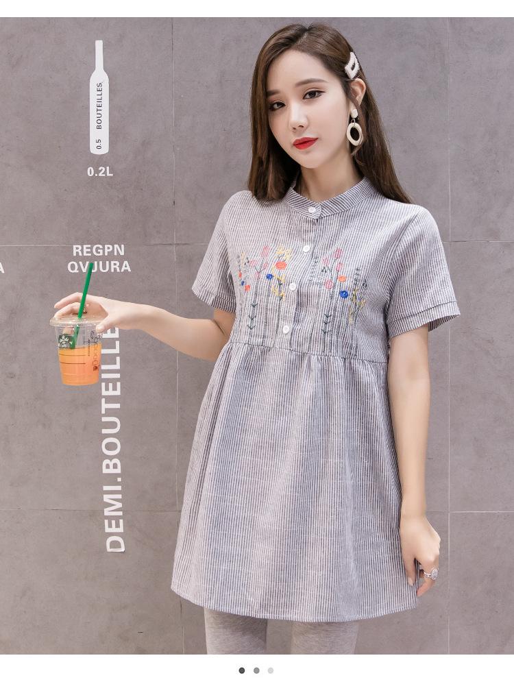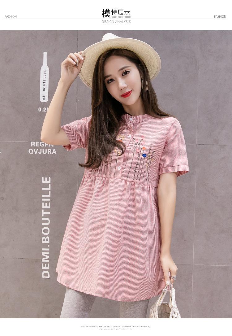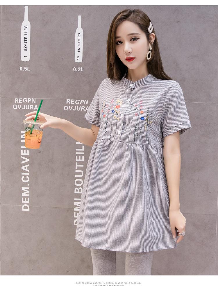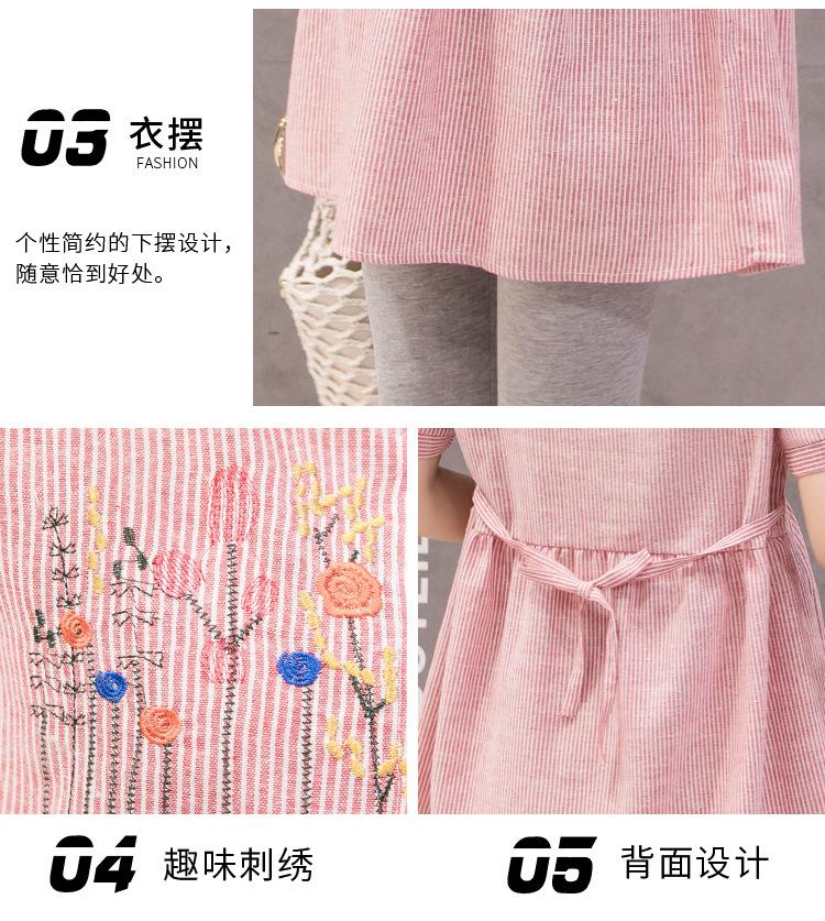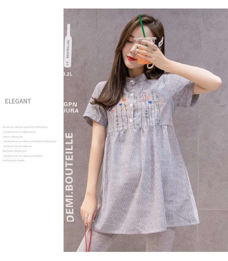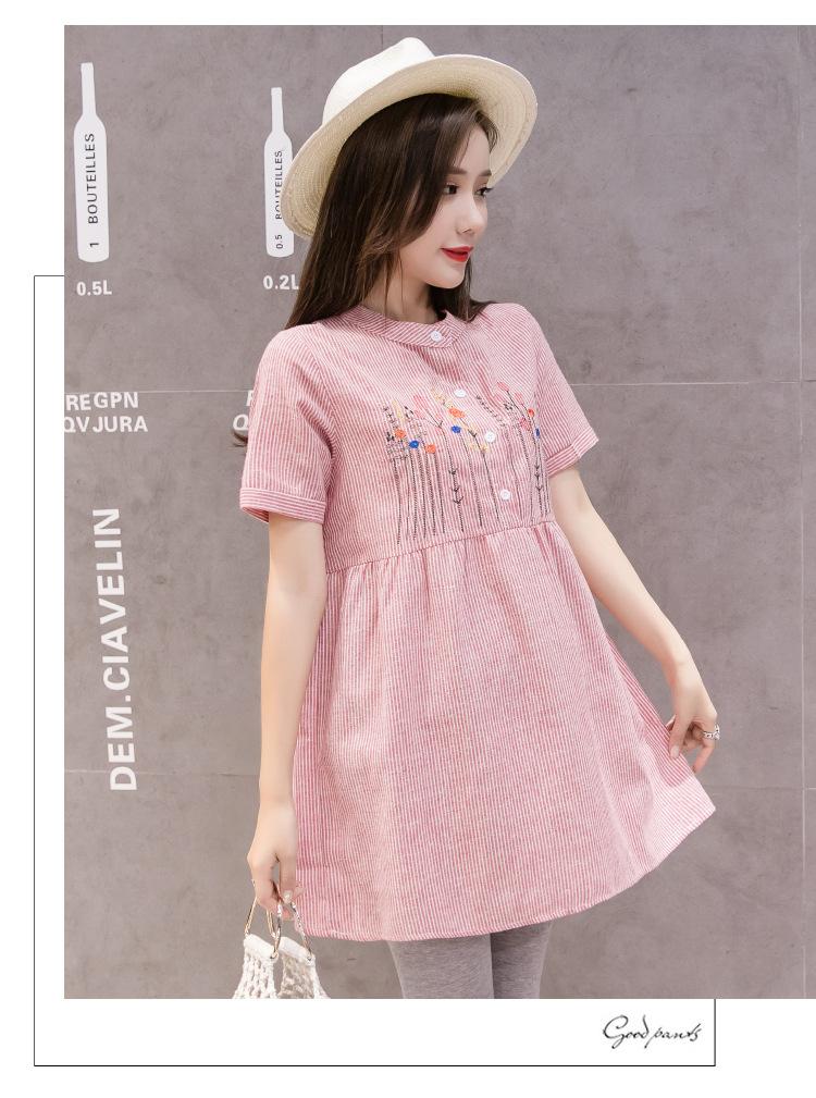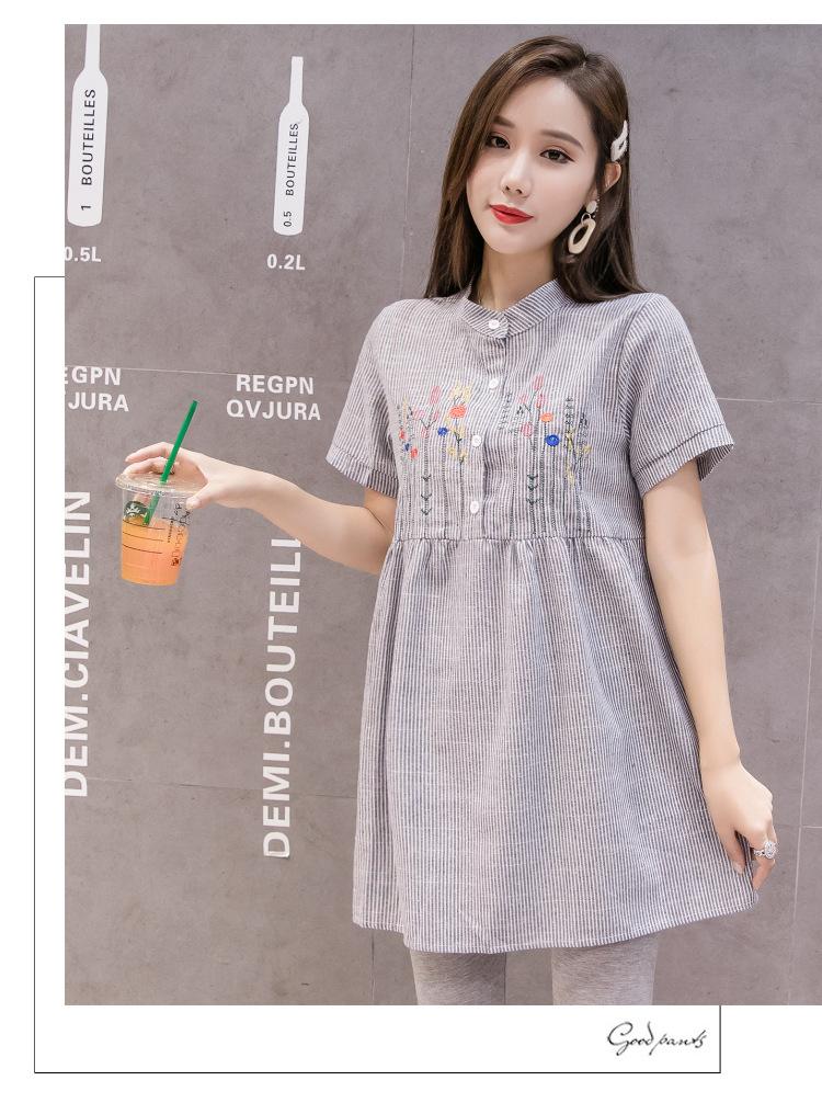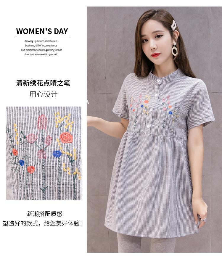 Vestido de maternidad 2024 verano Nuevo Cuello alto Algodón lino media longitud a rayas bordado holgado talla grande vestido para mujeres embarazadas