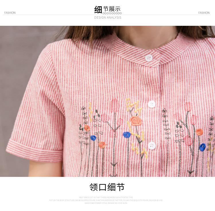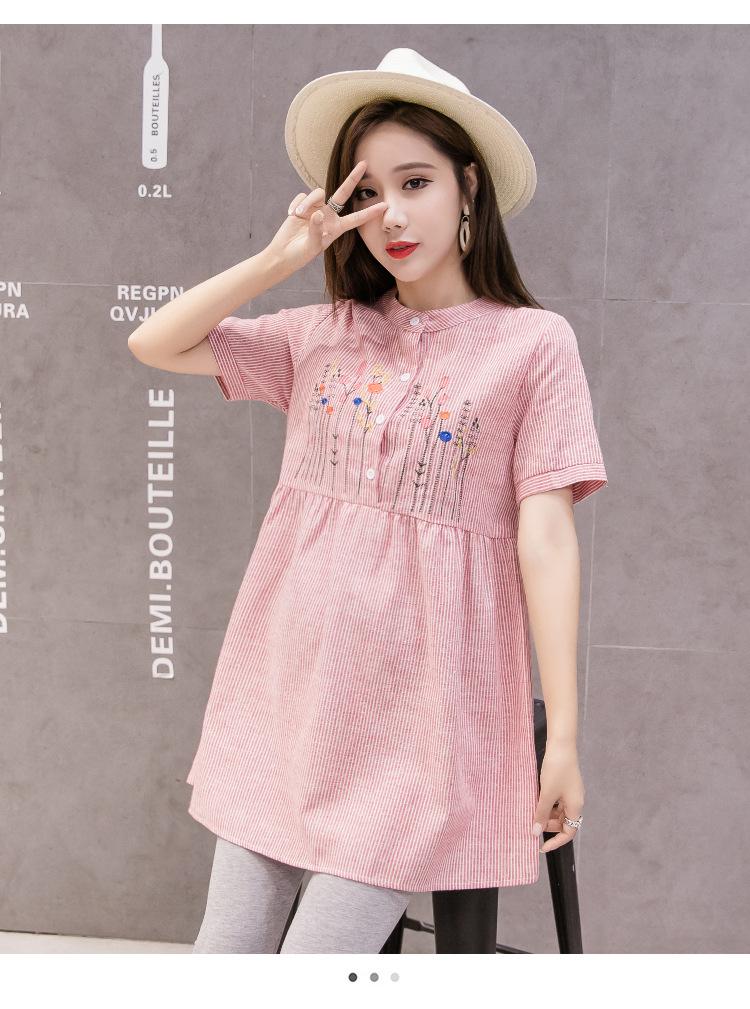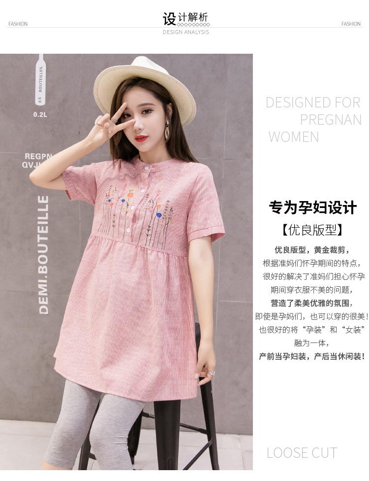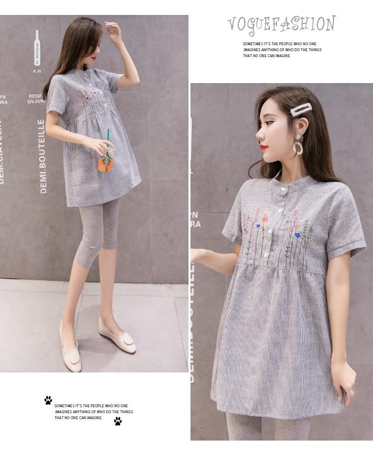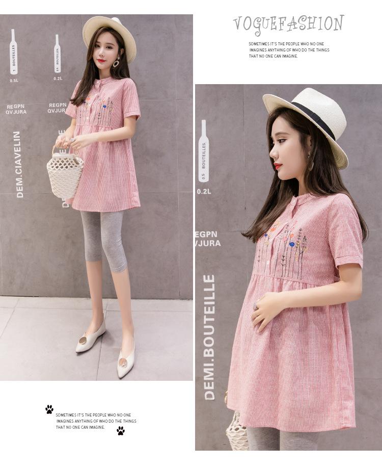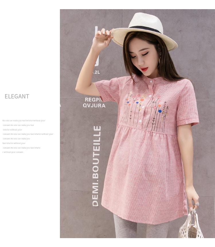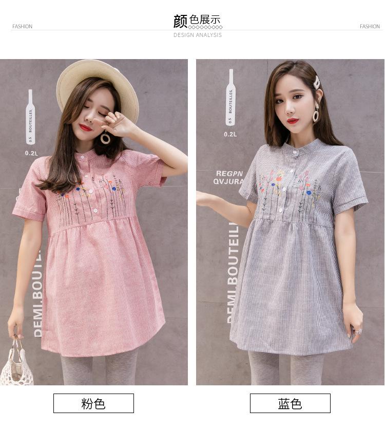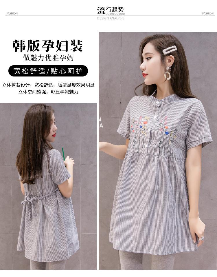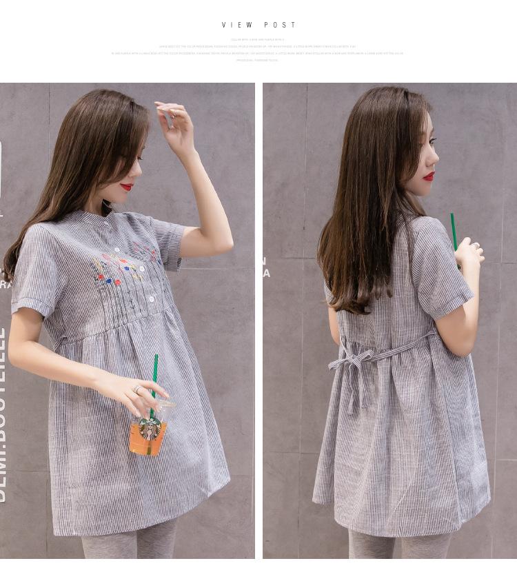 Vestido de maternidad 2024 verano Nuevo Cuello alto Algodón lino media longitud a rayas bordado holgado talla grande vestido para mujeres embarazadas