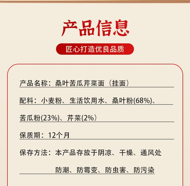 wheat flour, drinking water, mulberry leaf powder (6%), bitter melon powder (2%), celery powder (2%)