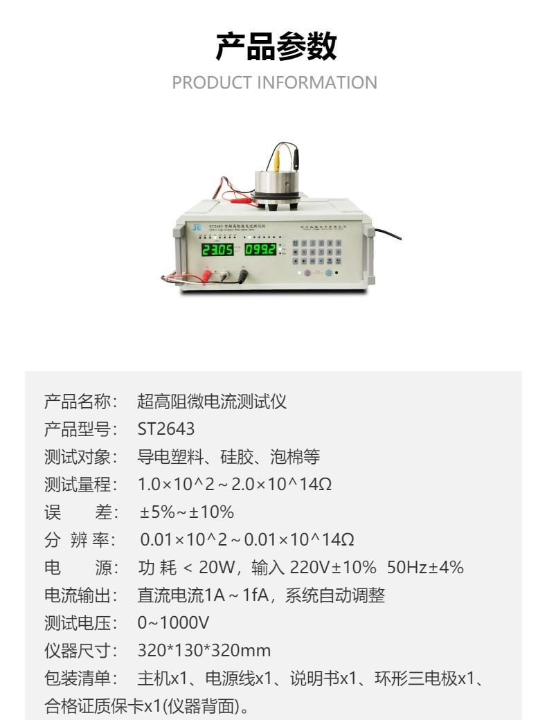 El Modelo ST2643 Probador de Microcorriente de Resistencia Ultraalta (Tipo de Alta Resistencia Probador de Resistividad Volumétrica Resistividad Superficial) es un dispositivo de medición integral versátil que utiliza el principio del método de anillo de tres electrodos para medir la resistividad volumétrica y la resistividad superficial de materiales sólidos en forma de lámina y tipo película, antiestáticos y materiales aislantes. También se puede utilizar como un medidor de resistencia ultraalta o probador de microcorriente. El diseño del instrumento cumple con la norma nacional GB/T 1410-2006/IEC 60093:1980: 《Métodos de Prueba para la Resistividad Volumétrica y la Resistividad Superficial de Materiales Aislantes Sólidos》.