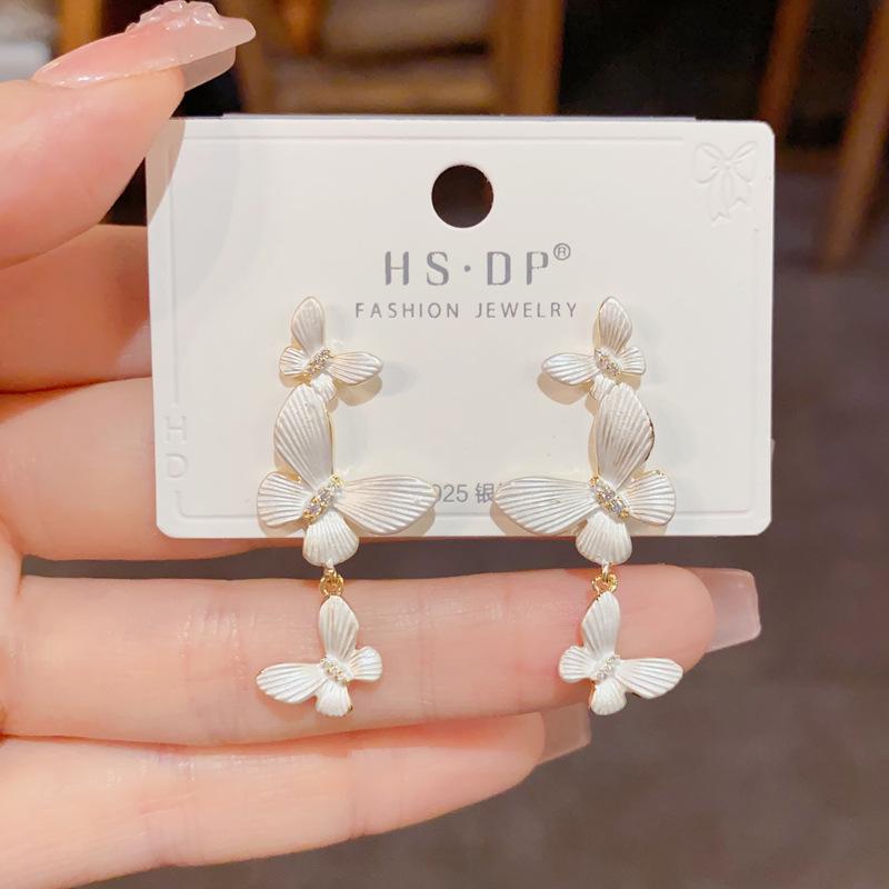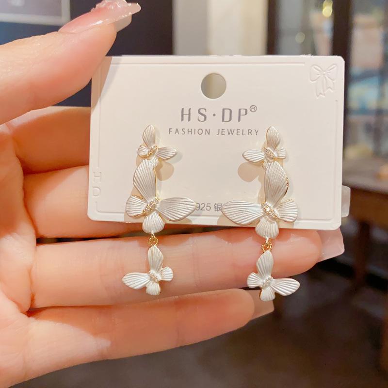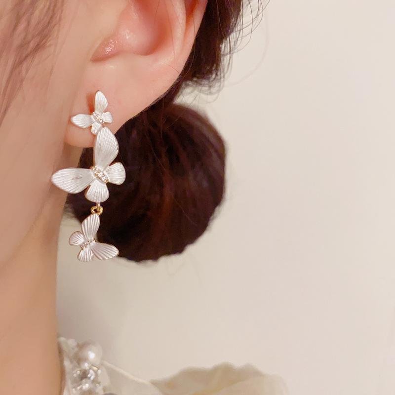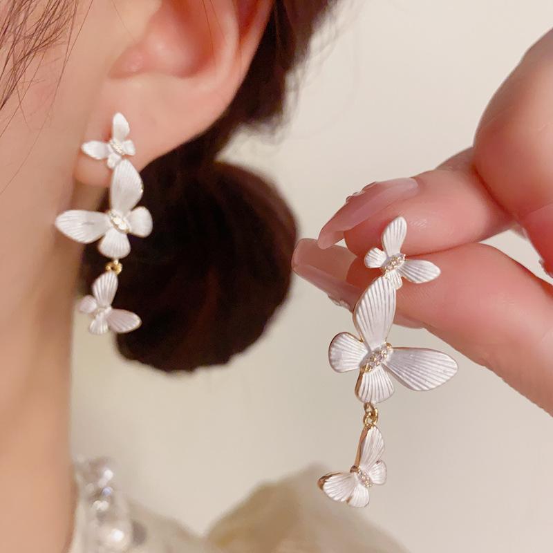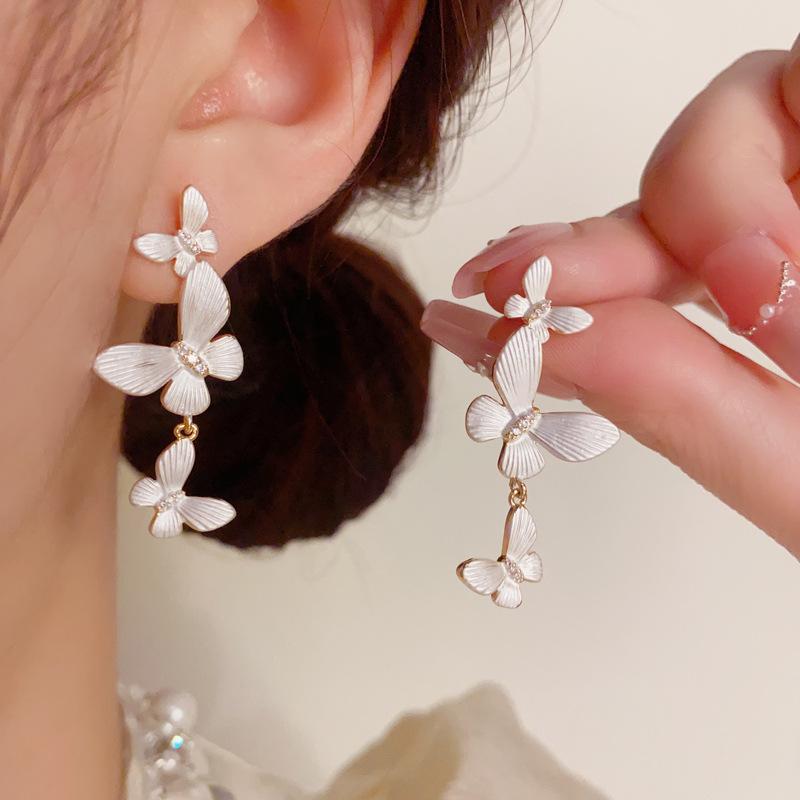 Three-dimensional white butterfly tassel earrings (thick real gold plating)