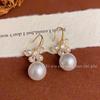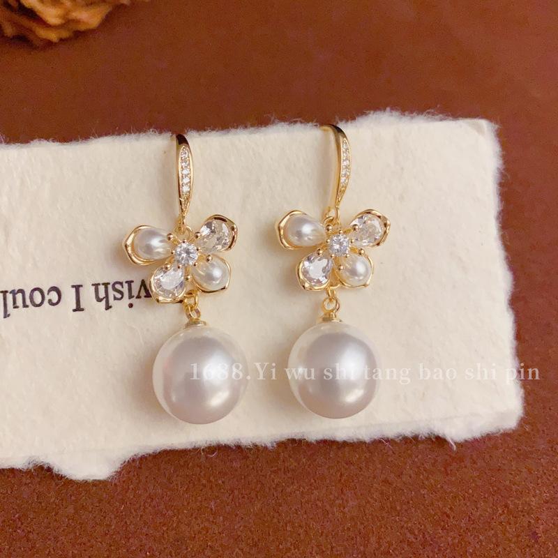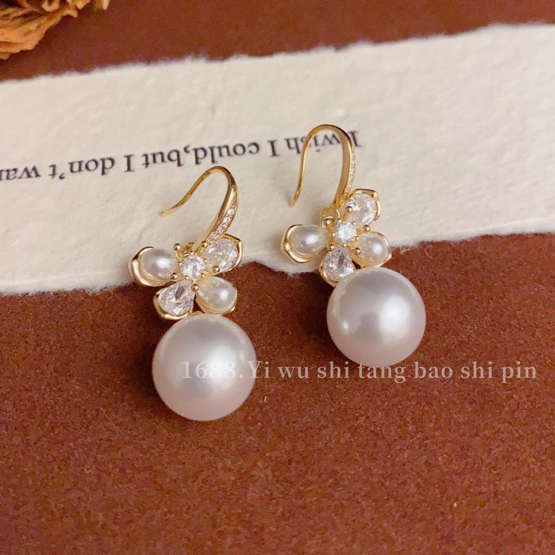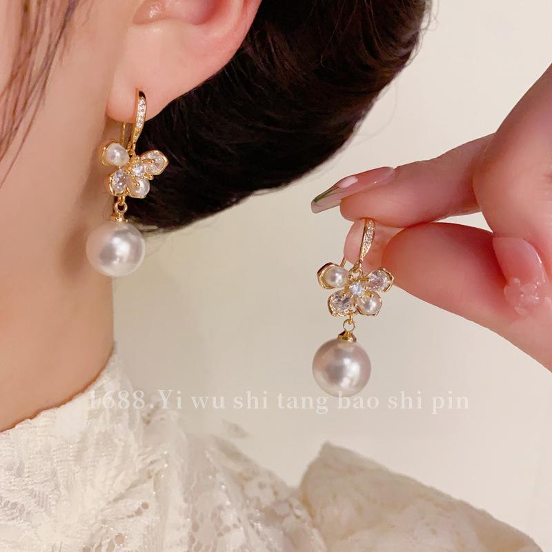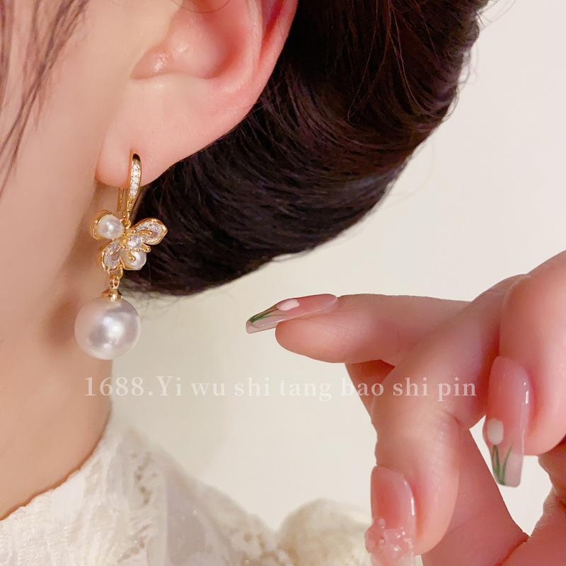 Primavera Nueva Moda Suave Versátil Aretes de Mariposa de Perlas Incrustados con Diamantes Personalizado Lujo Ligero Gama Alta Ganchos para Oreja Pétalos Femeninos