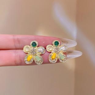 Aretes Retro Coloridos de Flor con Pedrería para Mujer Lujo Ligero Nicho Temperamento Sensación de Alta Gama Personalidad Aretes Versátil Moda Joyería para la Oreja