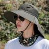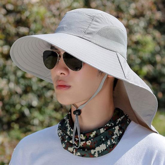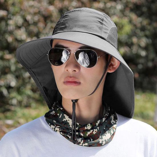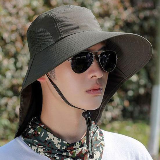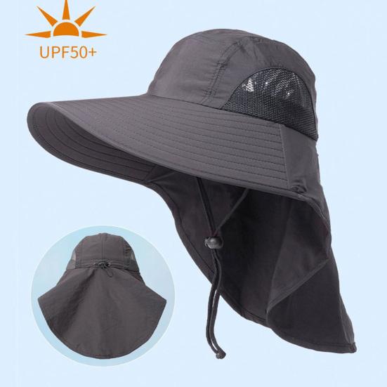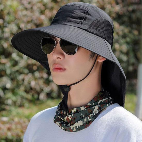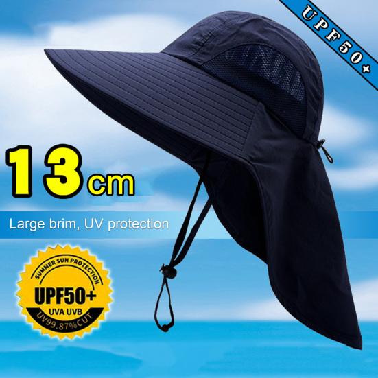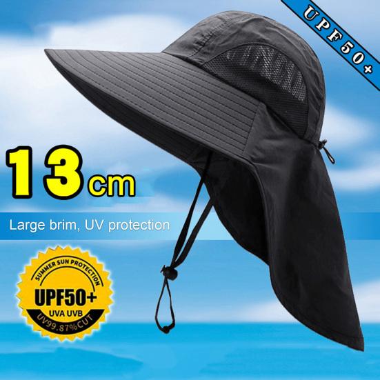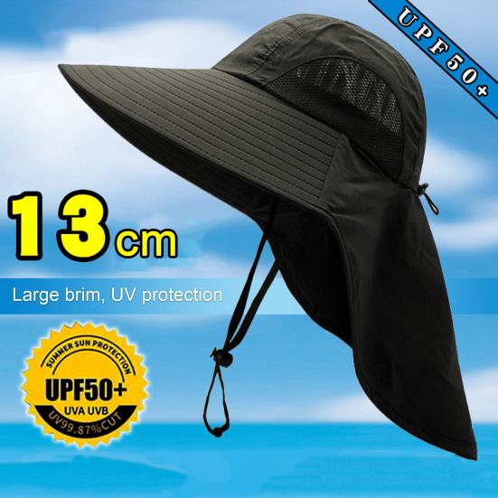 Mantente elegante y protegido del sol con este sombrero para el sol de poliéster de alta calidad.. El ala grande de 13 cm y el chal de 30 cm brindan una excelente cobertura para tu rostro y cuello, bloqueando los dañinos rayos UV durante las actividades al aire libre.. Los paneles laterales de malla transpirable mejoran la circulación del aire, ayudando a mantenerte fresco y a reducir la sudoración incluso en días calurosos.