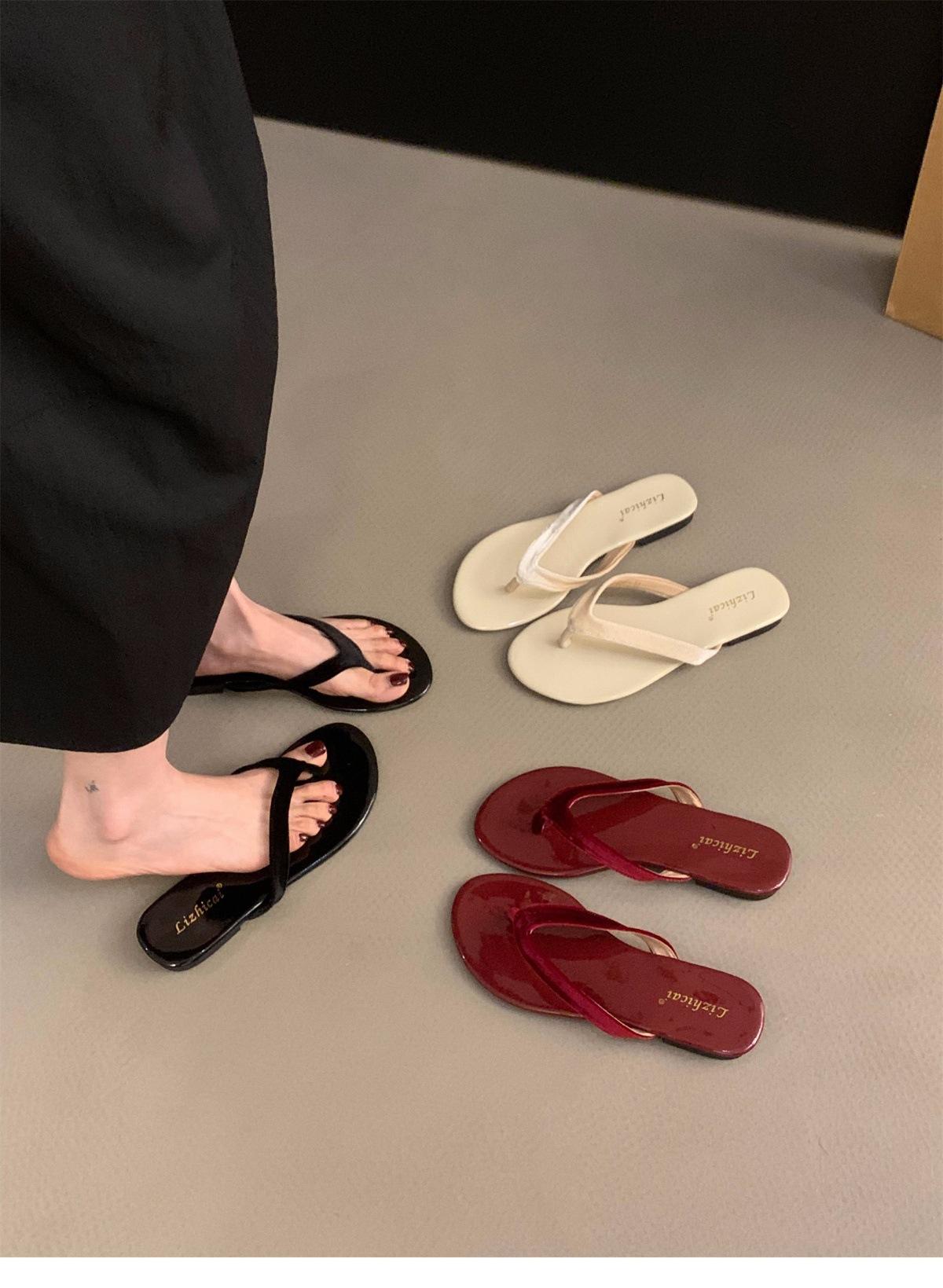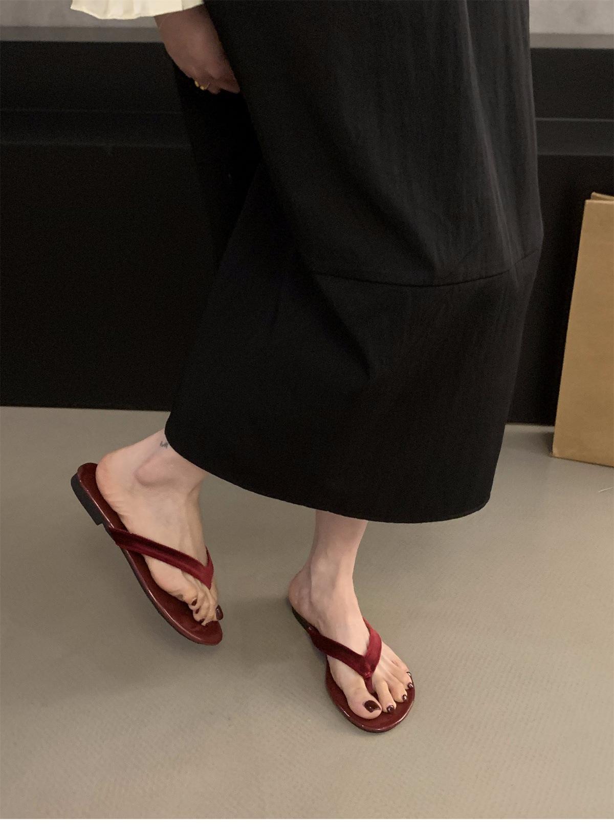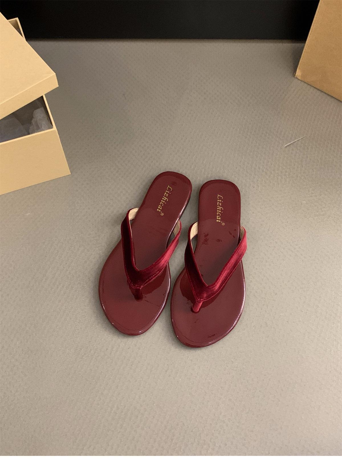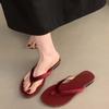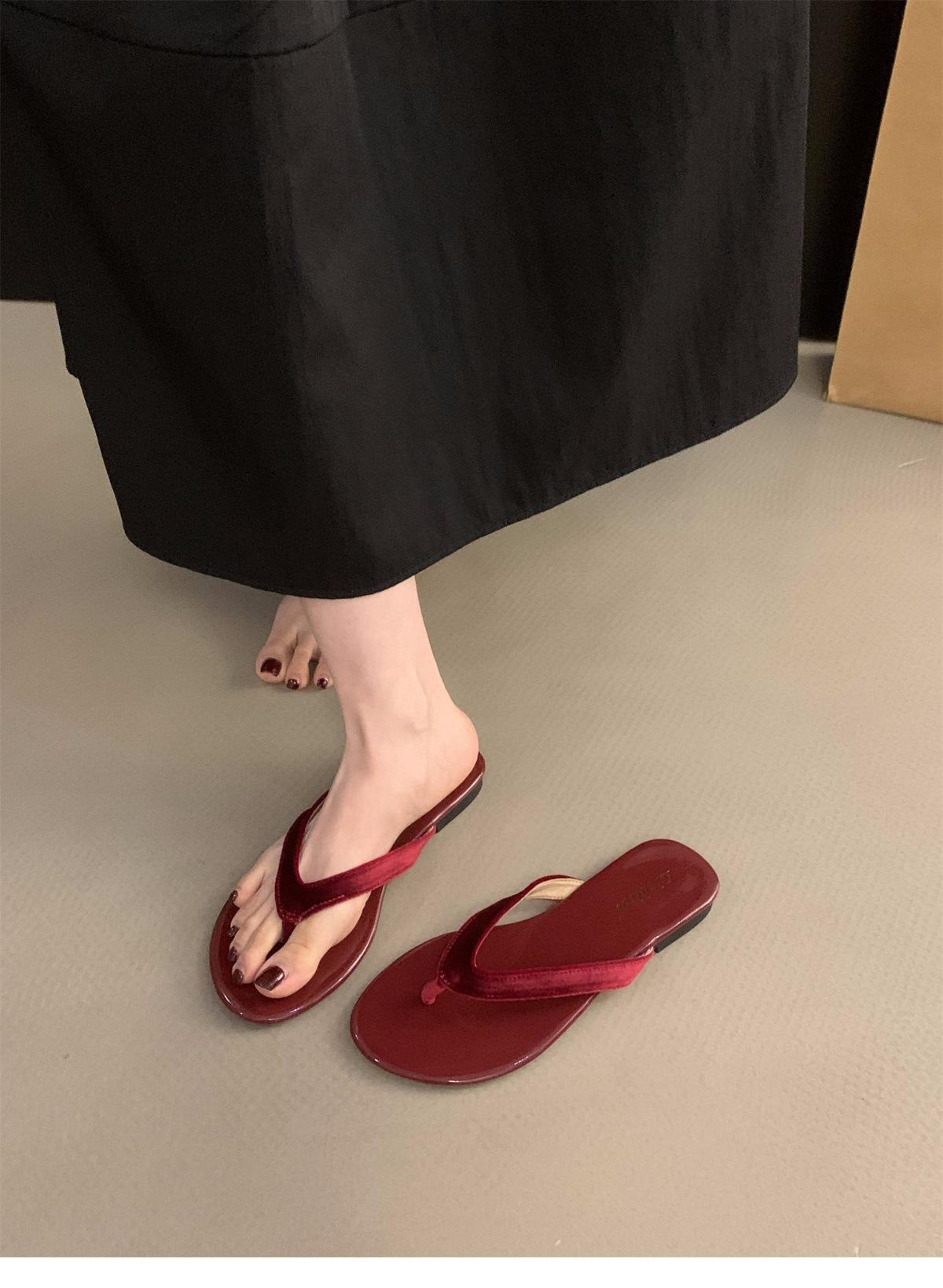 Sandalias planas rojas estilo francés pequeñas Zapatos de mujer Ropa exterior 2025 Nuevo estilo Verano Casual Suela suave Chanclas de clip