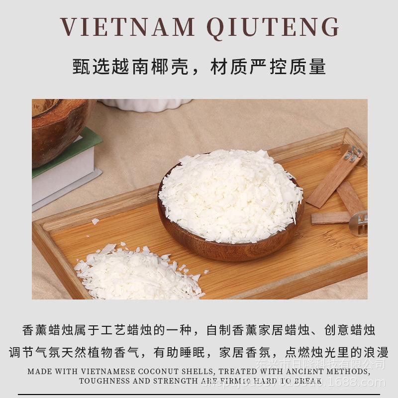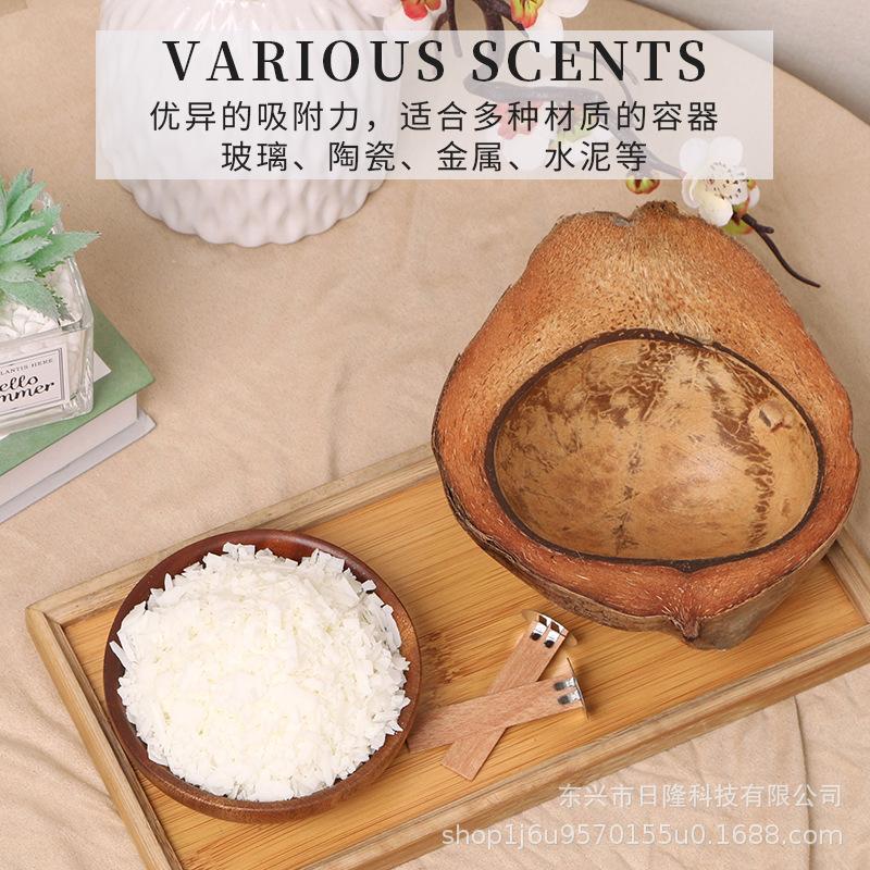 Wooden chip 0.6cm (1 piece with base), Soy wax (250g), Essence 3ml (note fragrance when ordering), Coconut shell with leather