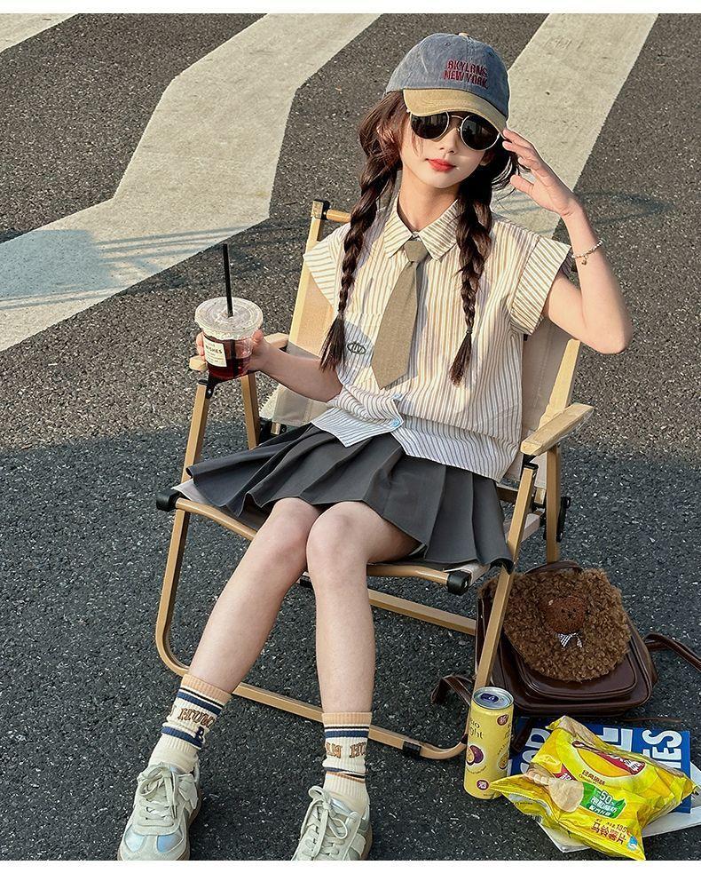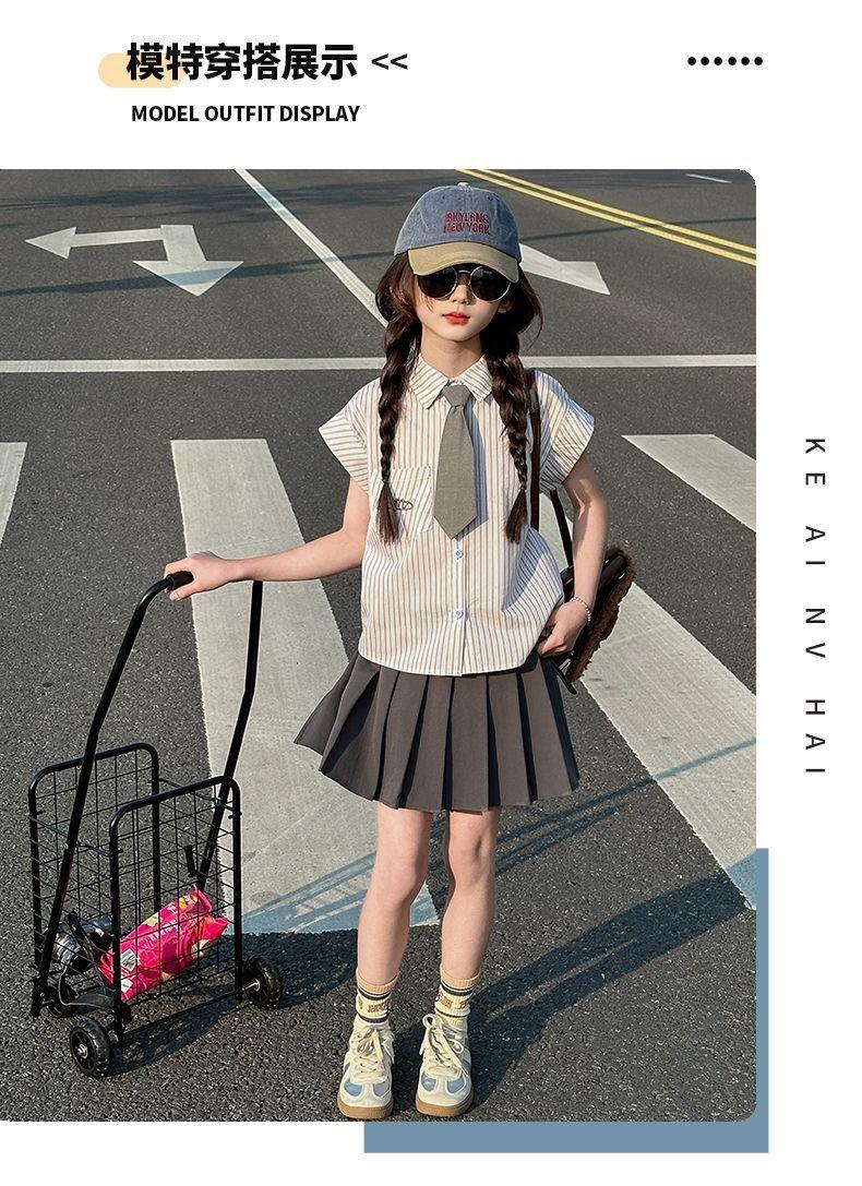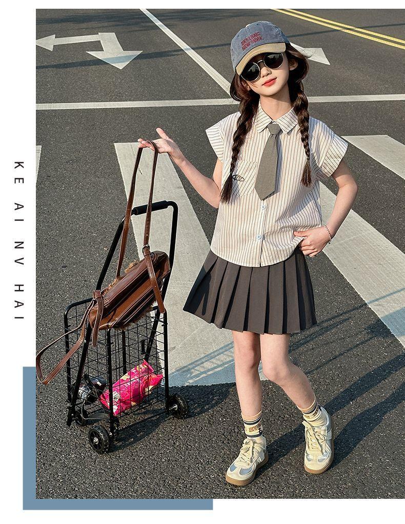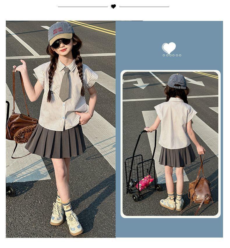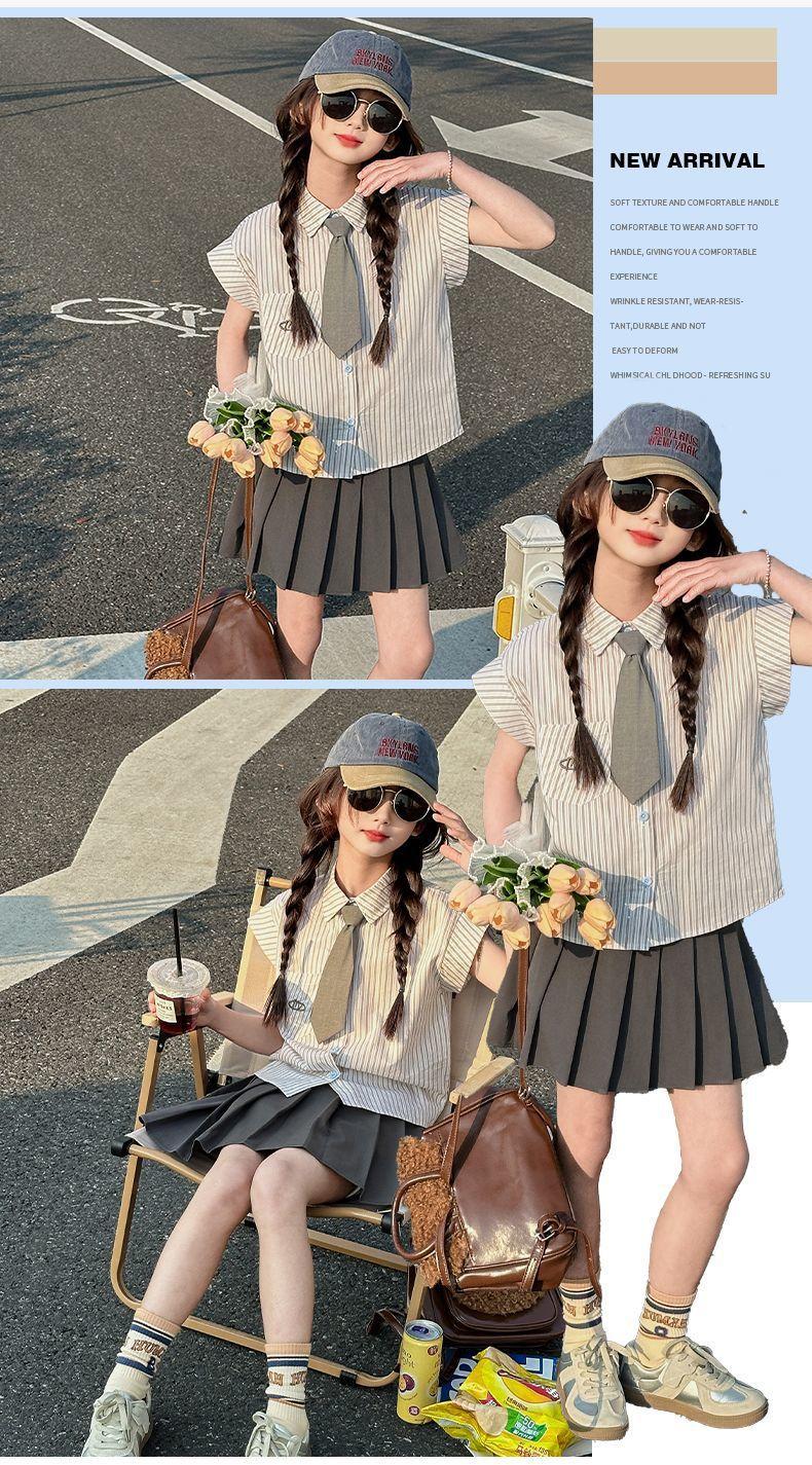 Conjunto de dos piezas de traje JK para niñas medianas y grandes 2025 Verano Nuevo estilo Camisa de manga corta a rayas para niñas Falda plisada para niños