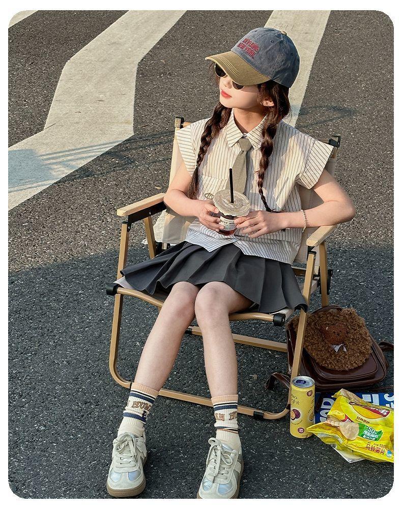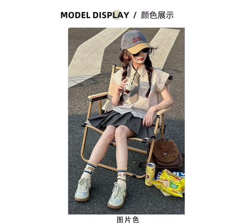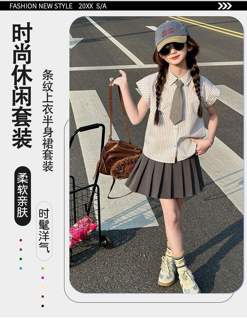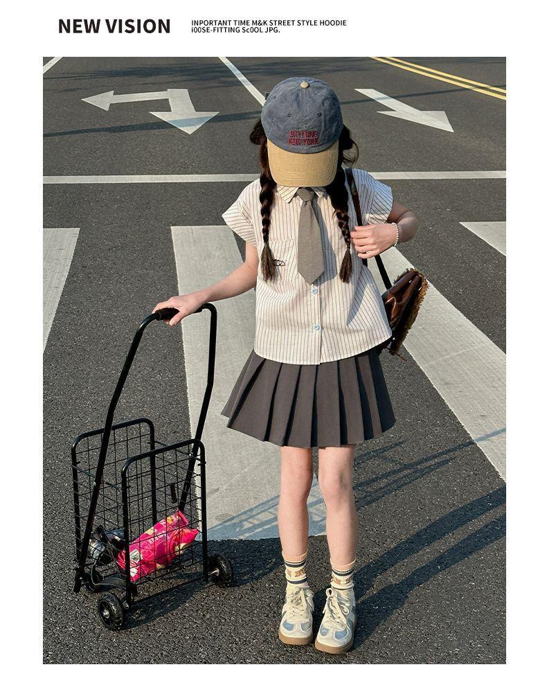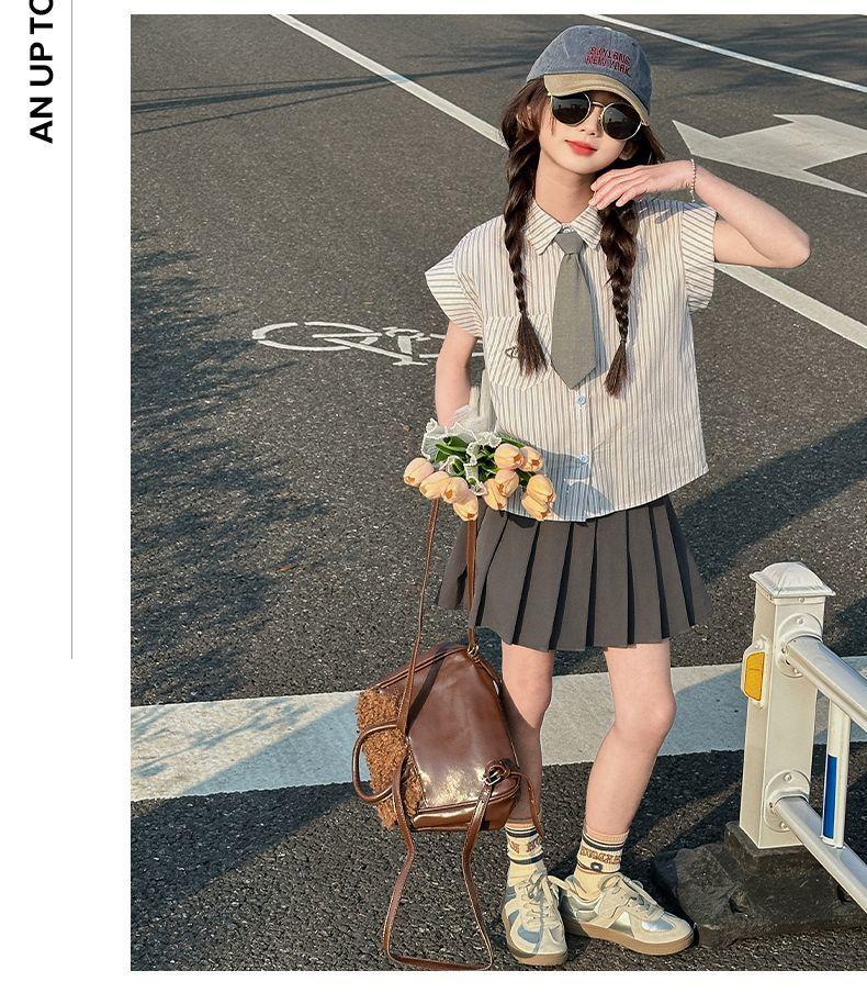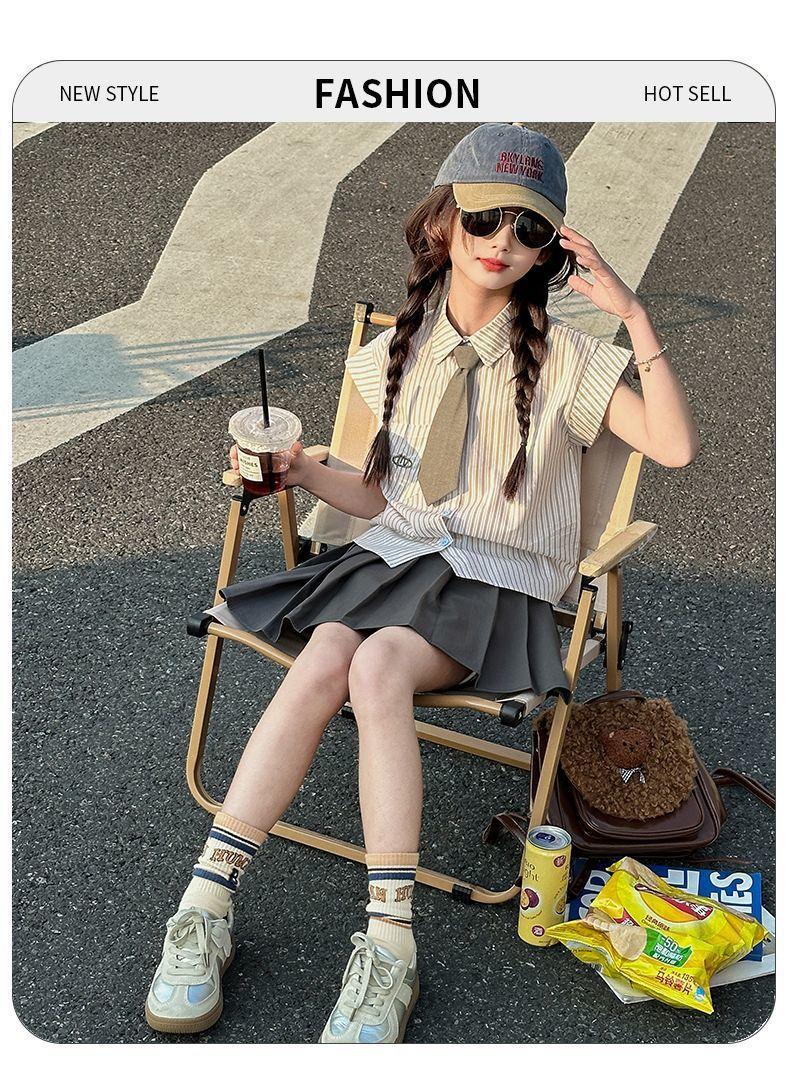 Conjunto de dos piezas de traje JK para niñas medianas y grandes 2025 Verano Nuevo estilo Camisa de manga corta a rayas para niñas Falda plisada para niños