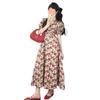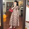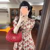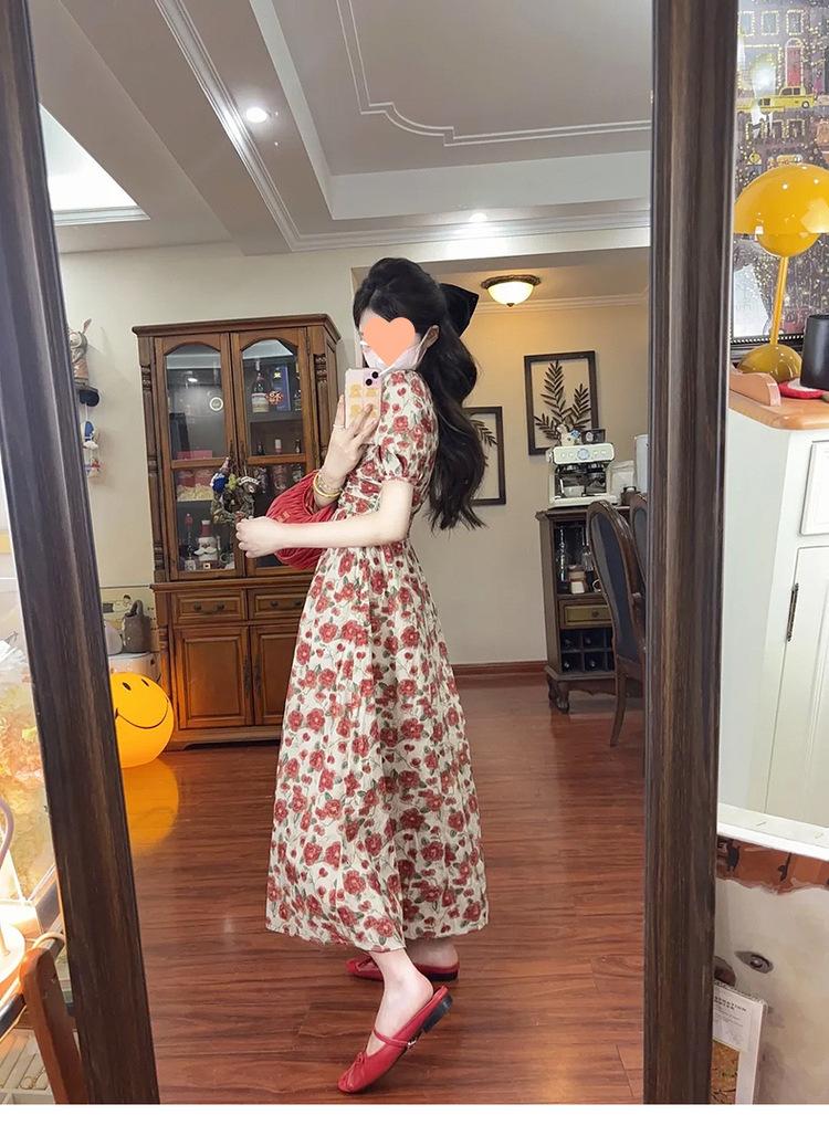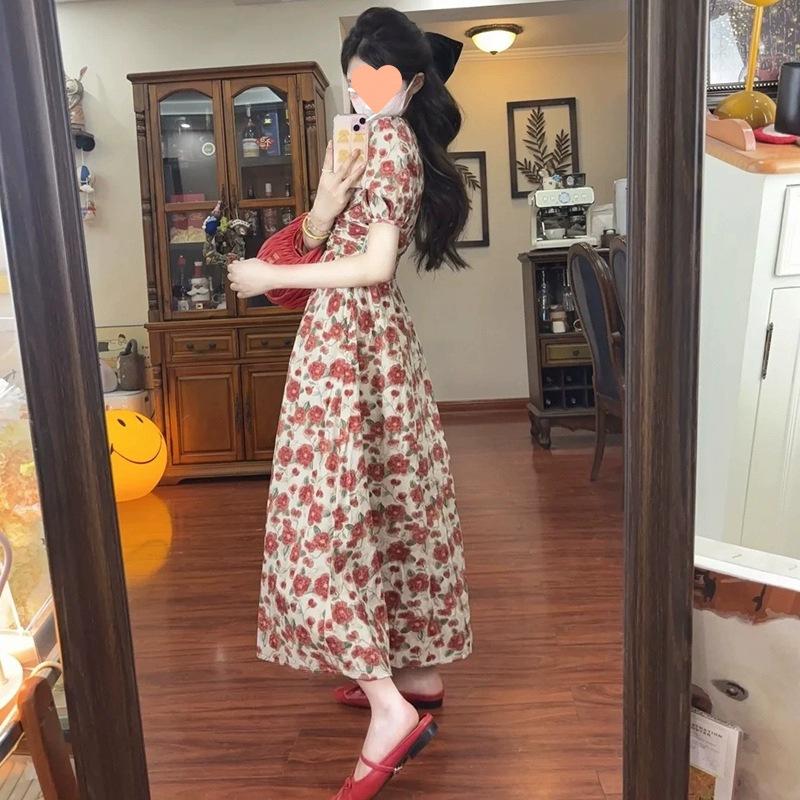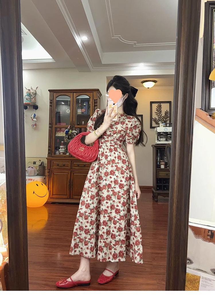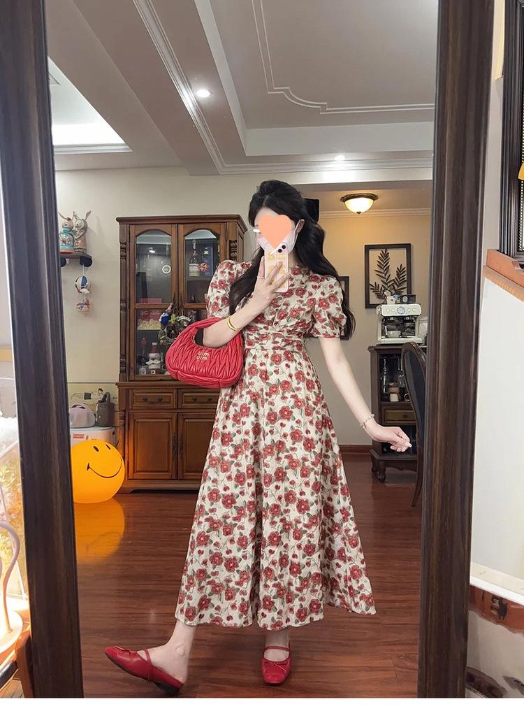Vestido Floral Rojo de Verano para Mujer 2025 Nuevo Cintura Falda Larga Hora del Té Estilo Francés Estilo de Alta Gama