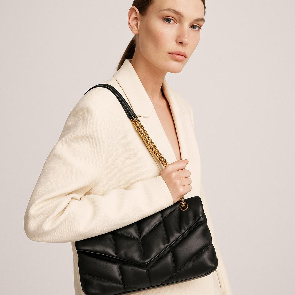 Bolso de Hombro de Piel de Vacuno de Primera Capa para Mujer, Clásico Acolchado en Forma de V, Correa de Hombro de Cadena Metálica, Moderno y Elegante, Ropa de Trabajo Diario