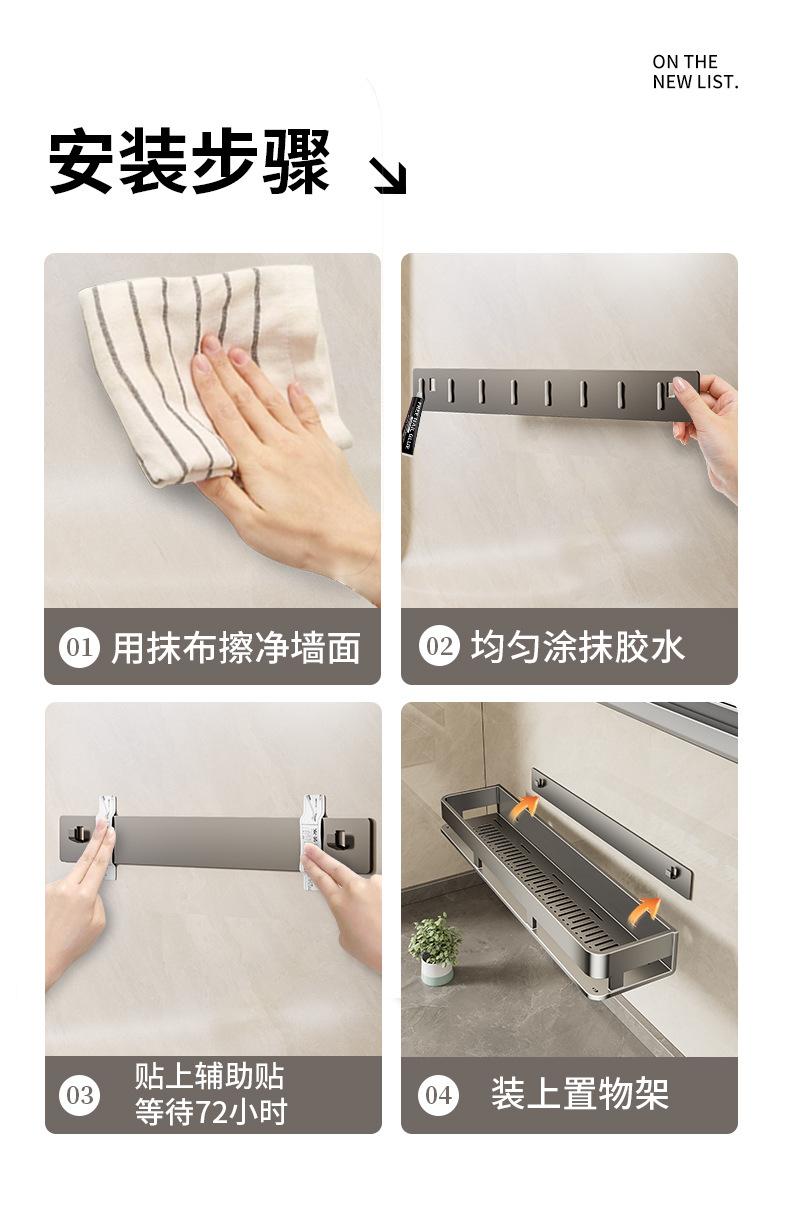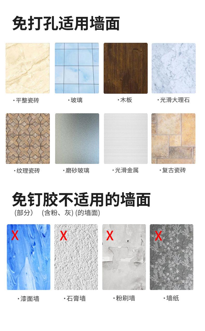 (2) Antes de la instalación, tenga en cuenta que la superficie de la pared debe ser plana y sólida, como azulejos de vidrio.No disponible enEn paredes irregulares e inestables como paredes pintadas, papel tapiz, paredes de cal, etc. Después de aplicar el pegamento en la pared, debe esperar de 3 a 5 días para que el pegamento sin clavos se seque completamente antes de usarlo.
