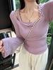 Suéter de Verano 2024 de Un Hombro a Rayas Delgado Retro Cintura Temperamento Diseño Slim Nicho Manga Corta Mujer