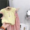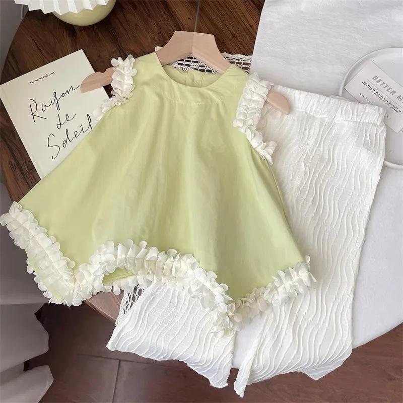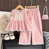Conjunto de verano elegante para niñas 2025: Top de encaje irregular a la moda y pantalones de pierna ancha para bebés.