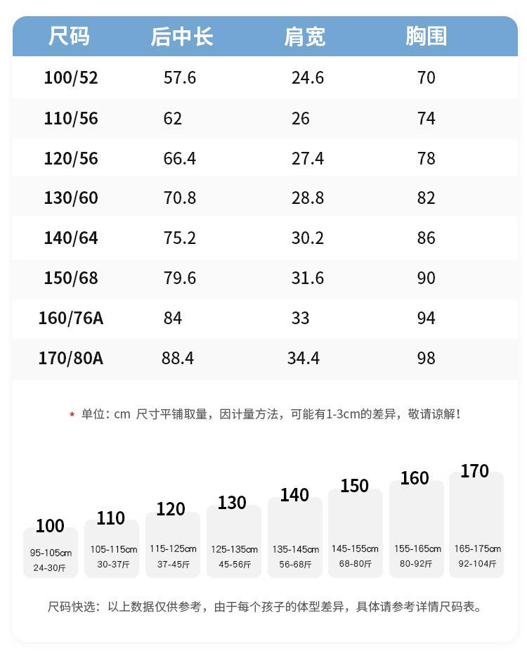 Recommended height for size 100 is 95-105cm, Size 110 recommended height 105-115cm, Size 120 recommended heigh...